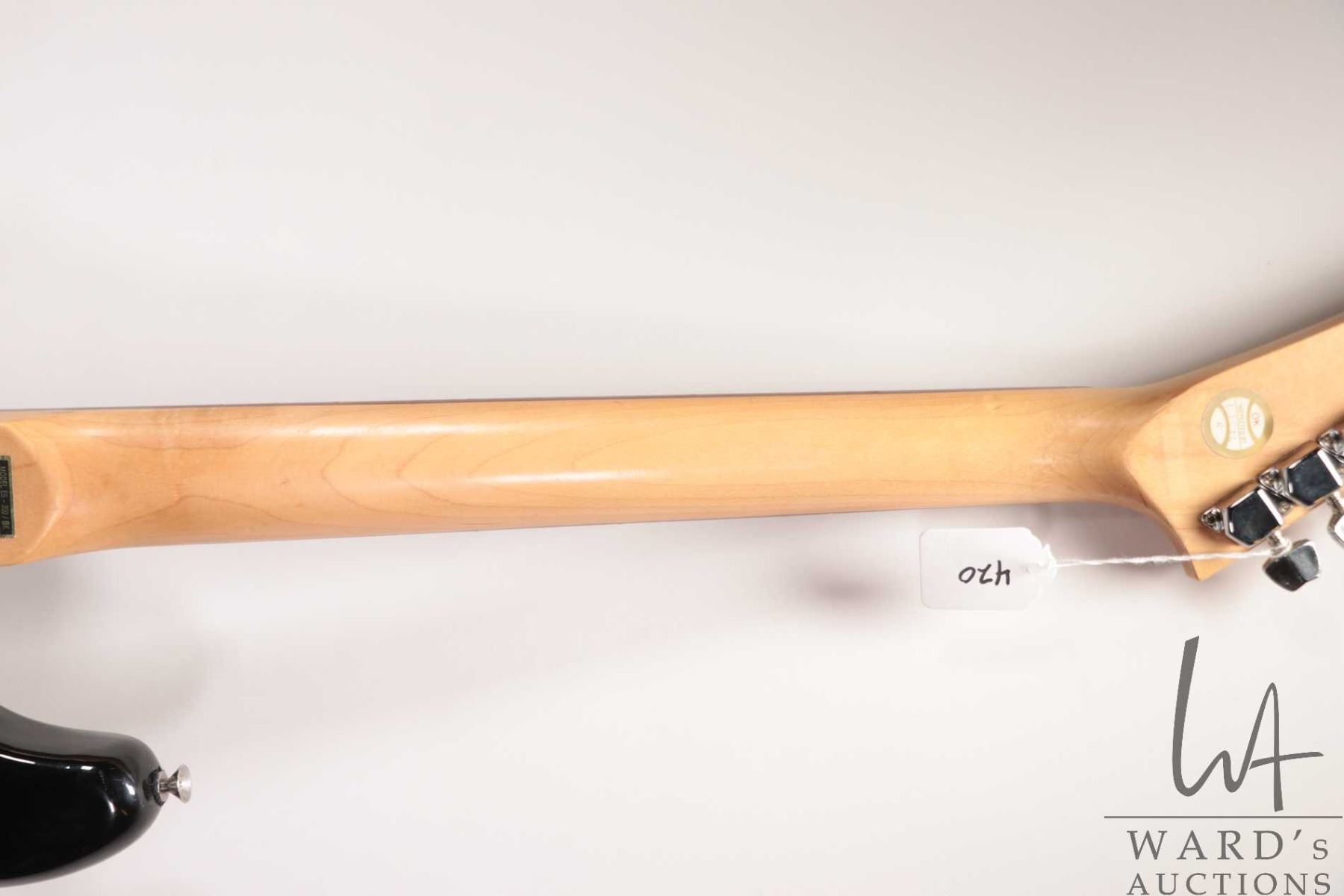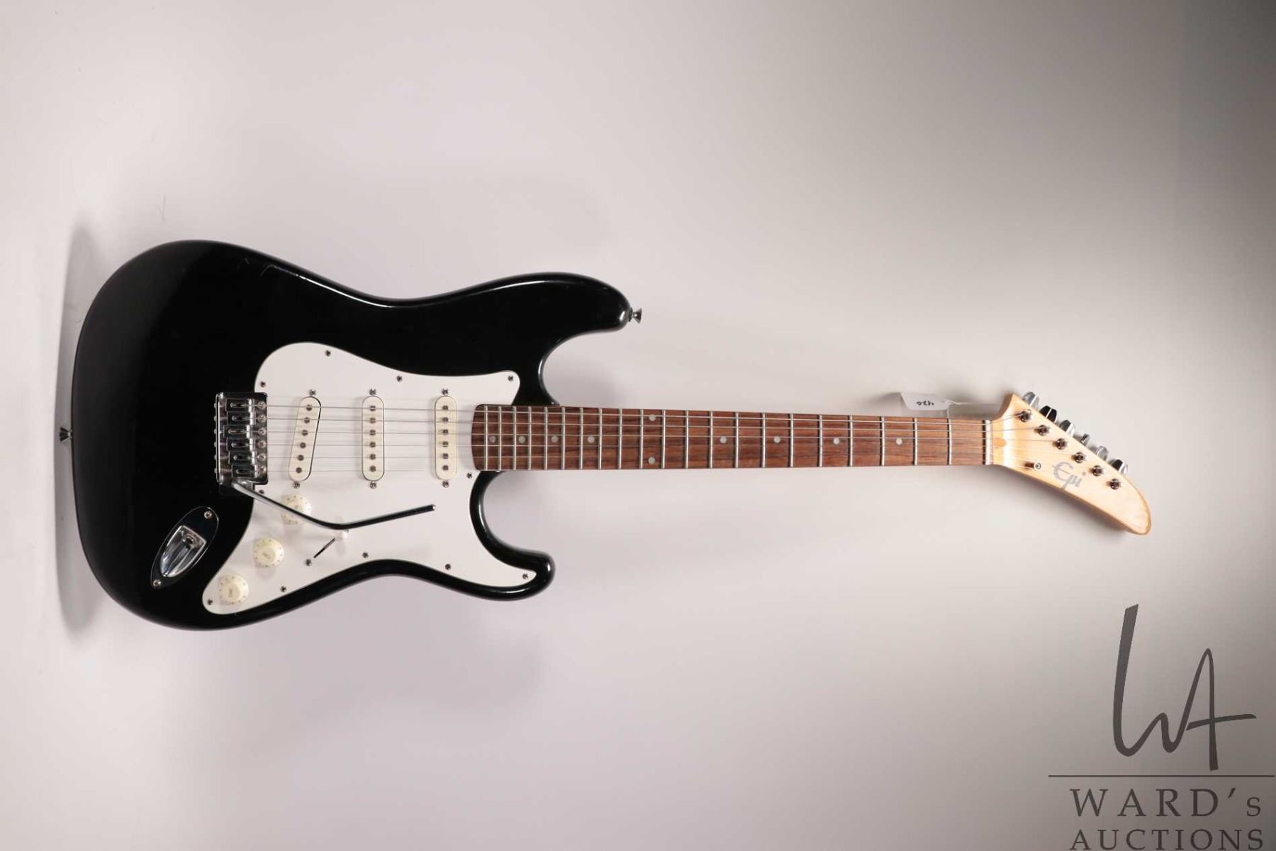 Epiphone ES-300 in midnight black, vintage stratocaster, hockey stick headstock with Tremolo arm, SS pickup configuration, five way switch, three control. Includes PRS luxury backpack style soft case