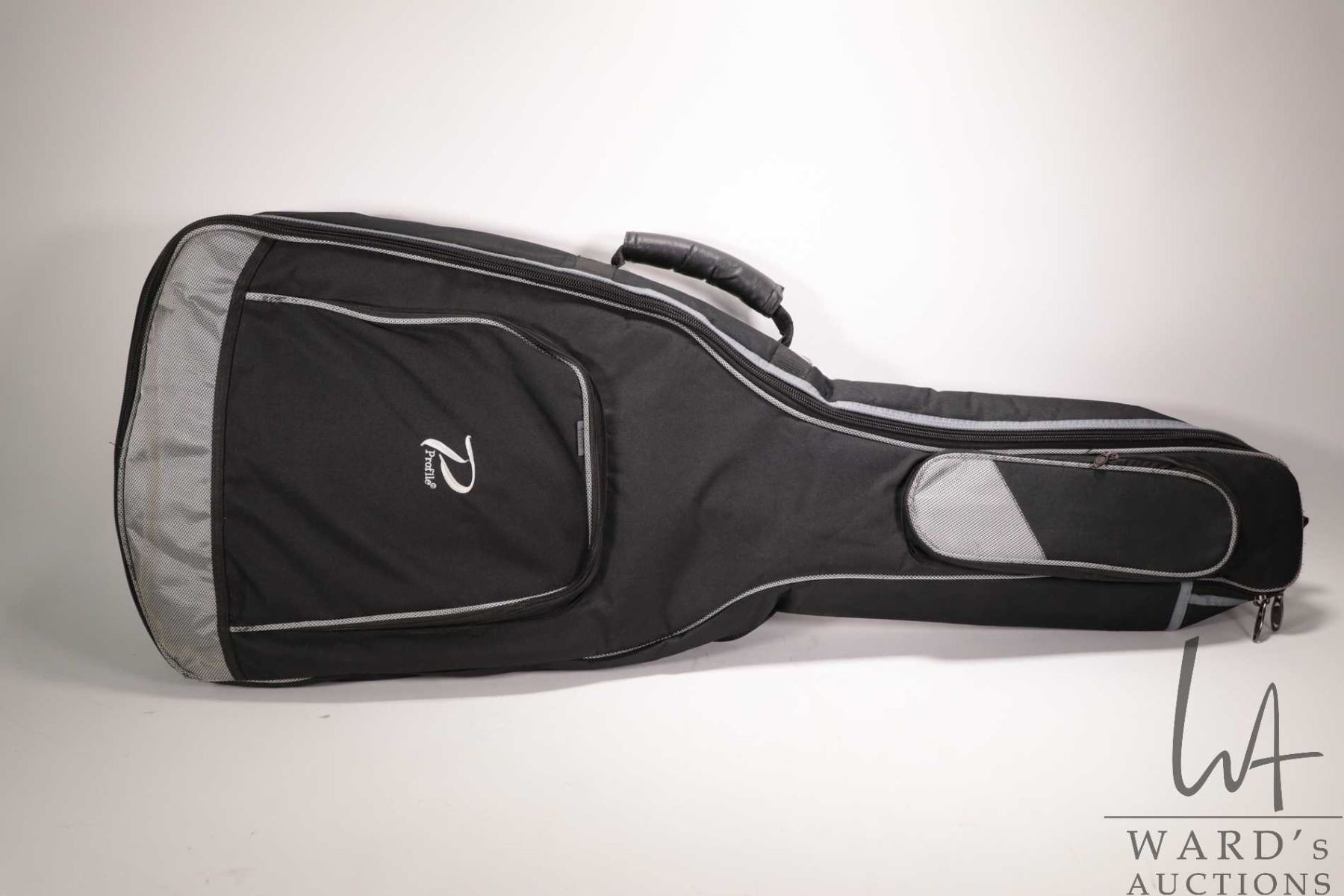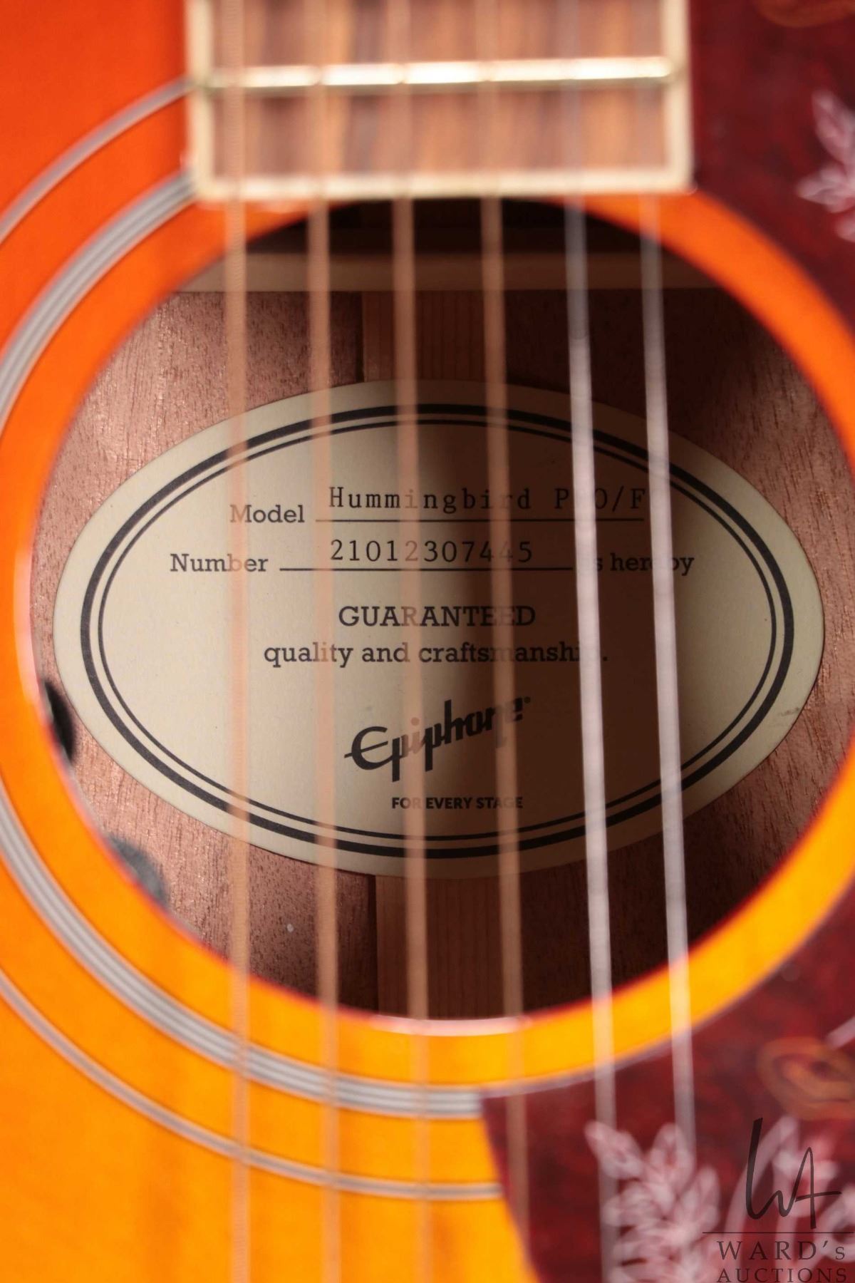 Epiphone Hummingbird Pro/ FC with decorative pick guard and ribbon grain mahogany back, Grover tuners with inlay fret board, serial no 2012307445. Includes Profile pocketed case, padded with handle and backpack straps plus hanging tab