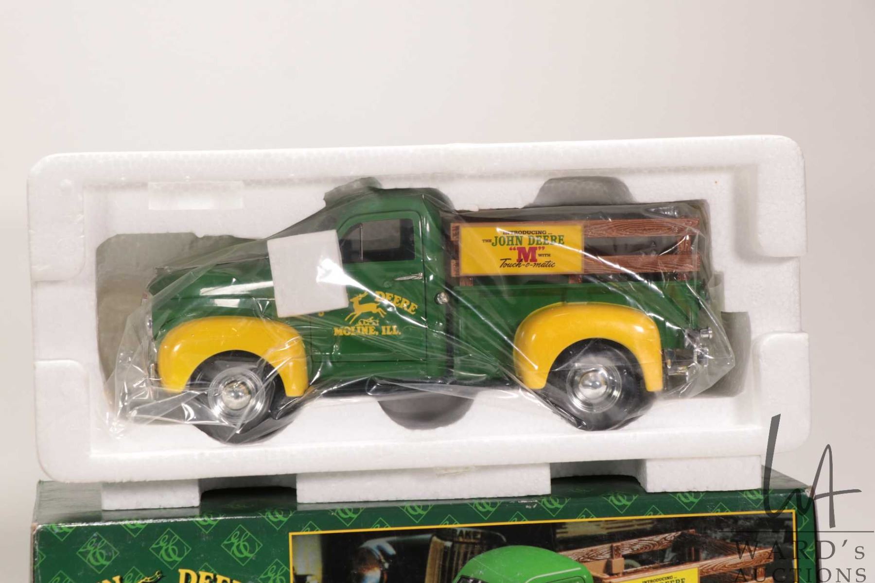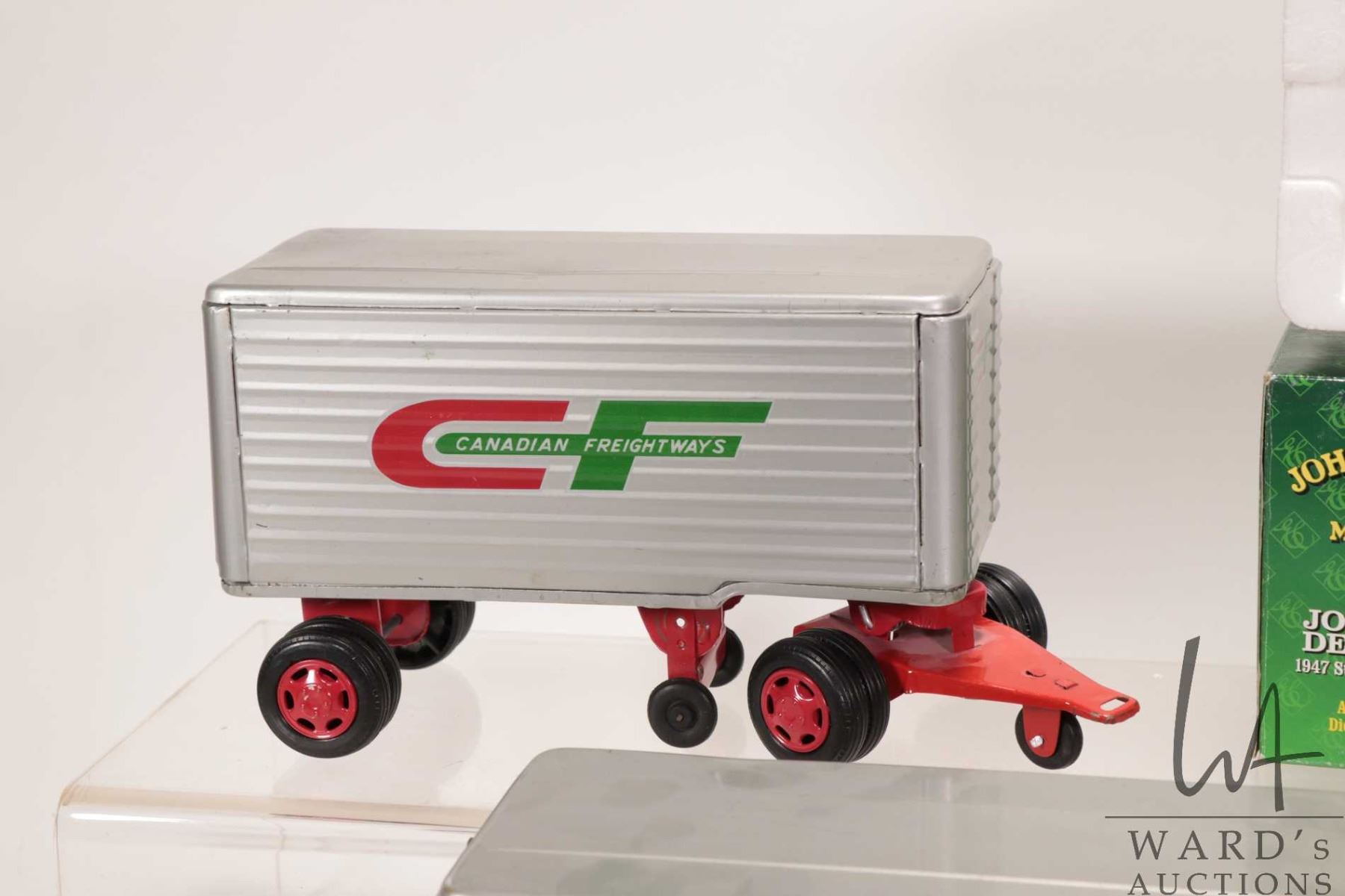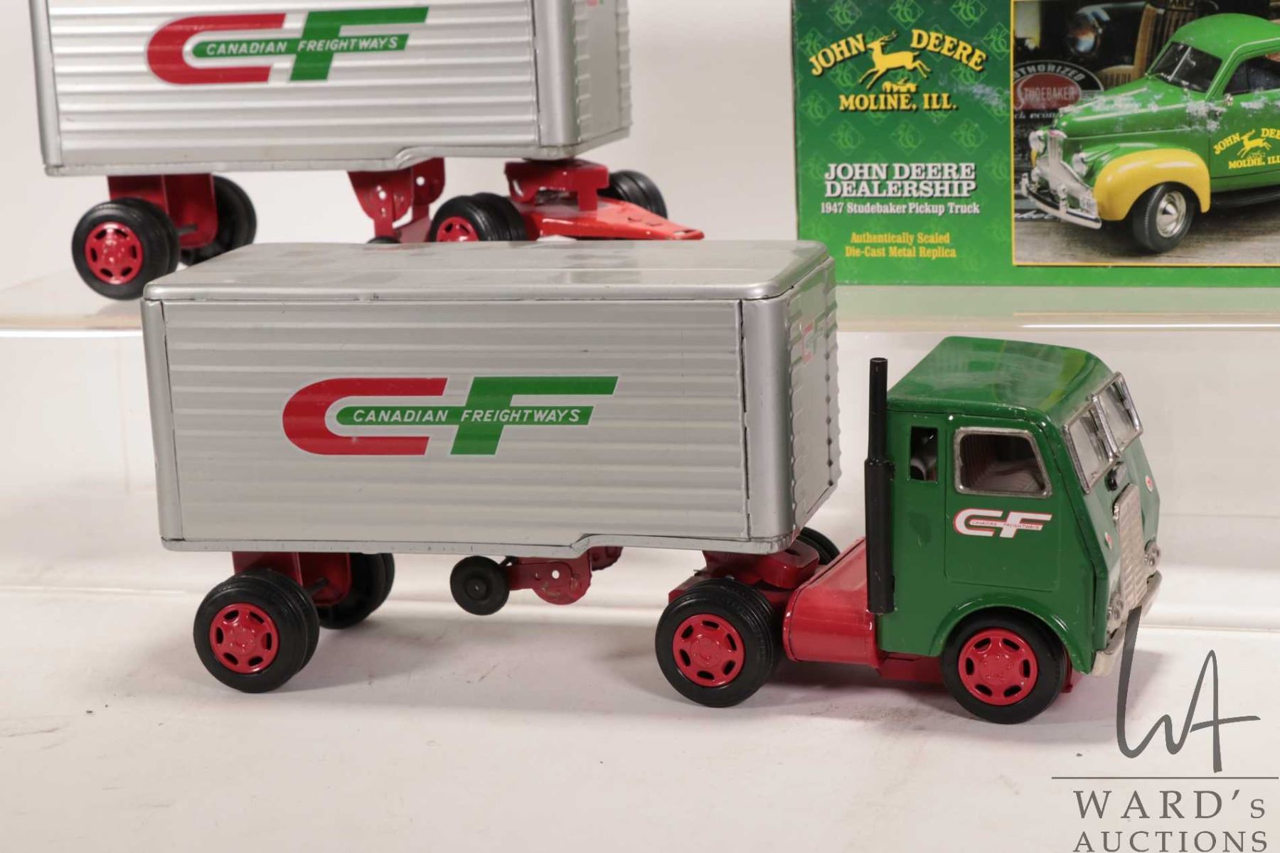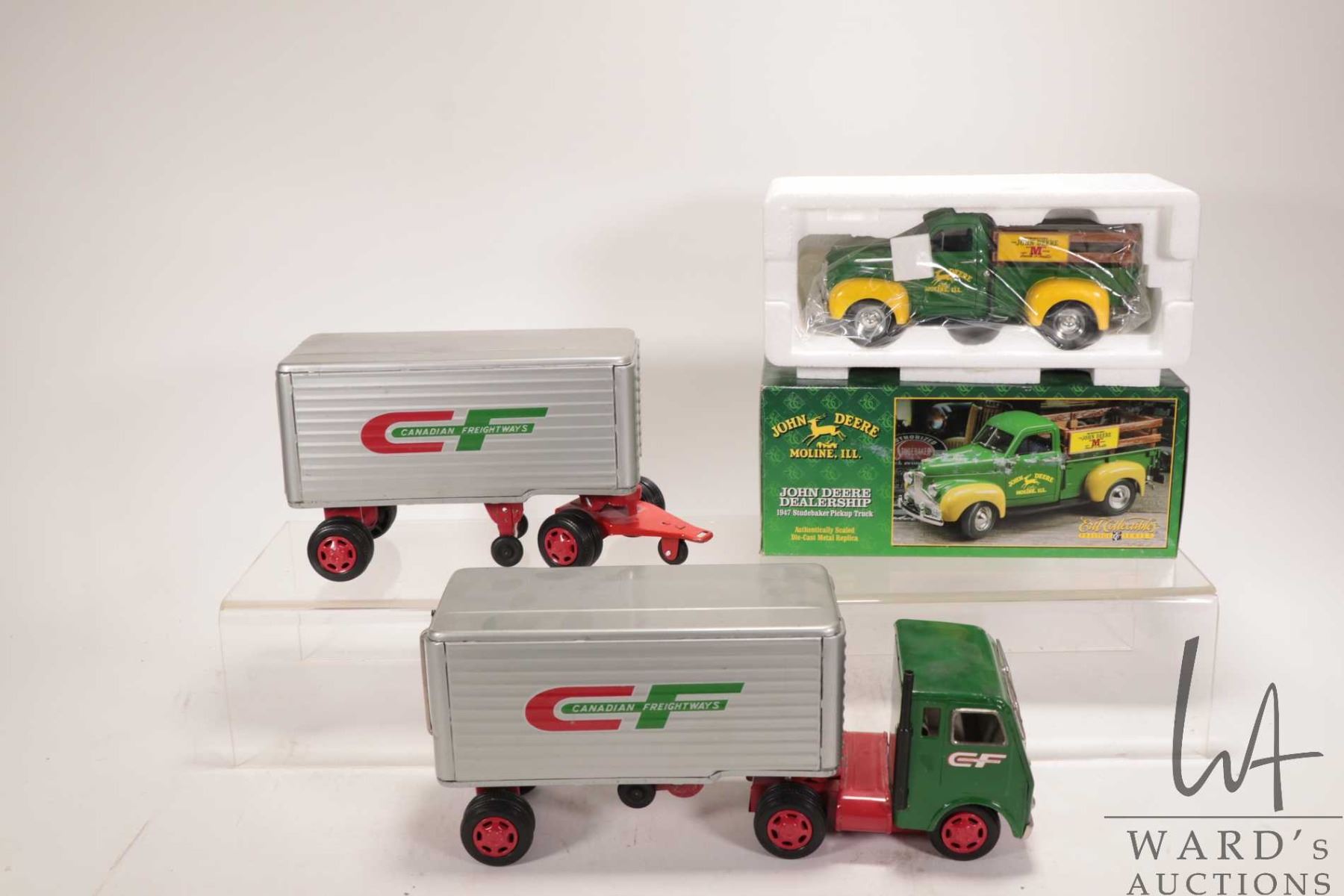 Ertl John Deere Dealership 1947 Studebaker Pick up truck with original box and a tin toy White Freight Liner truck with two trailers marked "Canadian Freightways"