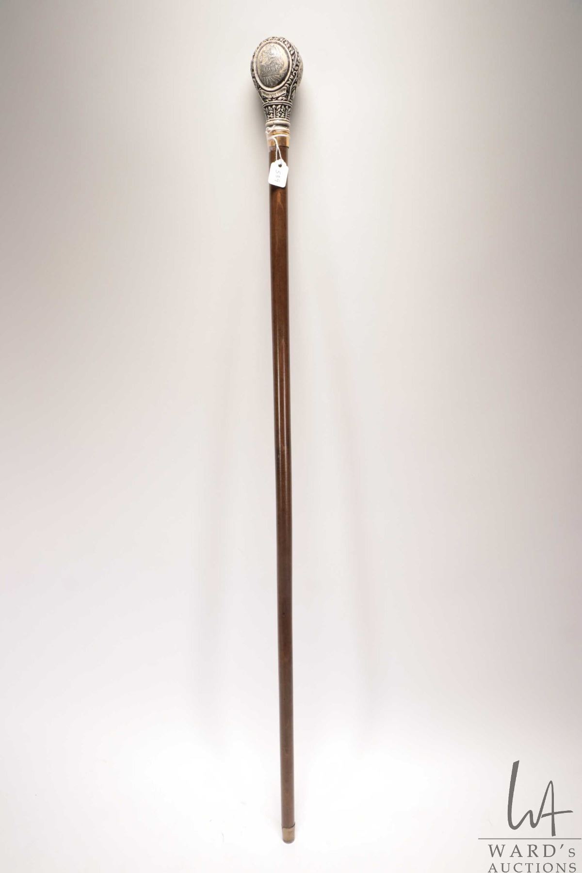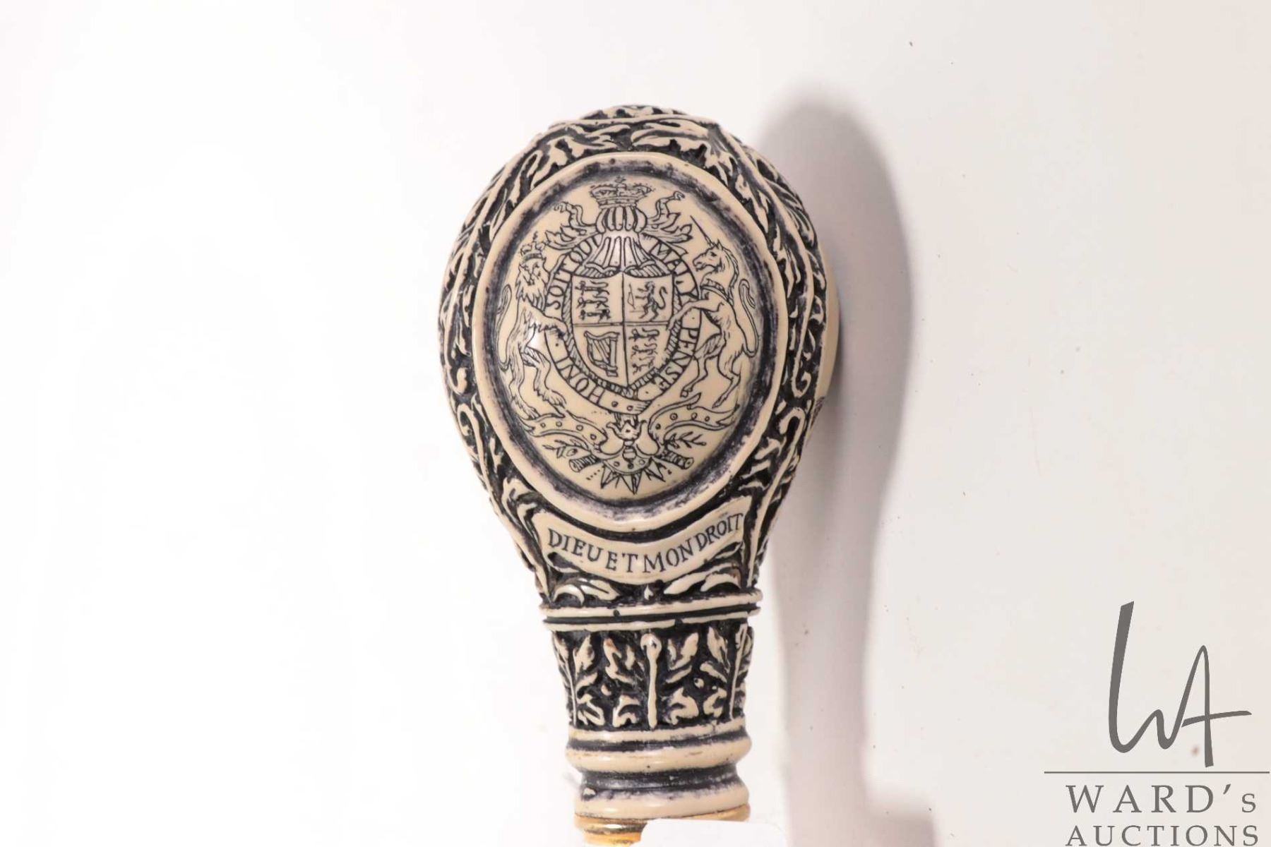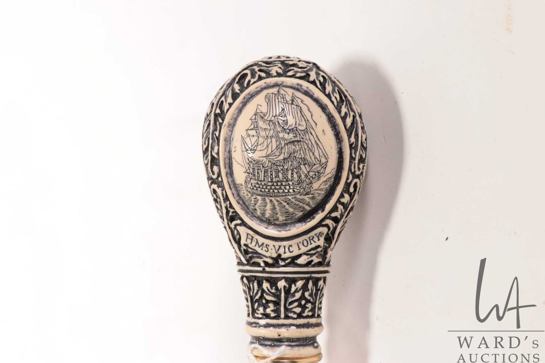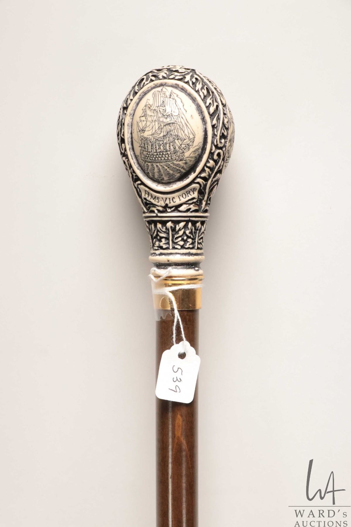 Faux ivory and wooden walking stick with decorative H.M.S. Victory and Horatio Nelson top, 36 1/2" in height