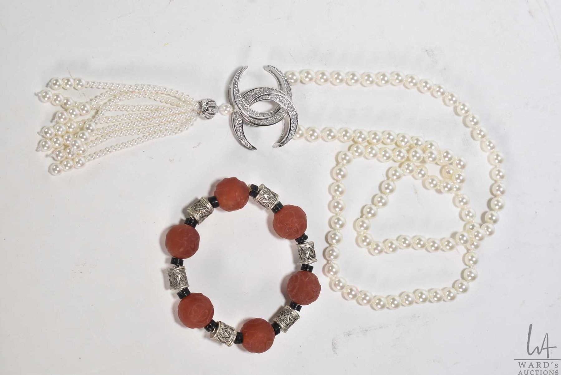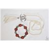Faux pearl necklace with diamante pendant 30" in length and a beaded bracelet