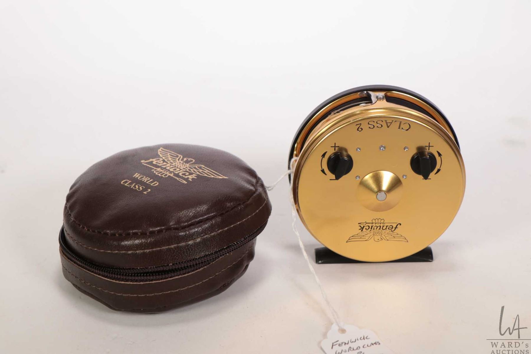 Fenwick World Class No. WCF-969-4 four piece fly rod, 9'6" in length, 9 wt. includes sleeve and tube and a Fenwick World Class No. 2 fly reel with leather case, line and leaders