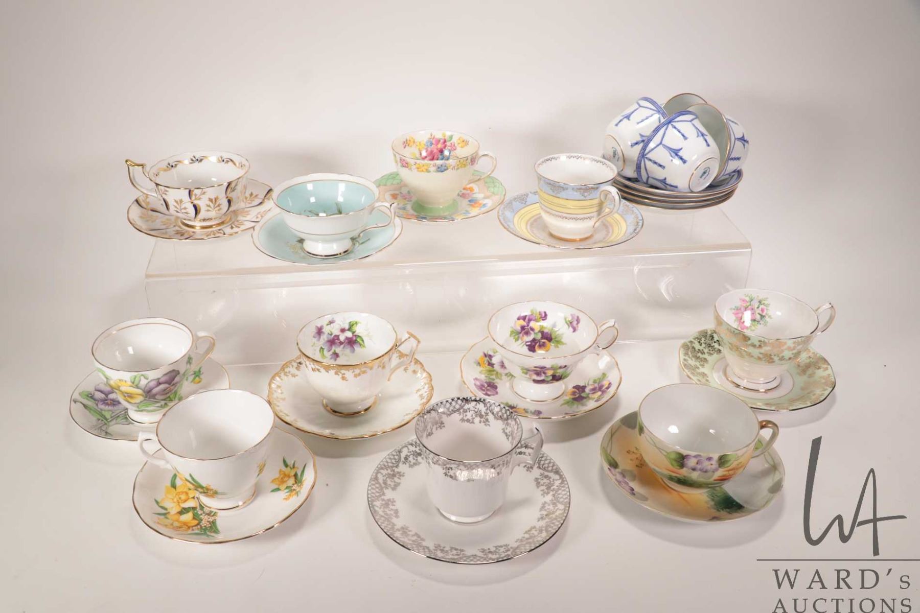 Fifteen collectible china cups and saucers including Royal Crown Derby, Aynsley, Royal Chelsea, Paragon, Foley, hand painted Nippon etc.