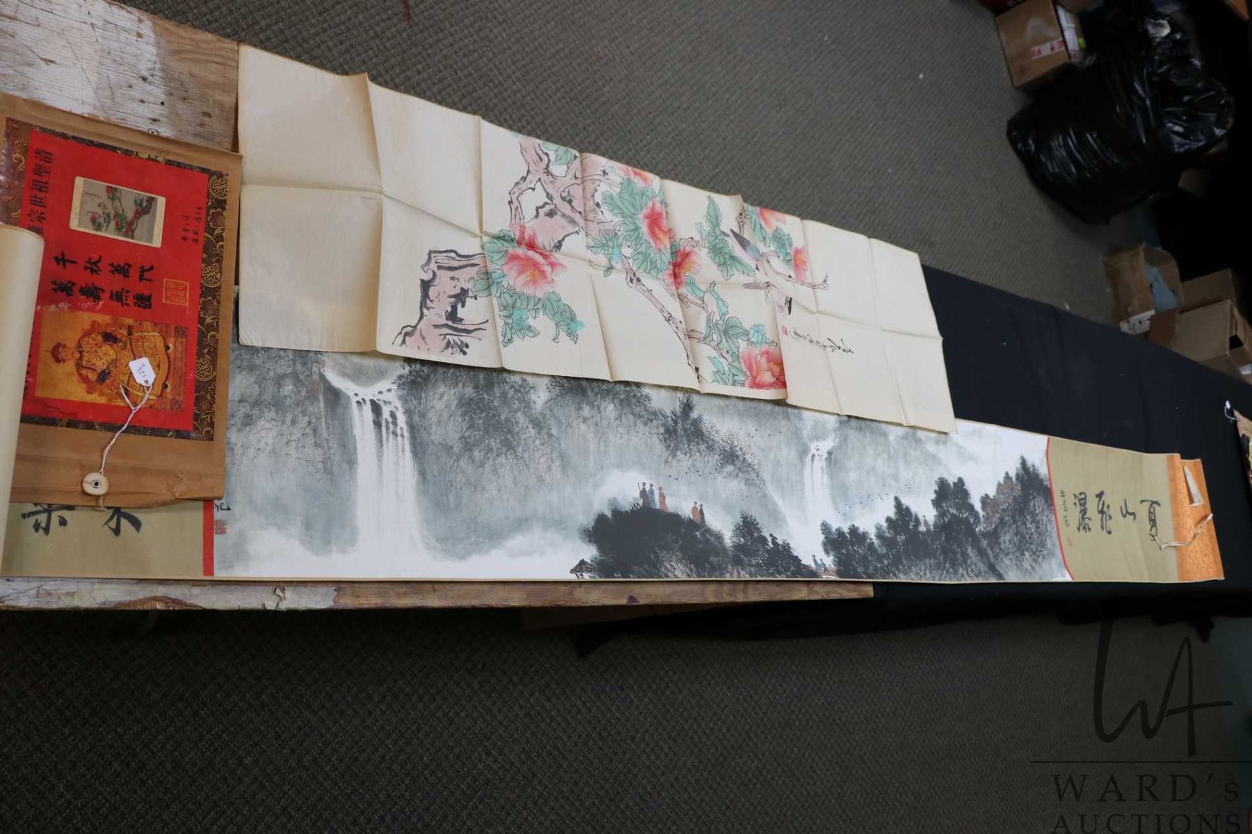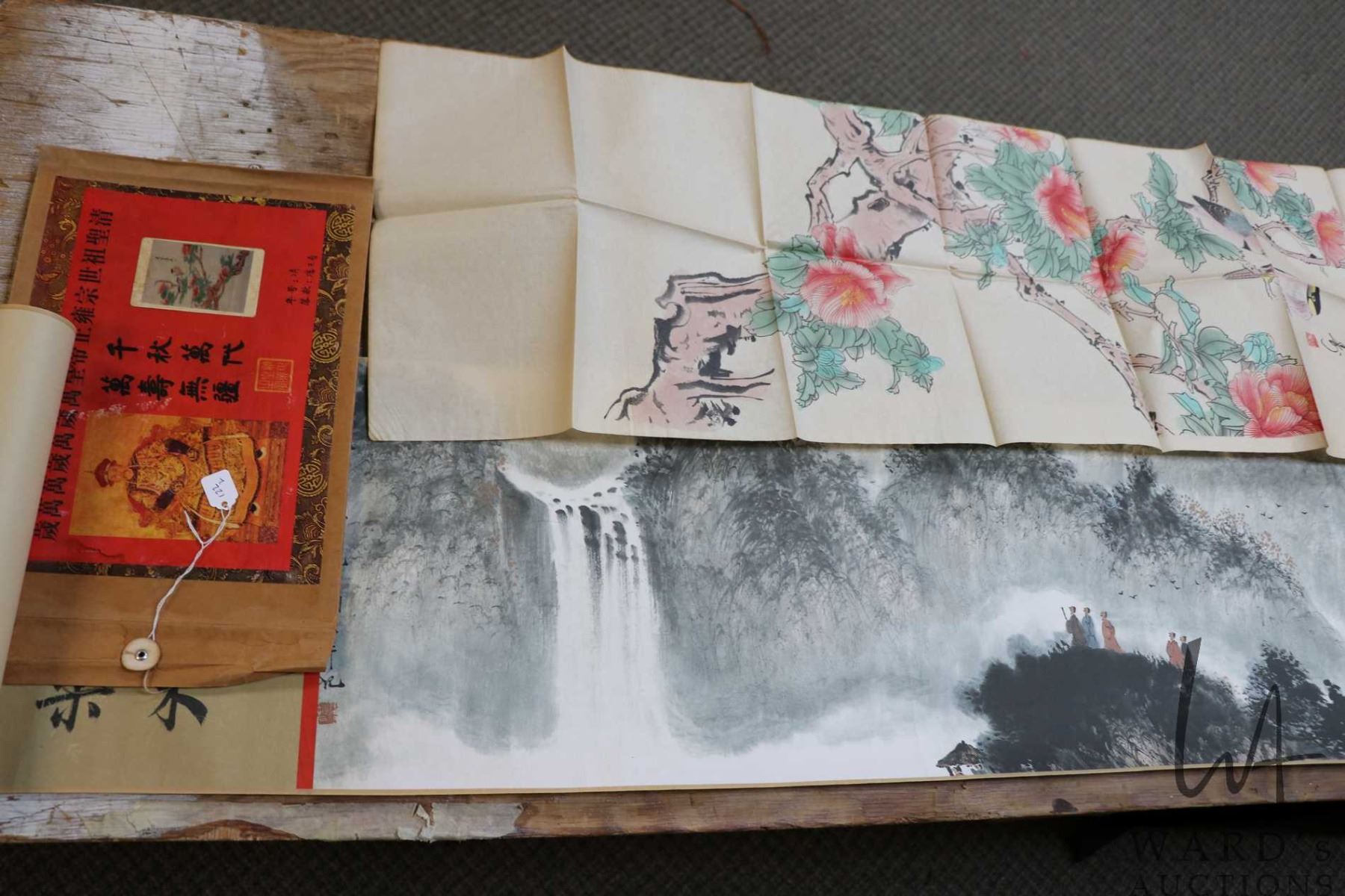 Fire wax stamped ink on paper long scroll, 20th century, painted image 70" flanked by script, and a colour and ink on paper "Bird Garden" artwork in envelope