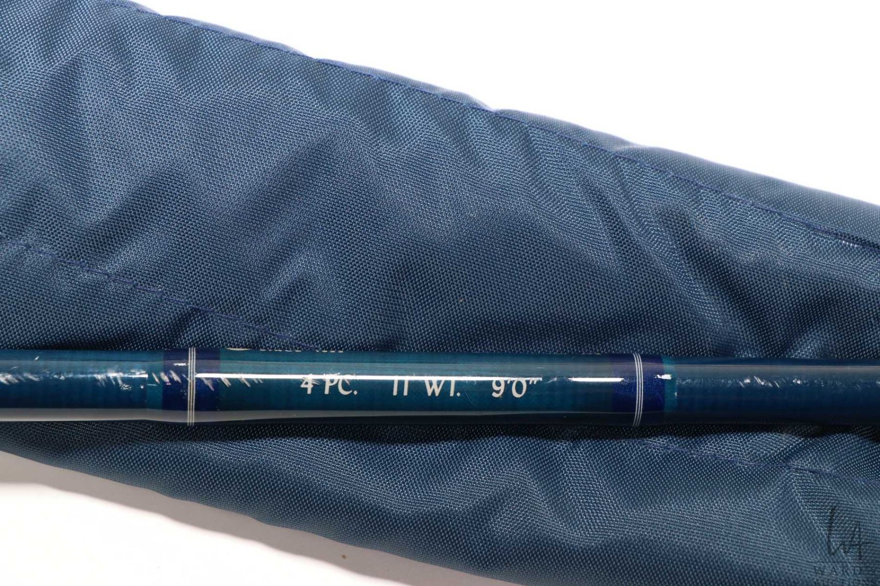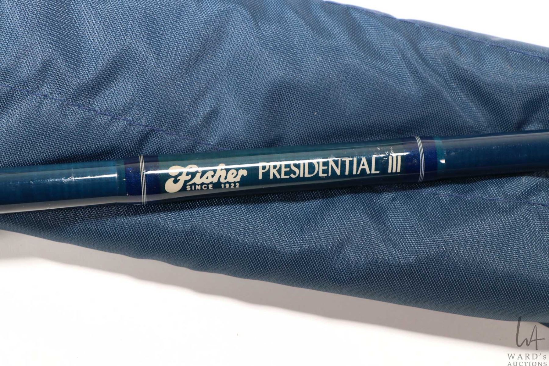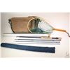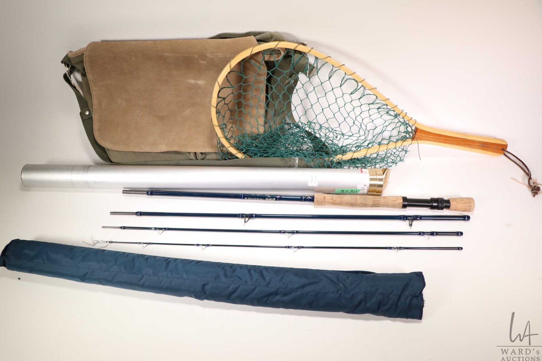 Fisher Presidential III, four piece fly rod 11 Wt. 9' fly rod in gently used condition, includes sleeve and aluminium tube plus an unused canvas and suede shoulder bag and wooden fishing net