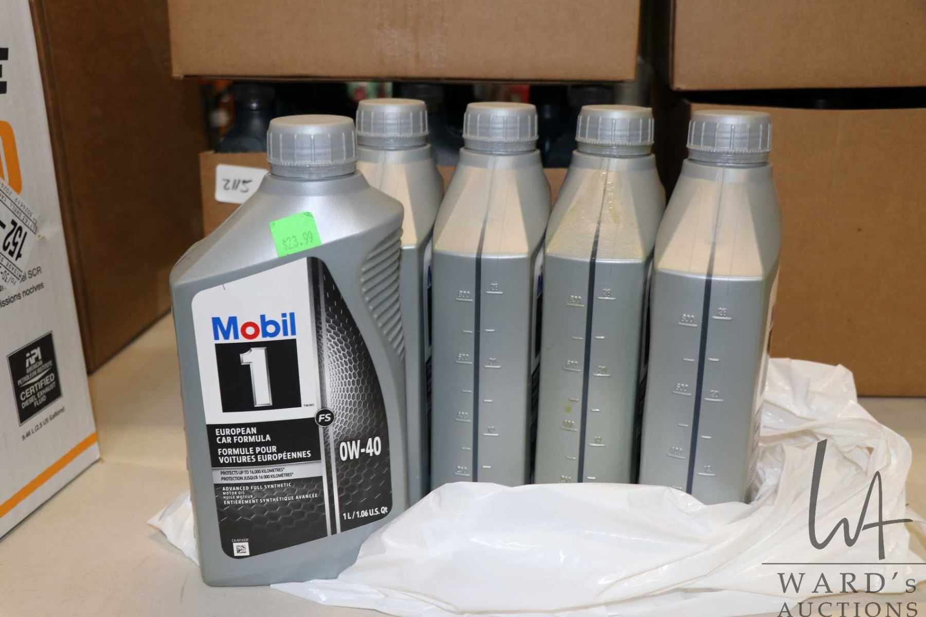 Five 1 L containers of Mobil 1 European car formula 0W-40 advanced full synthetic motor oil