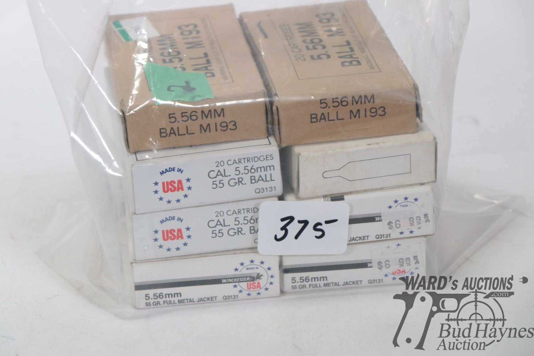Five 20 count boxes of 5.6mm 55 grain FMJ, one 20 count box of BUTIR 5.56mm ball M193 55 grain, a 20