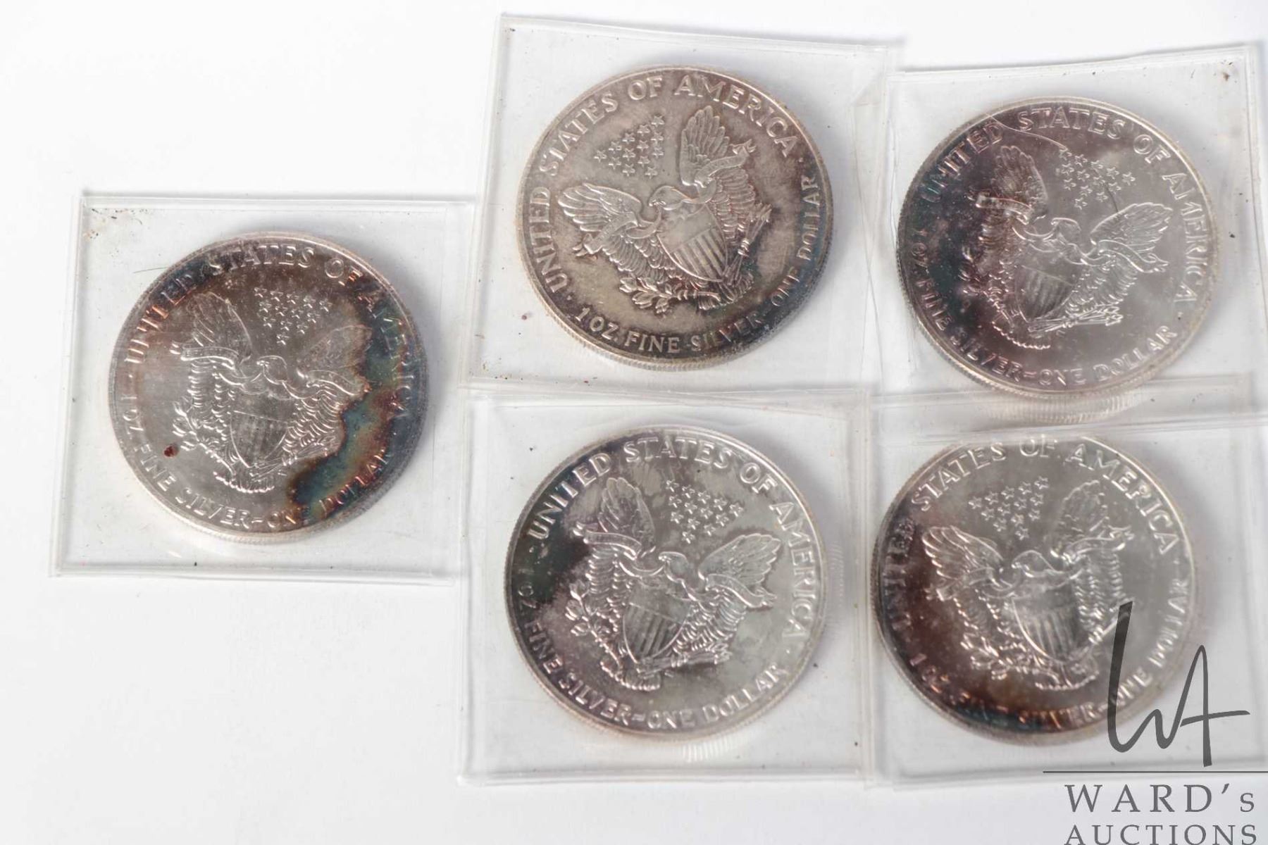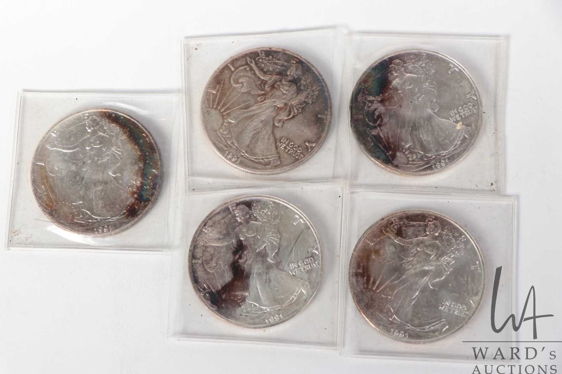 Five American fine 1 oz. silver Liberty dollar coins, all dated 1991