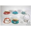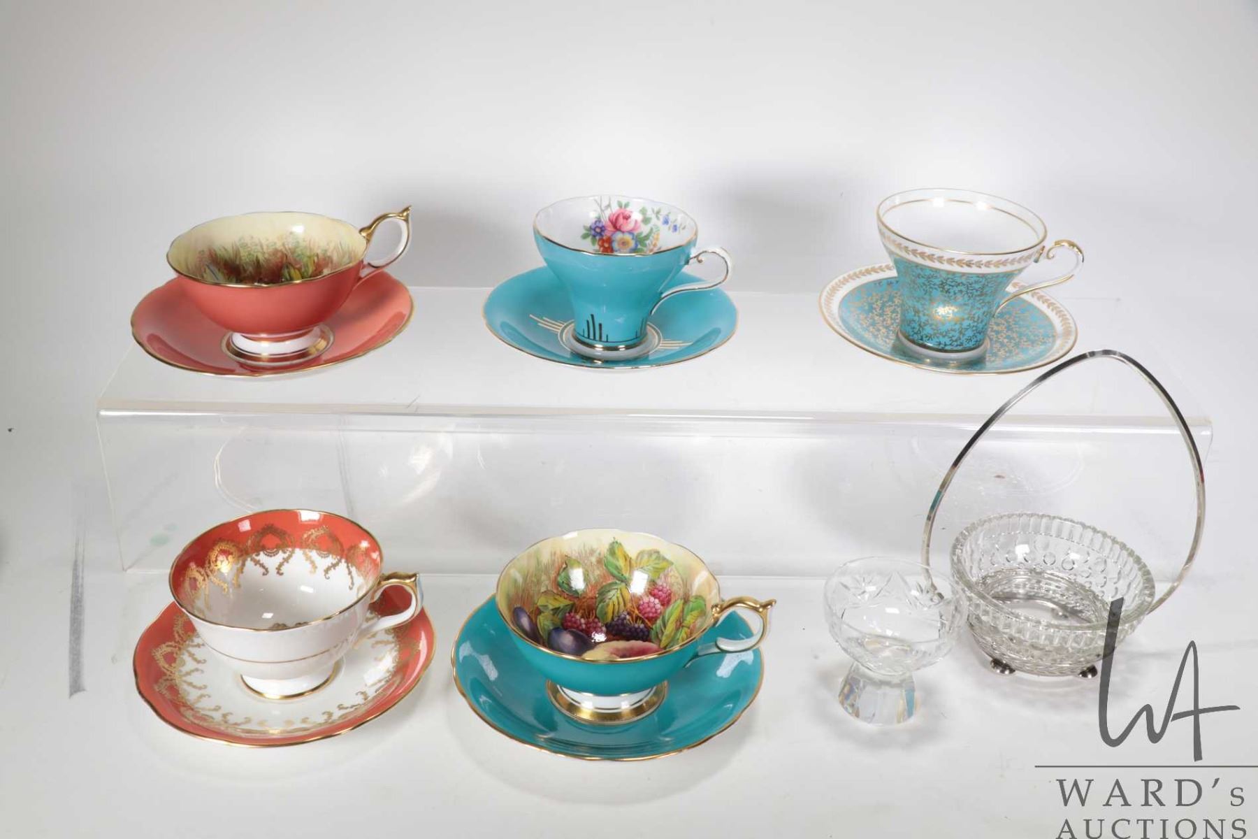 Five Aynsley china teacups and saucers plus a sterling galley with hobnail jam dish and a small German handcut crystal footed dish. Note: Not available for shipping. Local pickup only