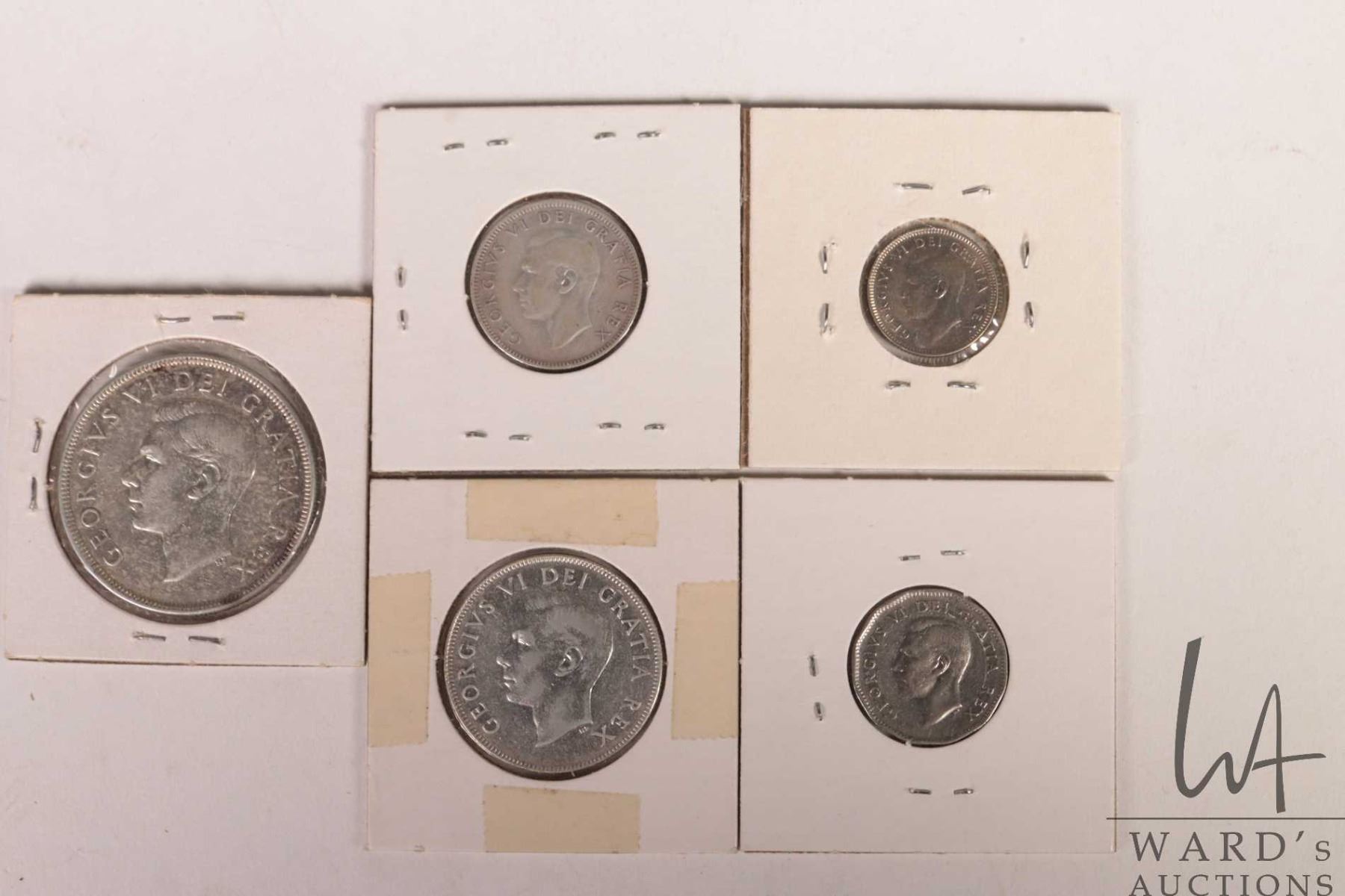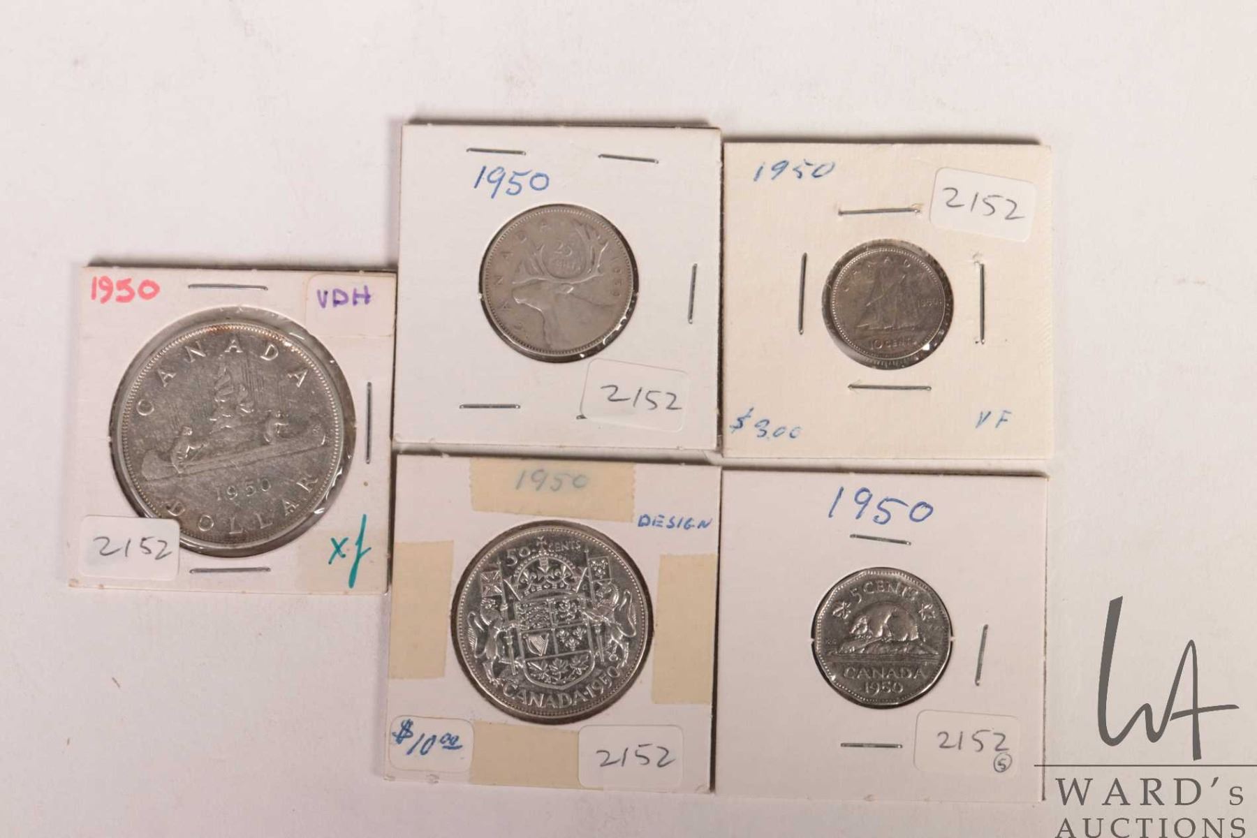 Five Canadian 1950 coins including nickel, dime, quarter, fifty cent and silver dollar