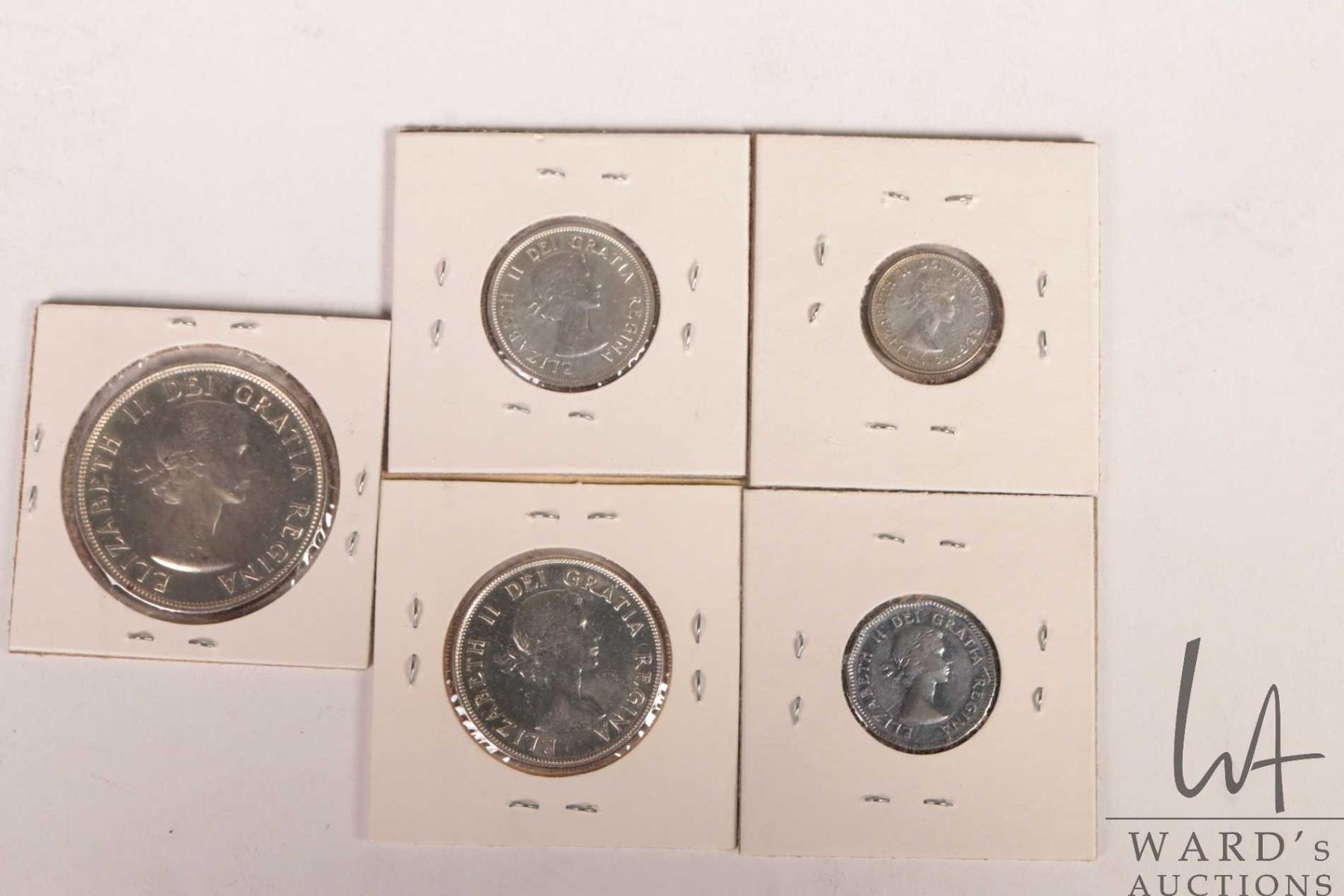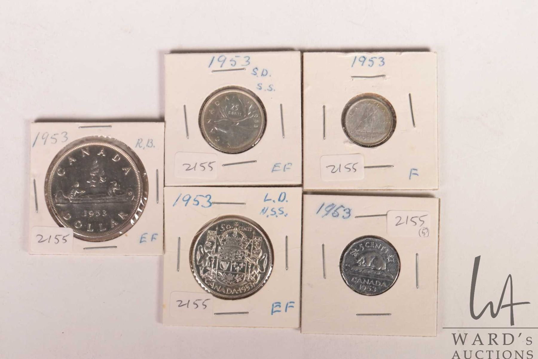 Five Canadian 1953 coins including nickel, dime, quarter, fifty cent and silver dollar