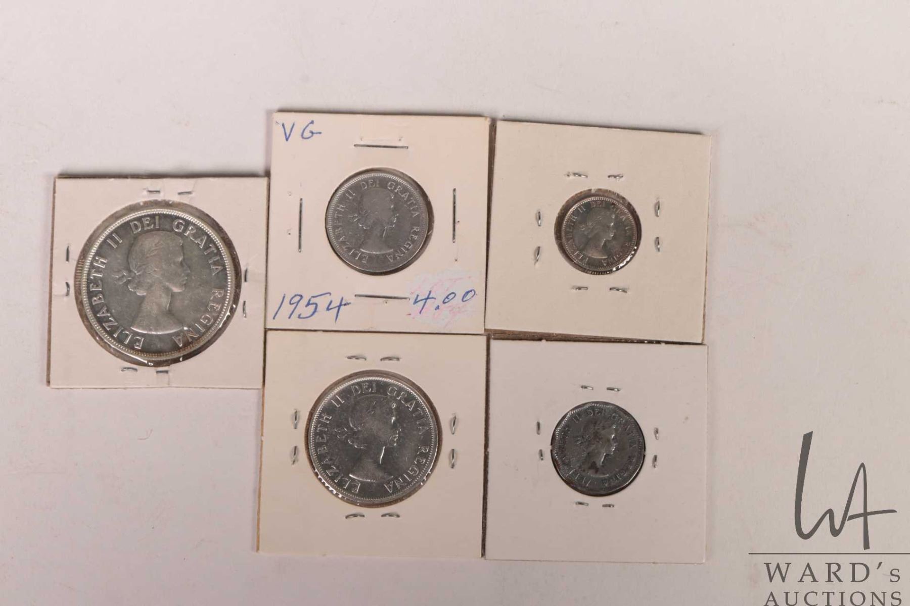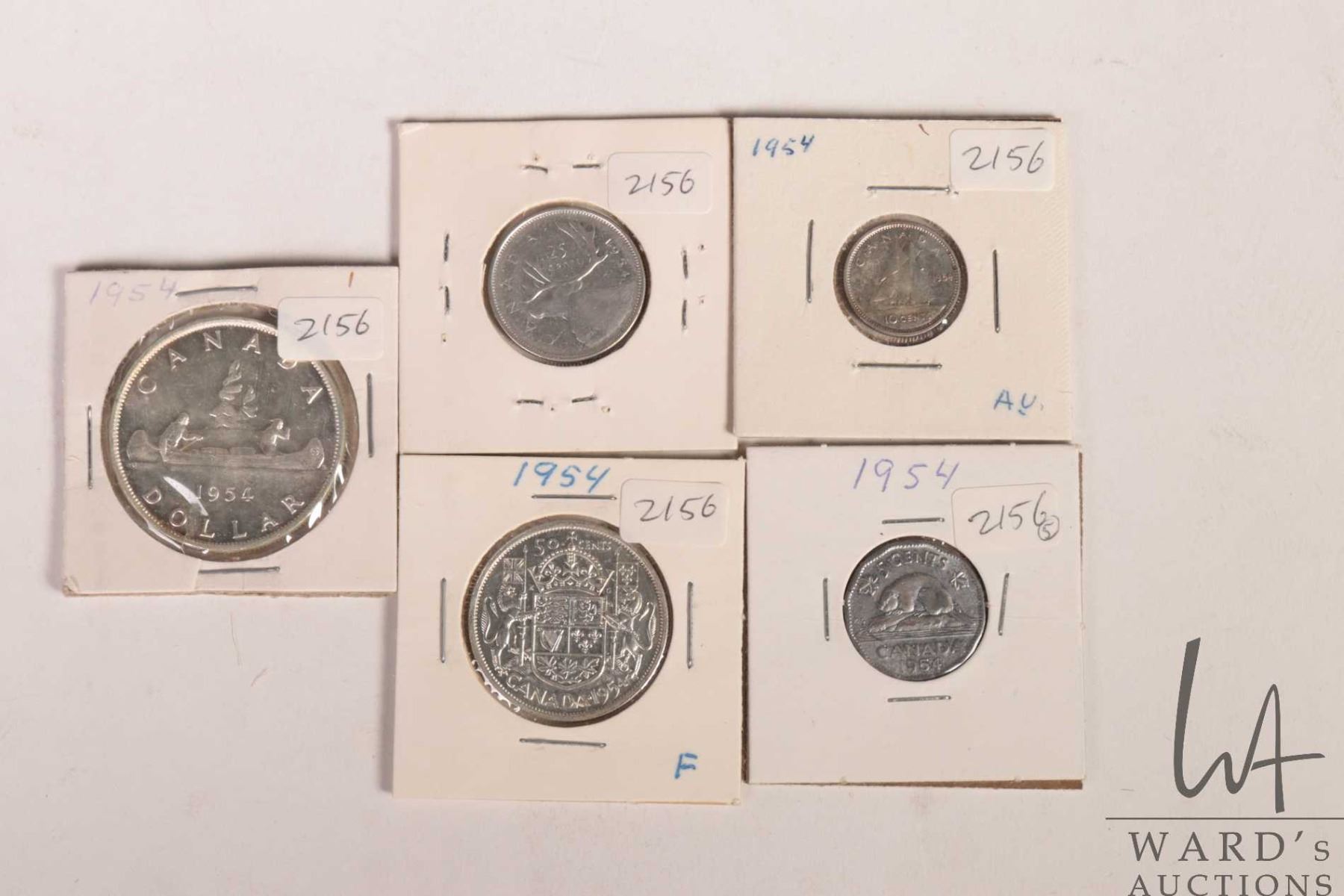 Five Canadian 1954 coins including nickel, dime, quarter, fifty cent and silver dollar