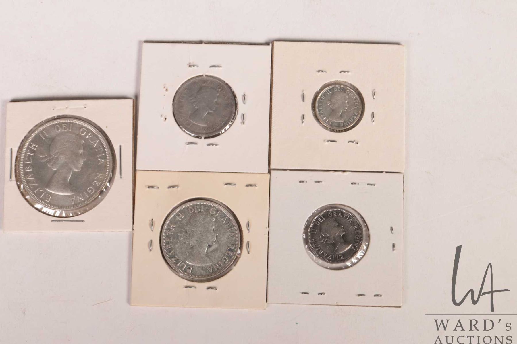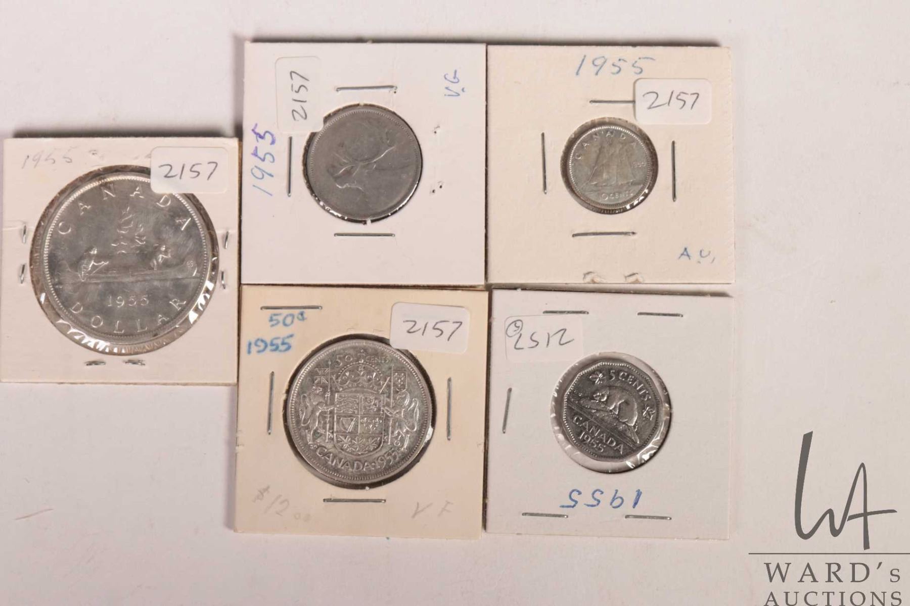 Five Canadian 1955 coins including nickel, dime, quarter, fifty cent and silver dollar