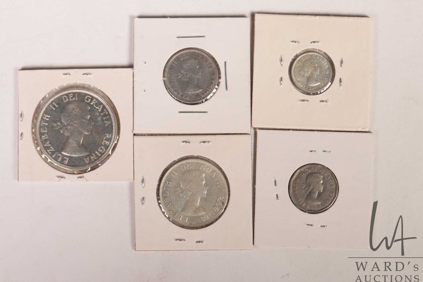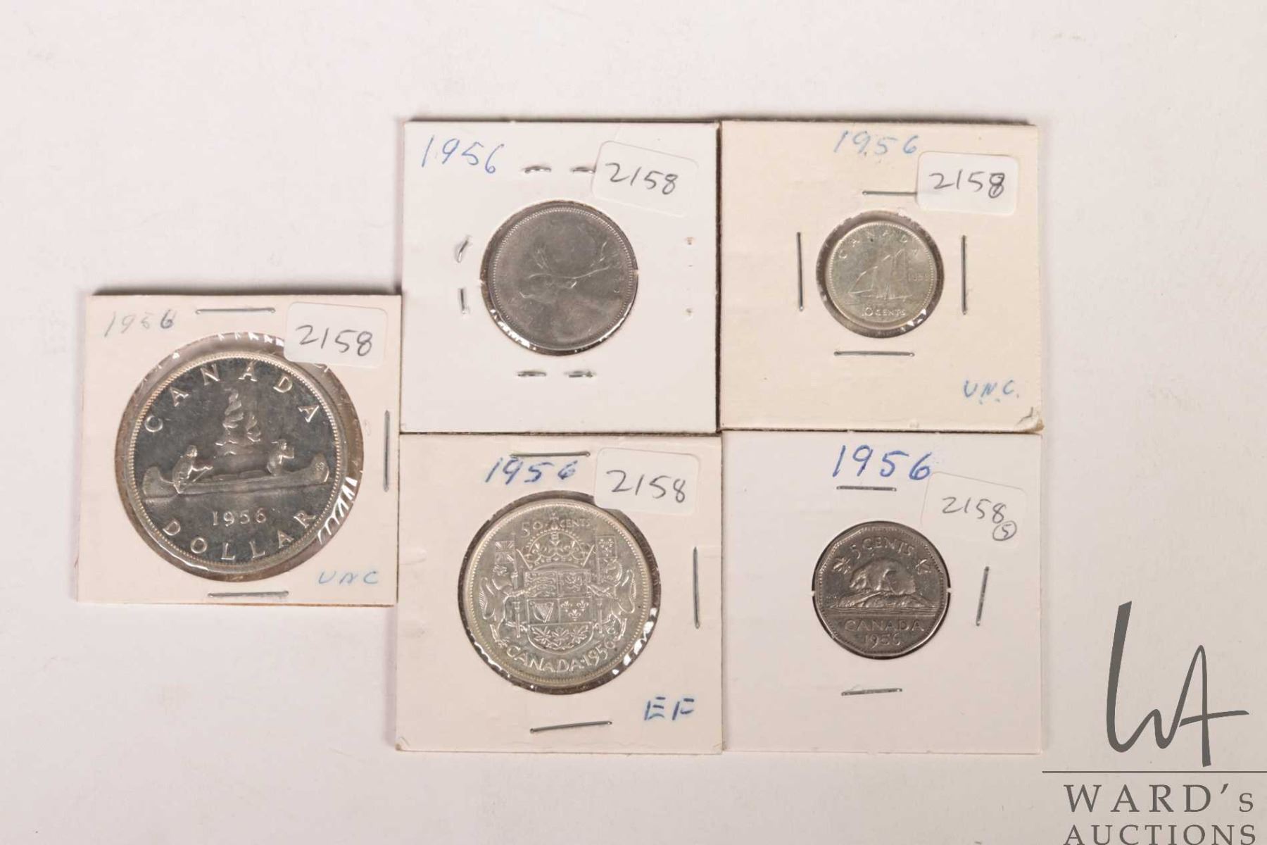 Five Canadian 1956 coins including nickel, dime, quarter, fifty cent and silver dollar