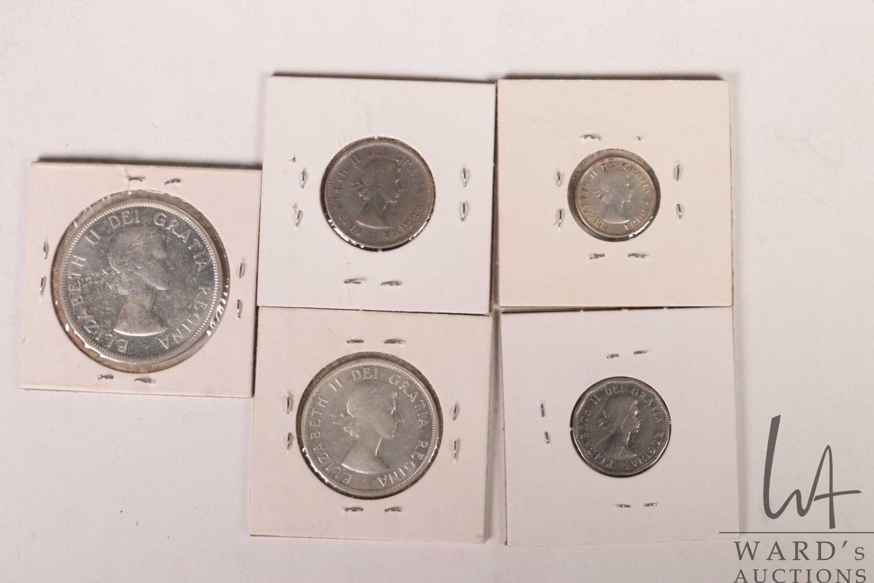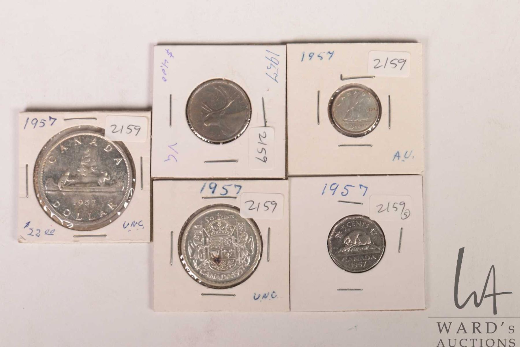Five Canadian 1957 coins including nickel, dime, quarter, fifty cent and silver dollar