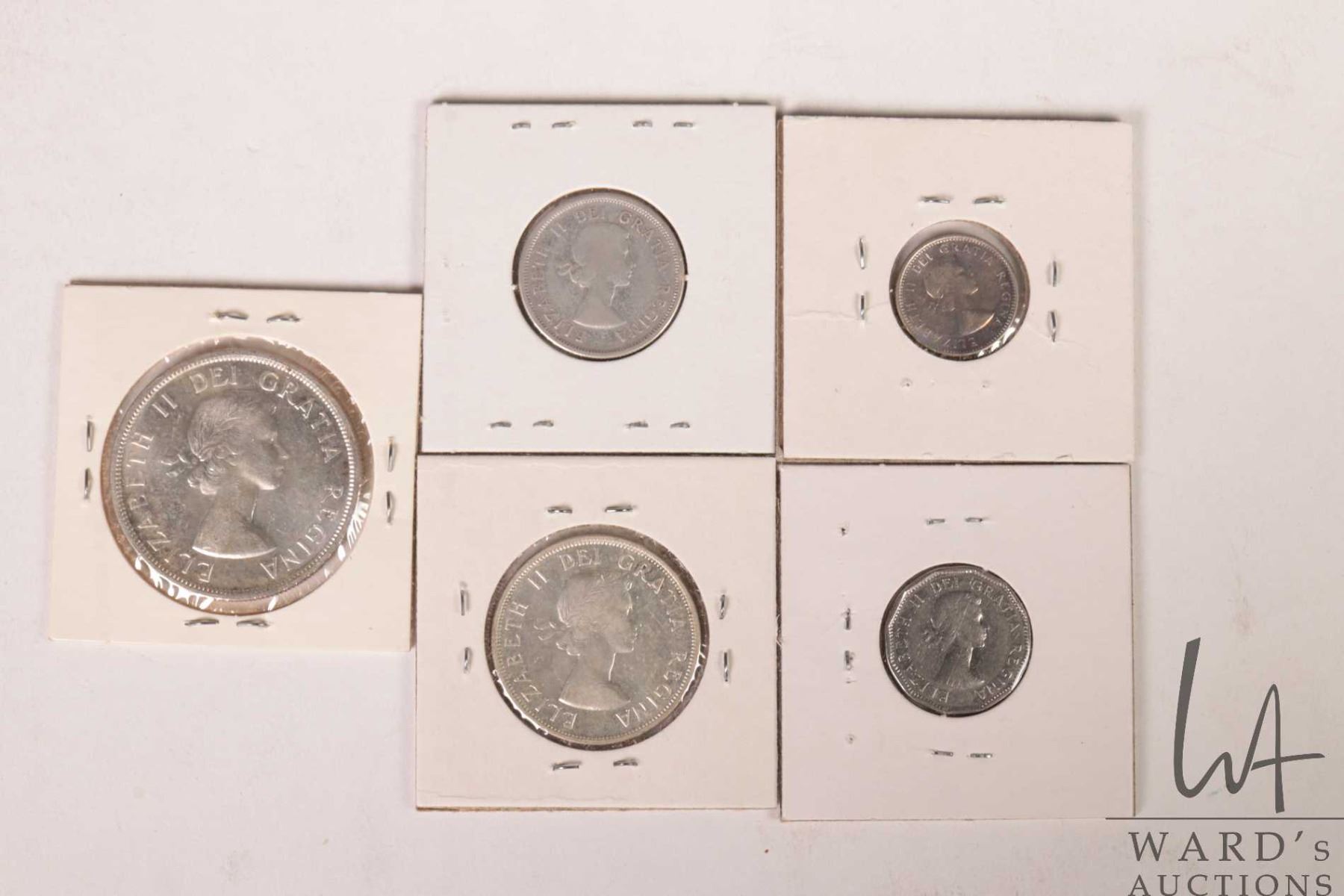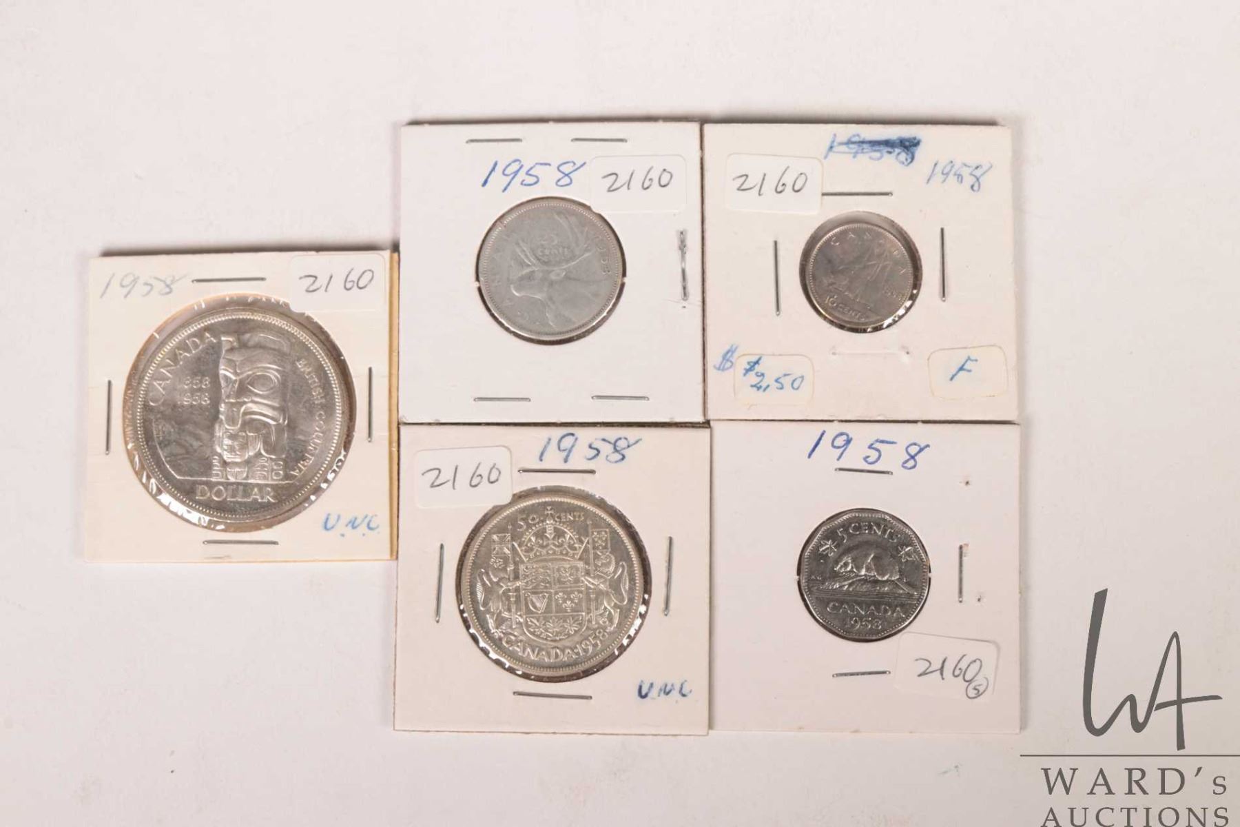 Five Canadian 1958 coins including nickel, dime, quarter, fifty cent and silver dollar