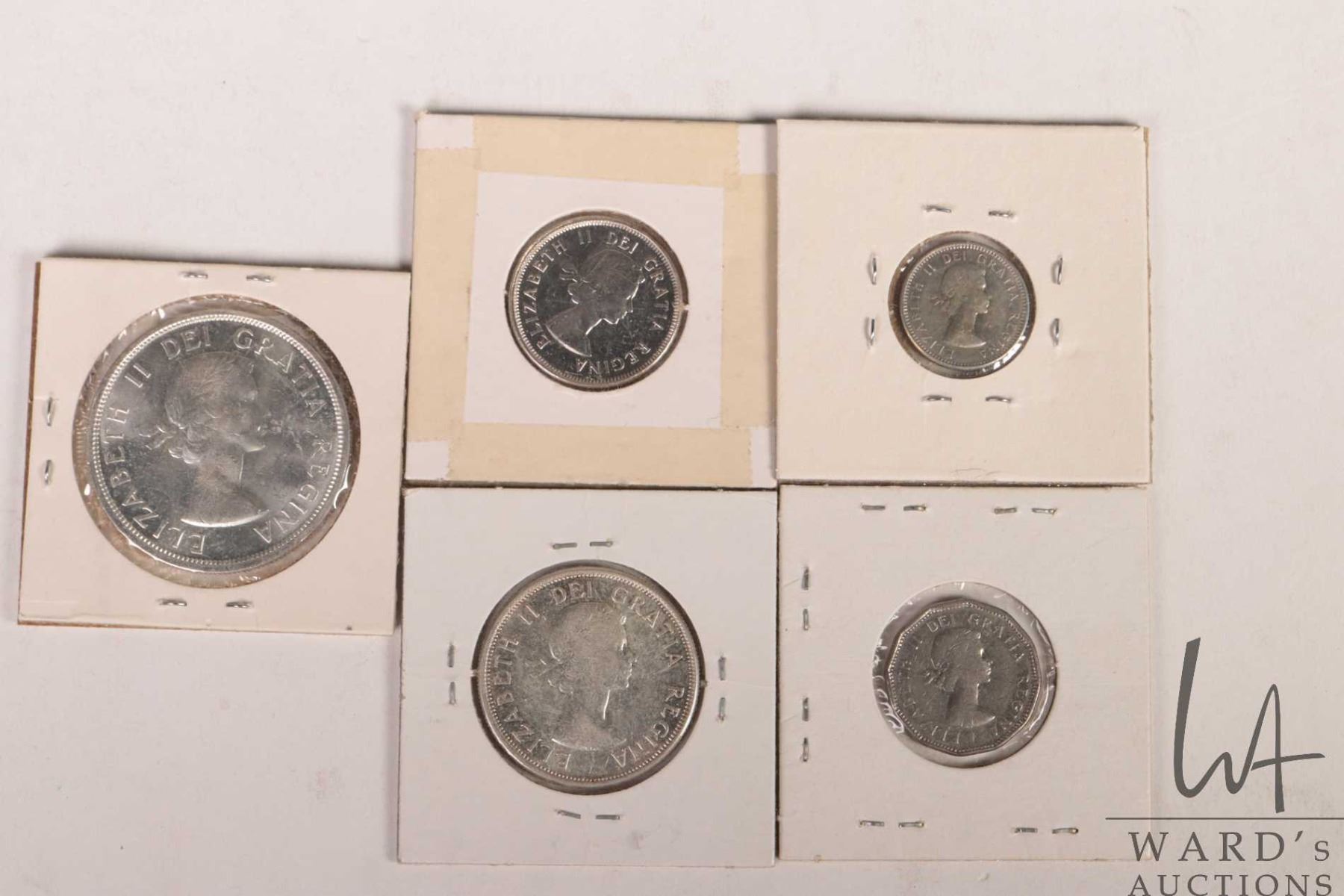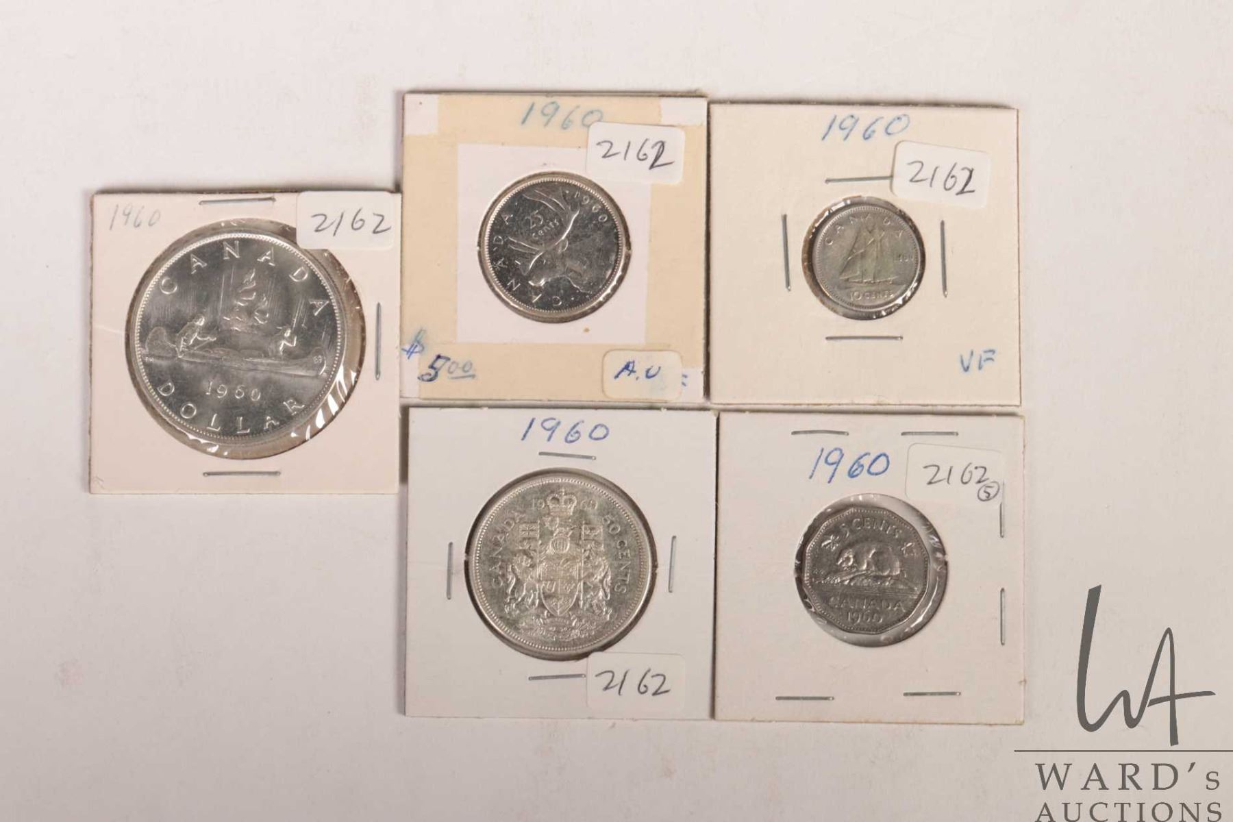 Five Canadian 1960 coins including nickel, dime, quarter, fifty cent and silver dollar