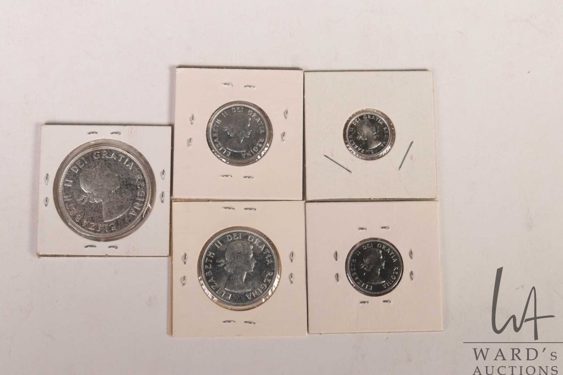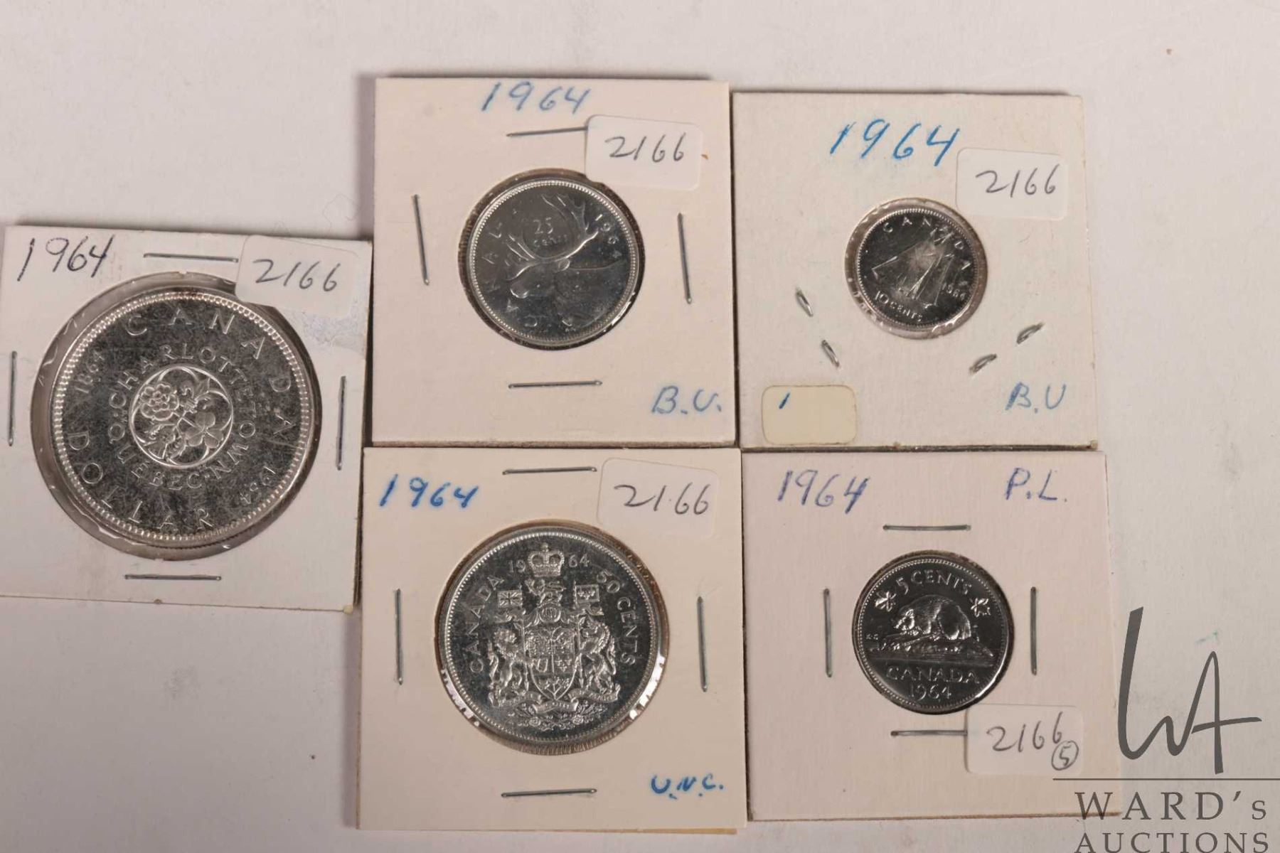Five Canadian 1964 coins including nickel, dime, quarter, fifty cent and silver dollar