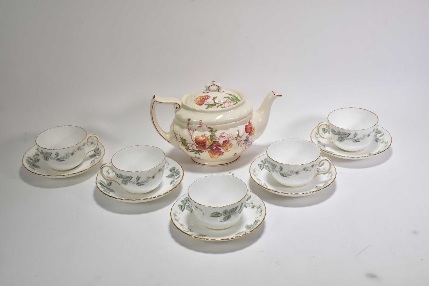 Five Minton S-705 Greenwich tea cups and saucers plus a Royal Doulton Sherborne D5915 tea pot