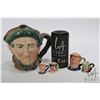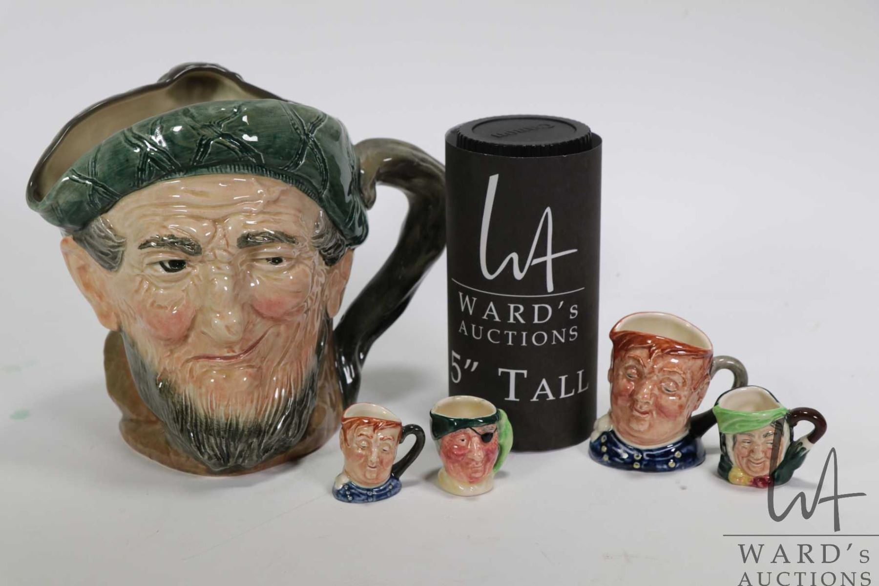 Five Royal Doulton character jugs including large "Auld Mac", small "Fat Boy" and three miniatures including two Royal Doultons and one Lancaster