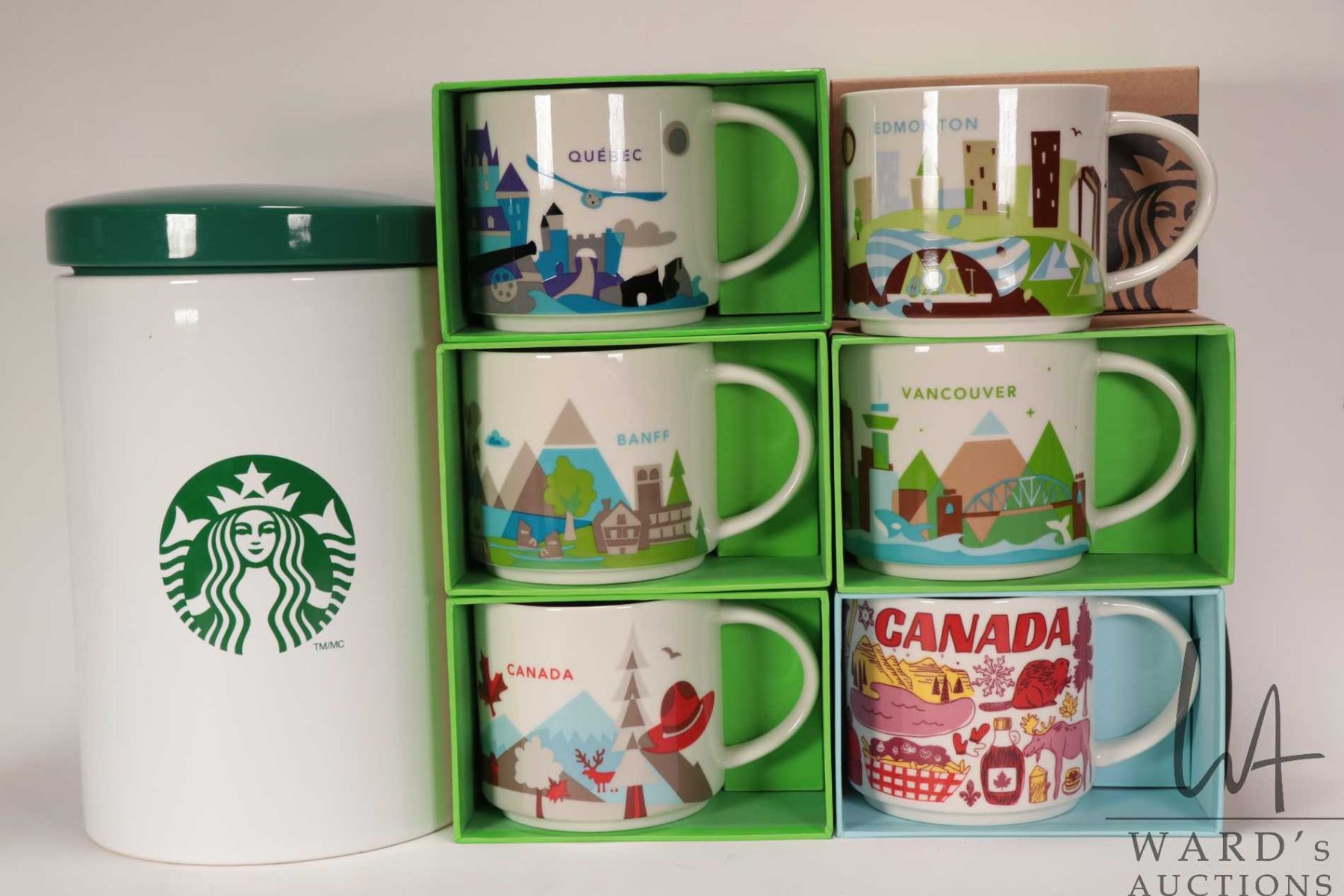 Five Starbucks coffee mugs from the "You Are Here" collection including Banfff, Vancouver and Edmonton etc, a Canada from the "Been There Series" plus a Starbucks canister