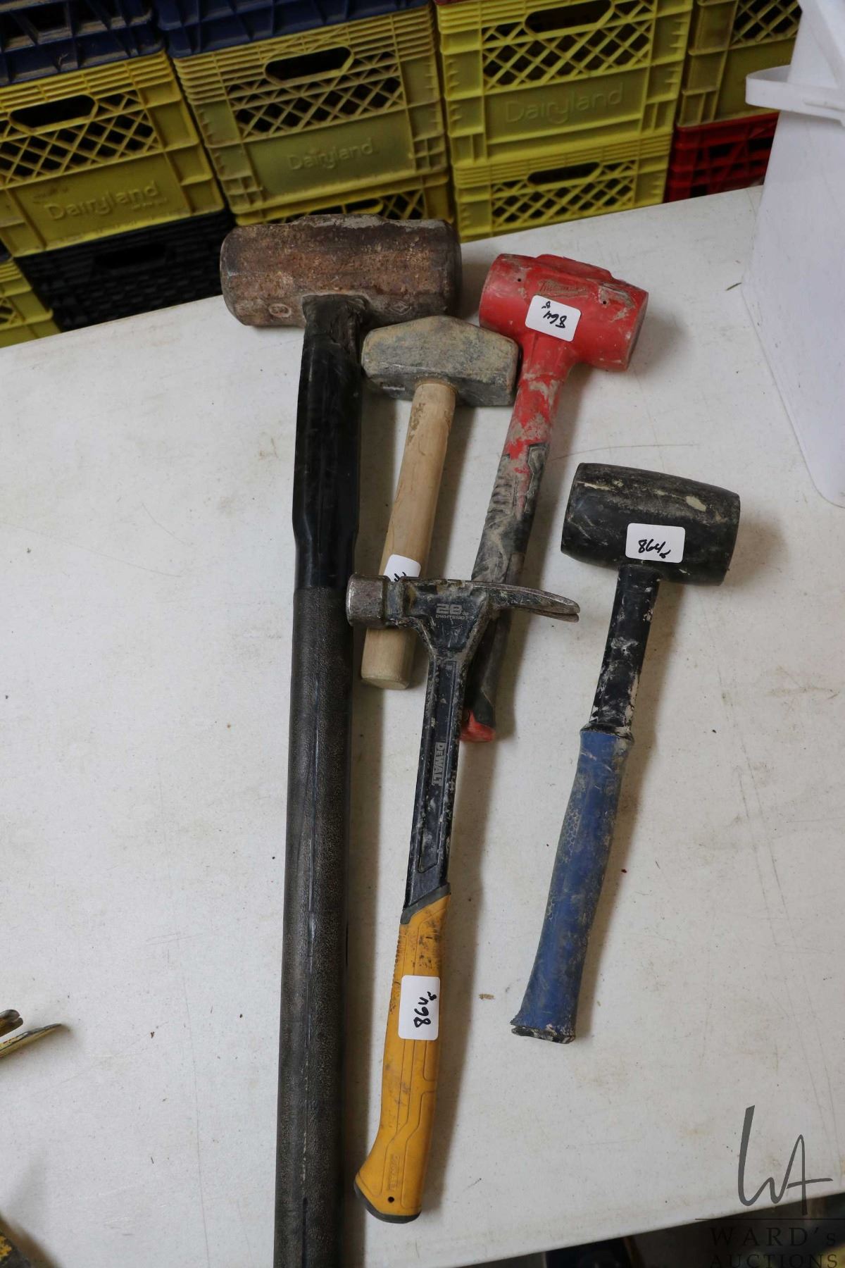 Five assorted hammers including dead blow, sledge hammer, framing hammer, rubber mallet and small sl