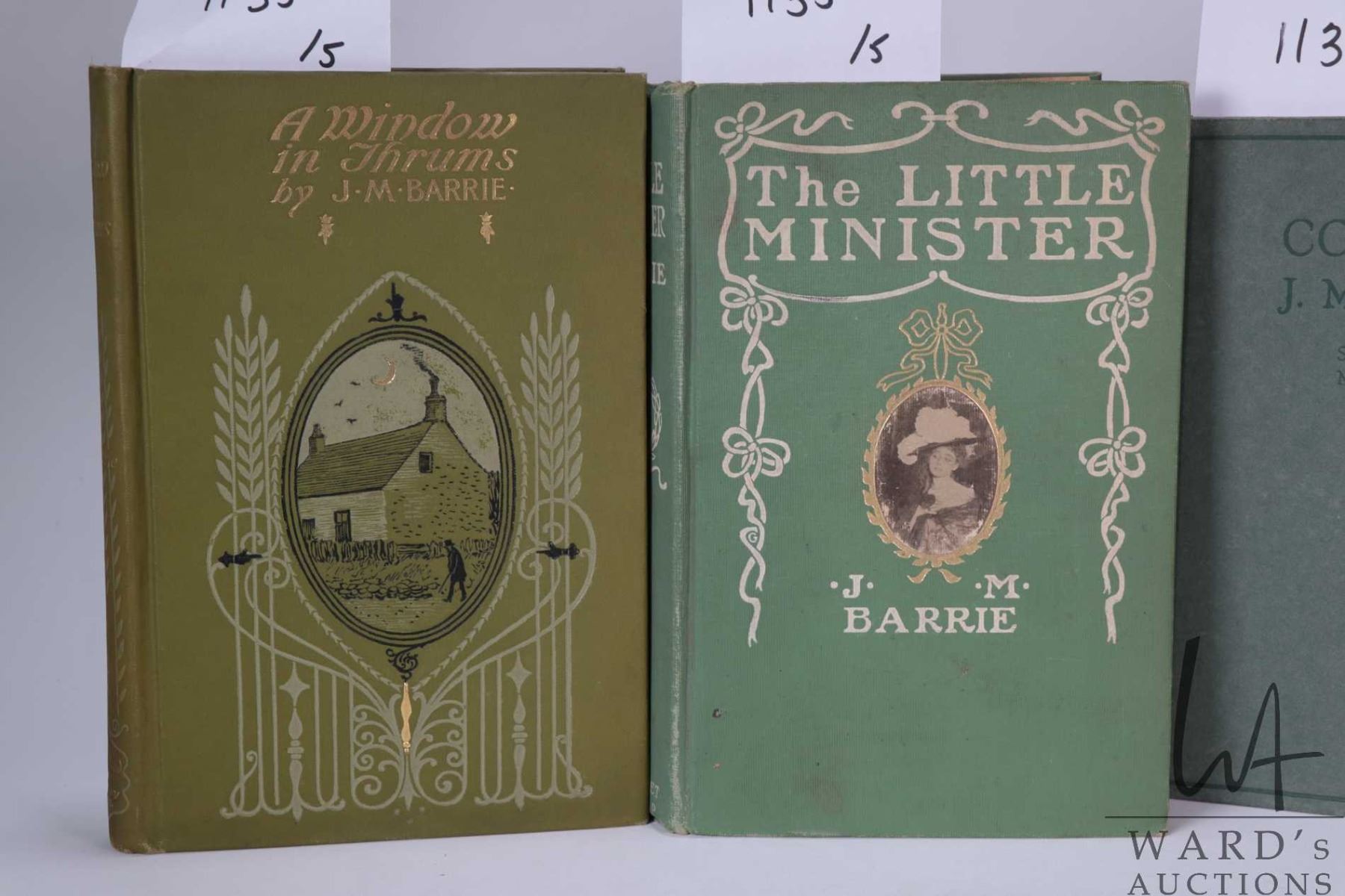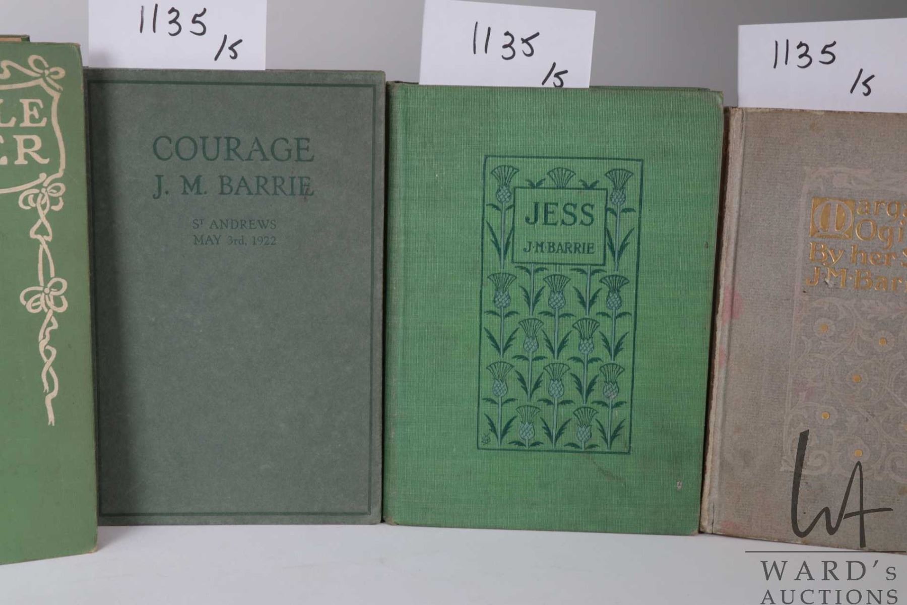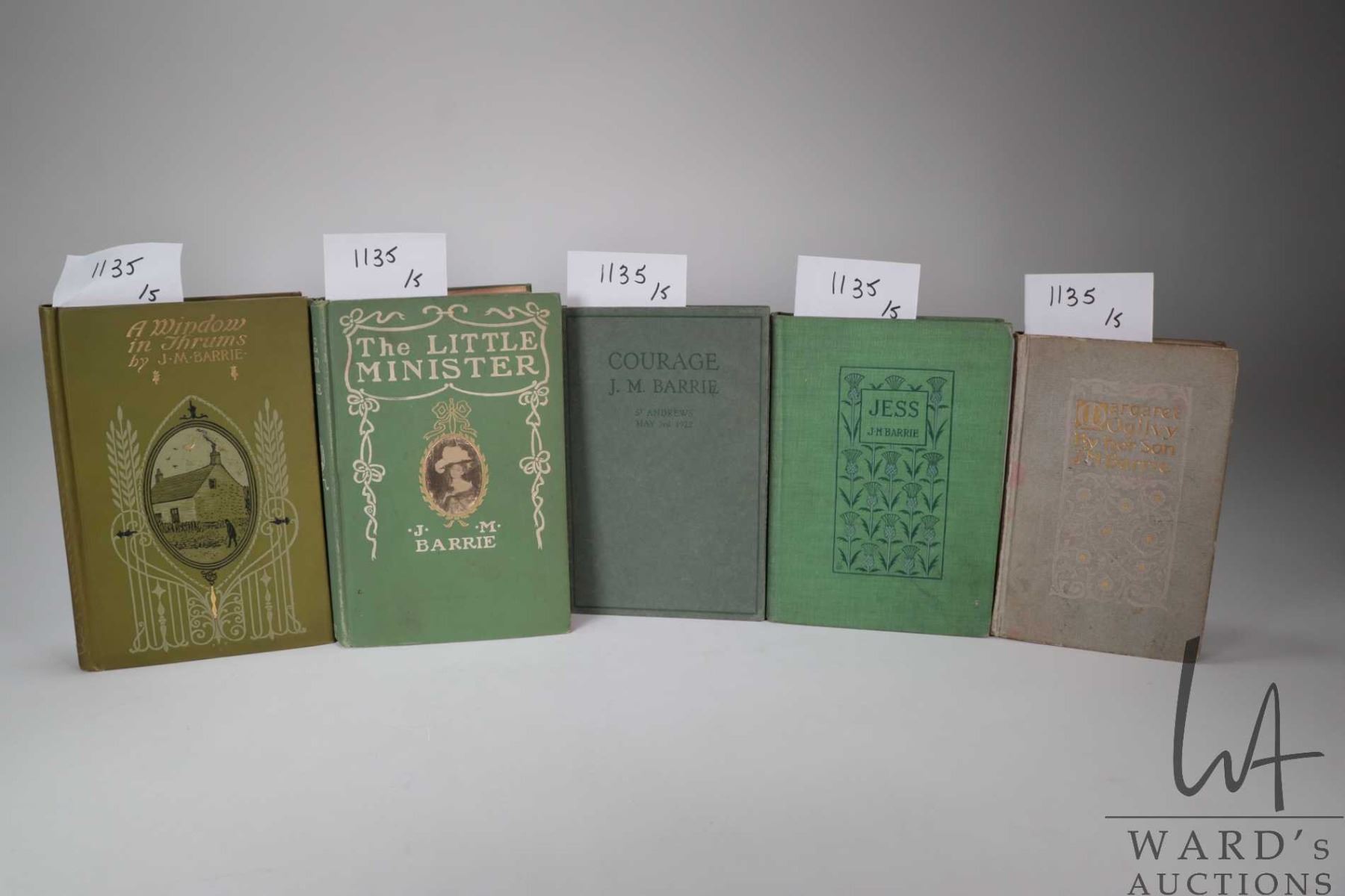 Five books, all by author J.M. Barrie including "Courage- The Rectorial Address Delivered at St. Andrews University May 3rd, 1922. Published by Hodder and Stoughton Ltd. Toronto. "Jess". Illustrated. Published by Dana Estes & Company 1898. "Margaret Ogilvy" Published by Charles Scribner's Sons, New York 1899. " A Window in Thrums". Illustrations by Clifton Johnson. Published by Dodd, Mead and Company , New York. 1896 and "The Little Minister" Published by Grosset & Dunlap, New York, 1897. All with decorative hardboard covers