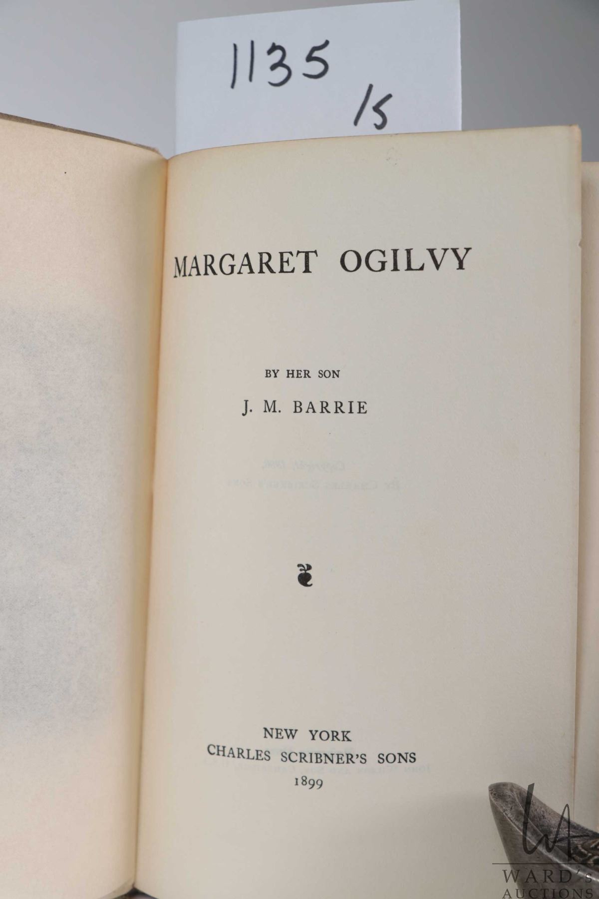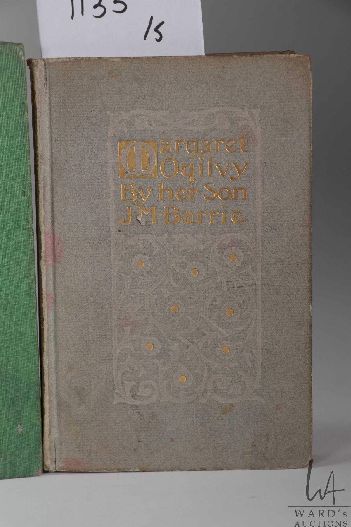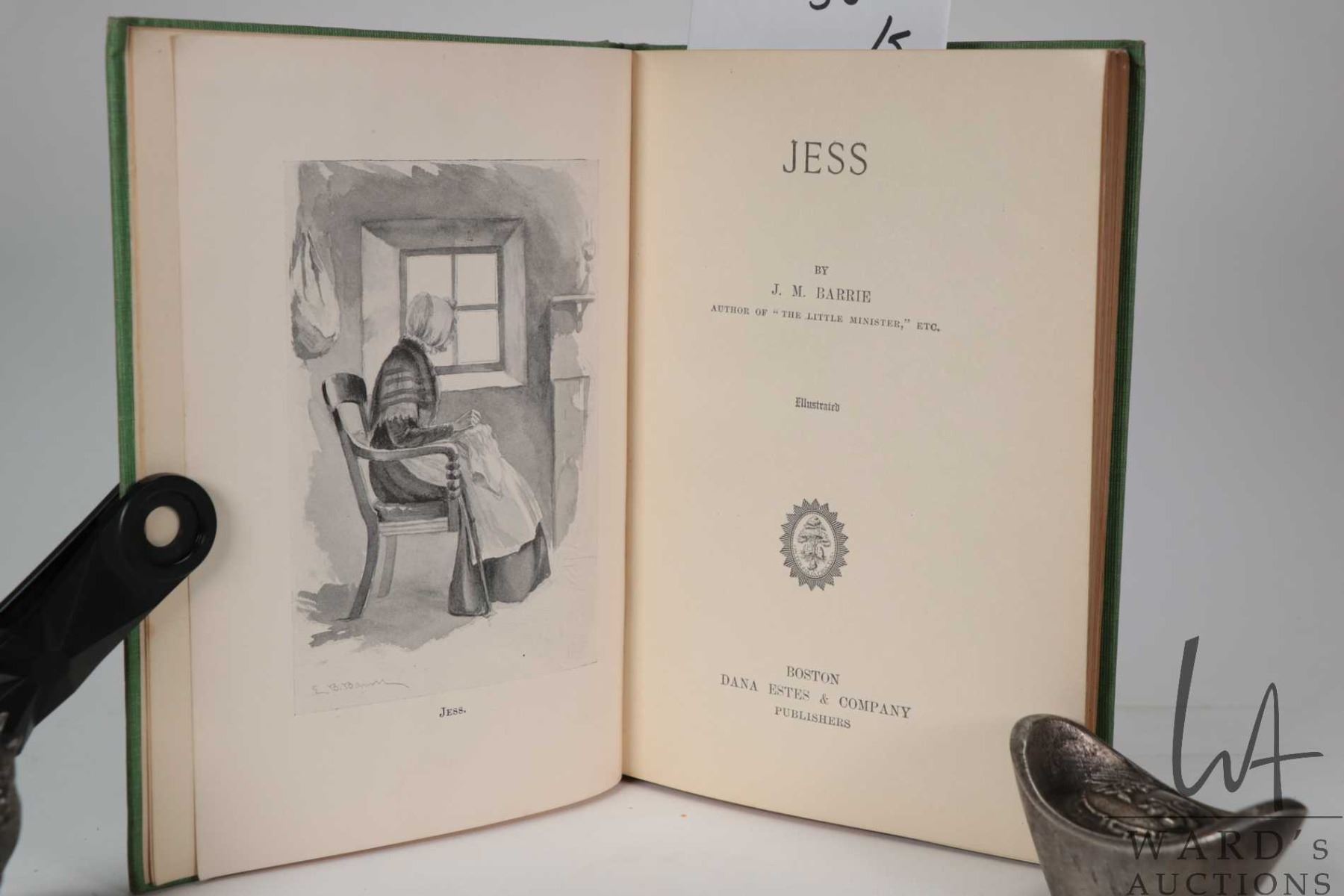 Five books, all by author J.M. Barrie including "Courage- The Rectorial Address Delivered at St. Andrews University May 3rd, 1922. Published by Hodder and Stoughton Ltd. Toronto. "Jess". Illustrated. Published by Dana Estes & Company 1898. "Margaret Ogilvy" Published by Charles Scribner's Sons, New York 1899. " A Window in Thrums". Illustrations by Clifton Johnson. Published by Dodd, Mead and Company , New York. 1896 and "The Little Minister" Published by Grosset & Dunlap, New York, 1897. All with decorative hardboard covers
