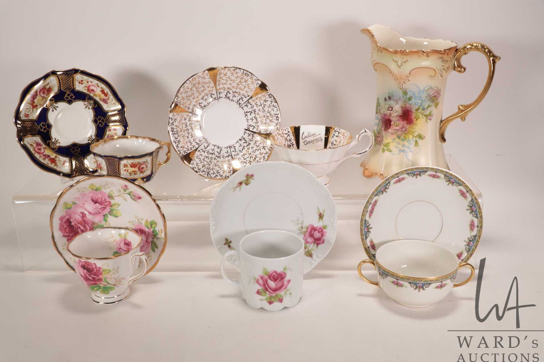 Five collectible china tea cups and saucers including Queen Ann, Royal Albert, Limoges, Rosenthal, hand painted Imari and a Royal Ducal transfer ware pitcher with hand painted details