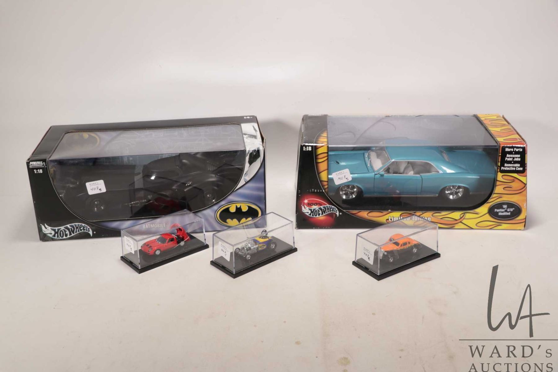 Five die cast Hot wheels cars including three 1:64 scale cars, 1:18 scale '66 Pontiac GTO and 1:18 scale Batmobile