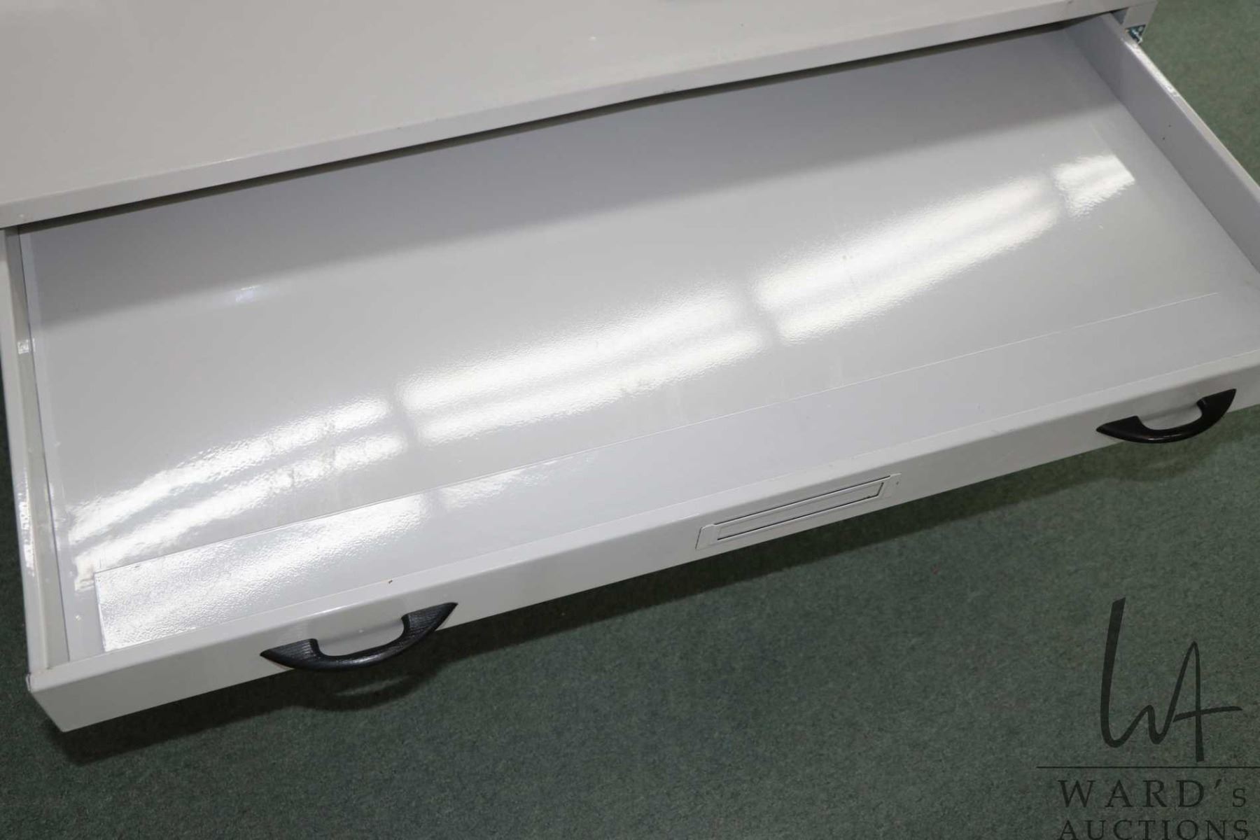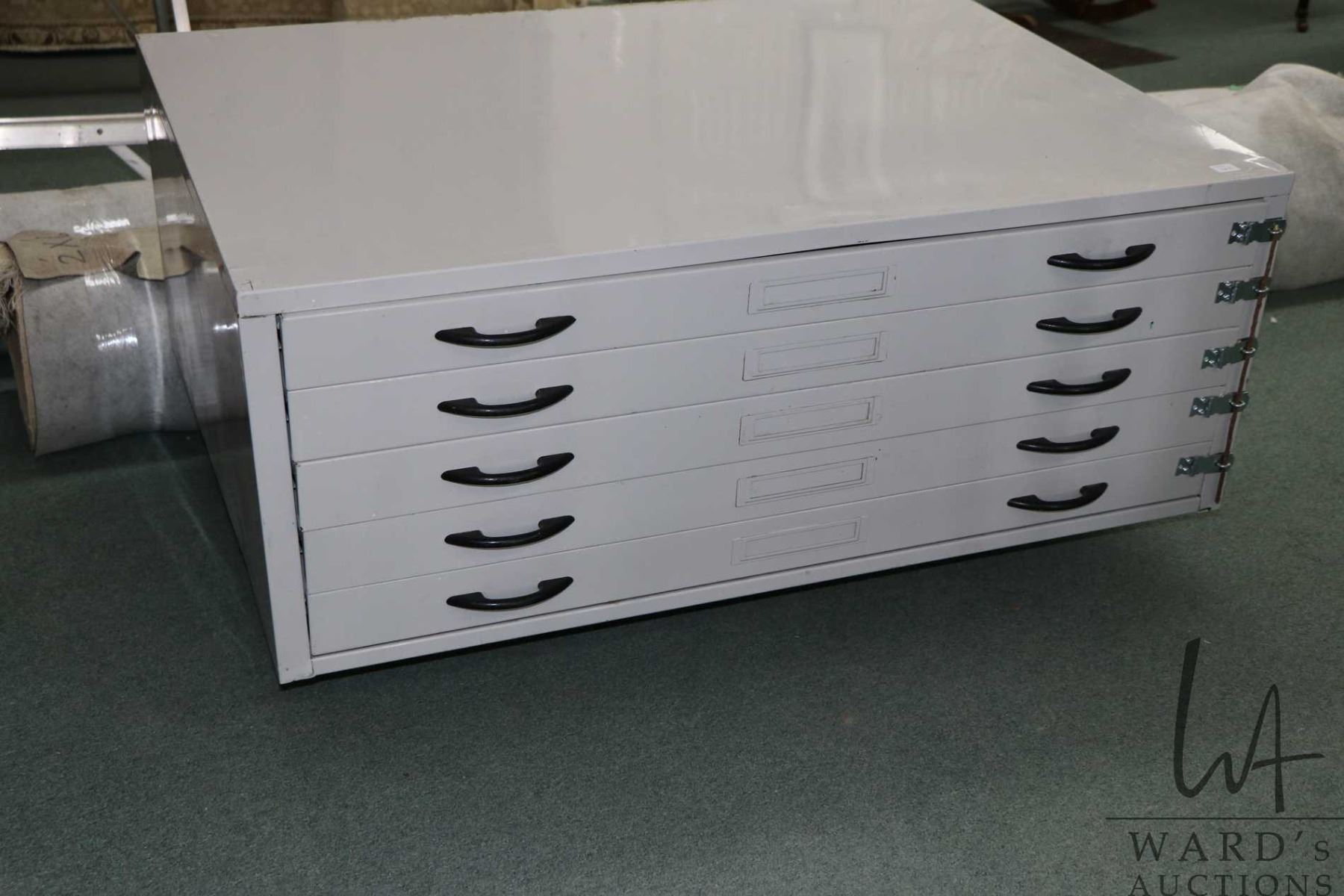 Five drawer metal plans/drawings cabinet. Overall dimensions 15" high, 41" wide and 21" deep.