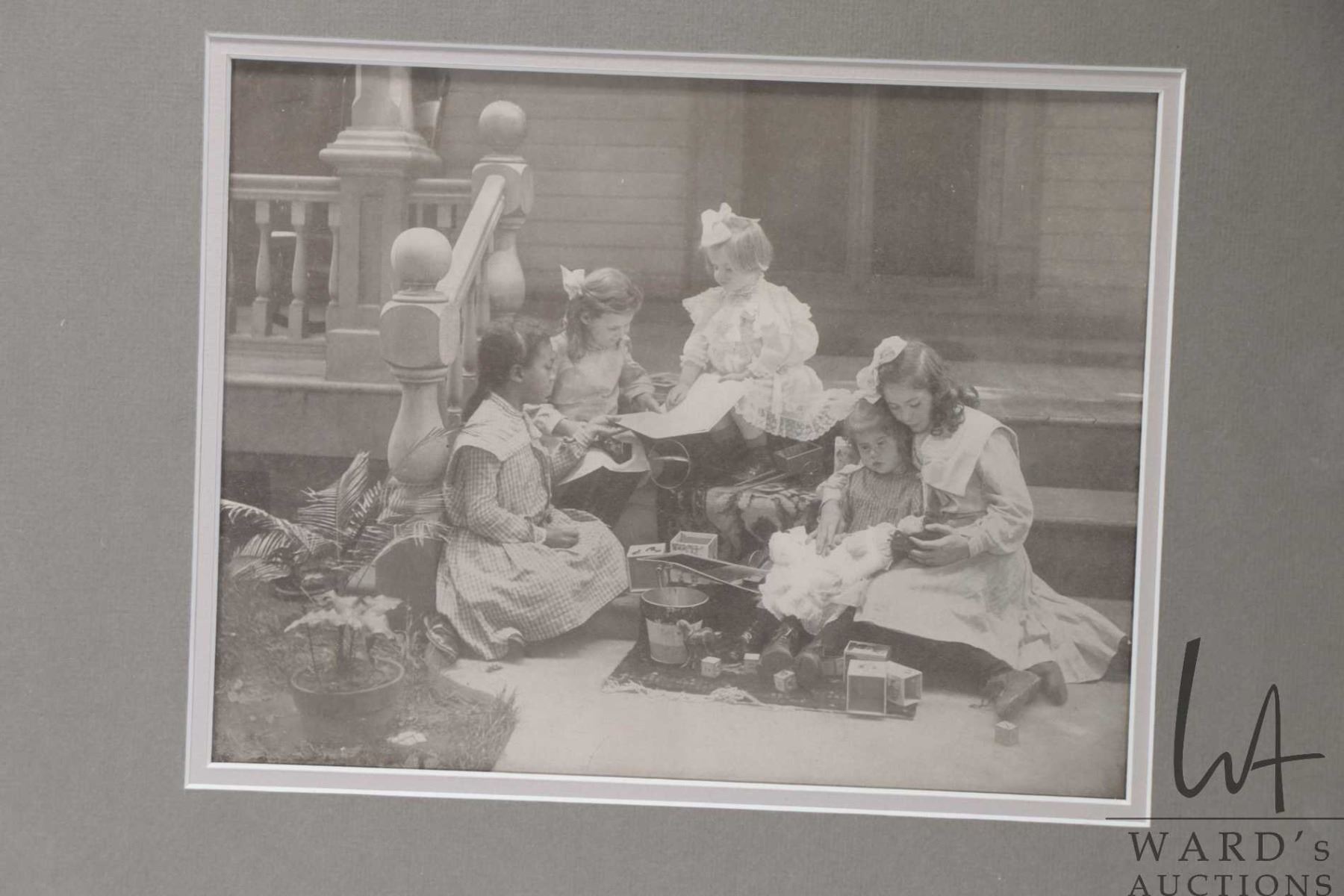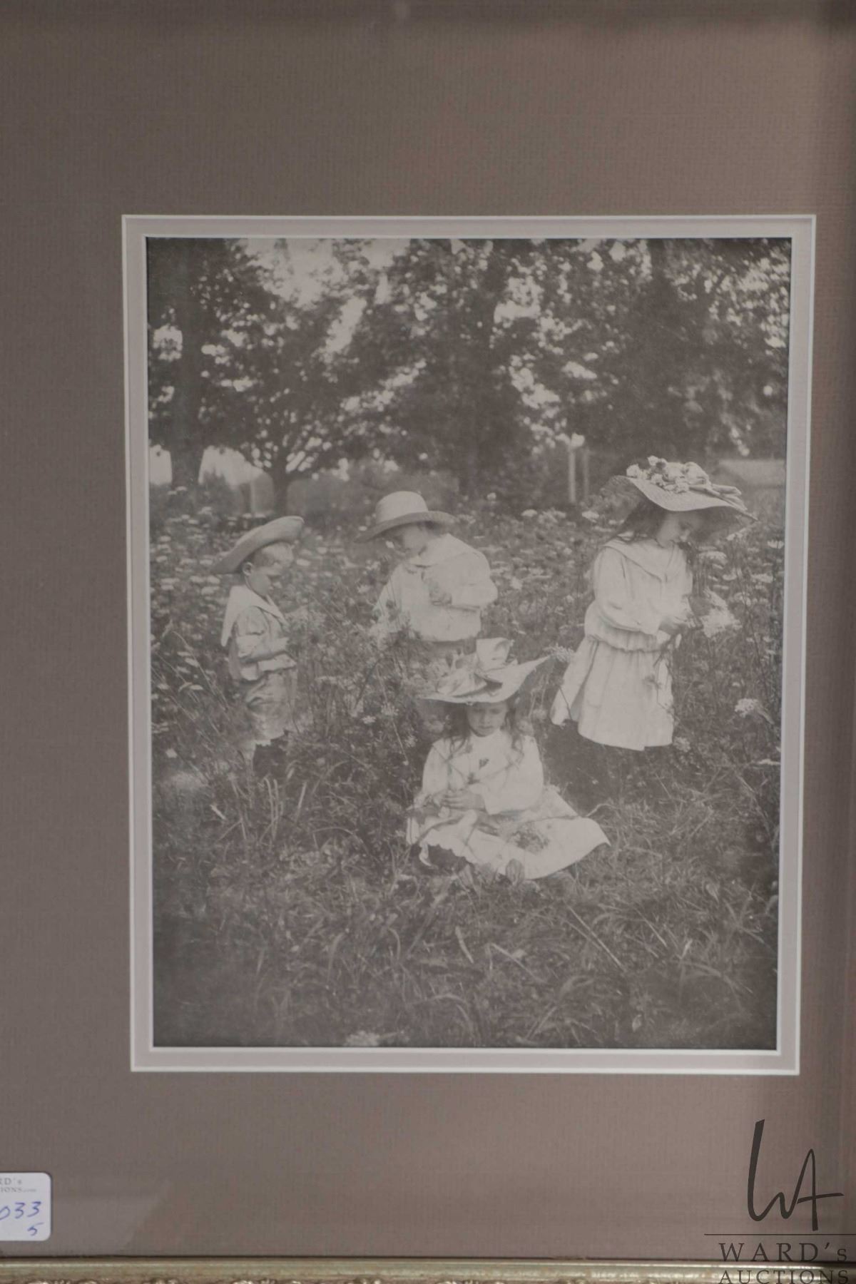 Five framed black and white photographs of children representing the Victorian era