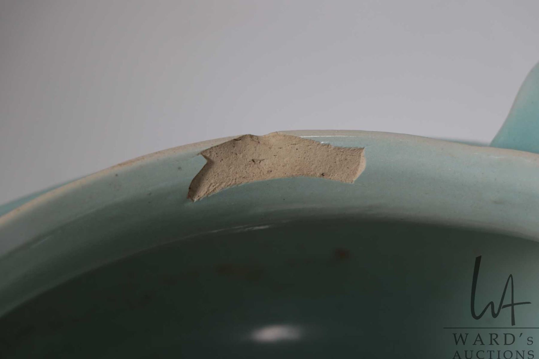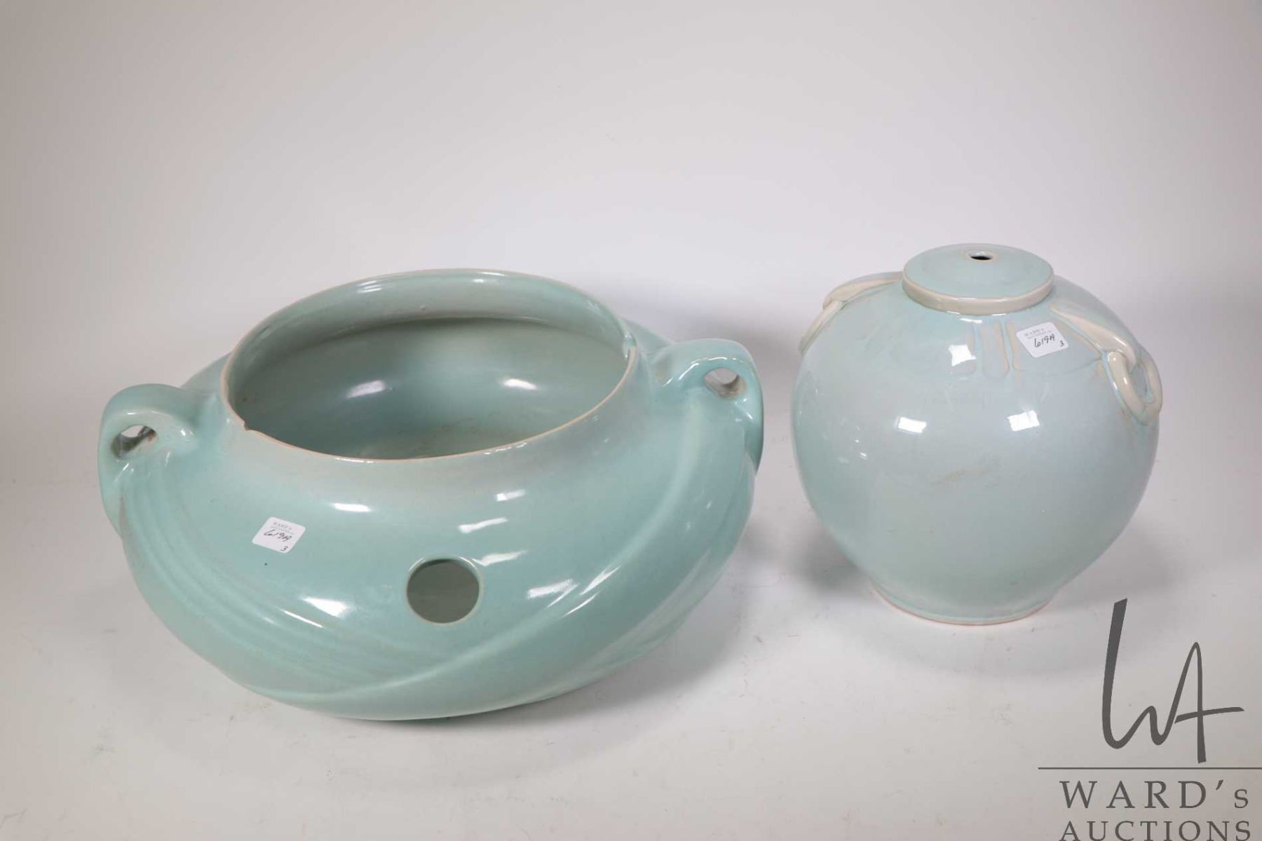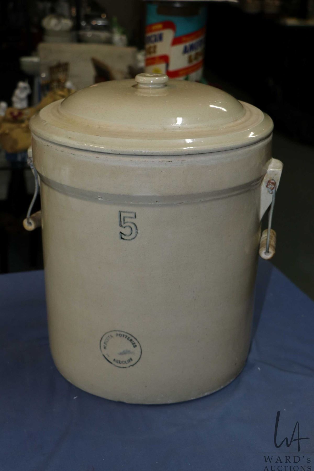 Five gallon, double handled and lidded Medalta crock, and a vintage Zanesville Pottery jardinere and a Celadon baluster style decorative vase