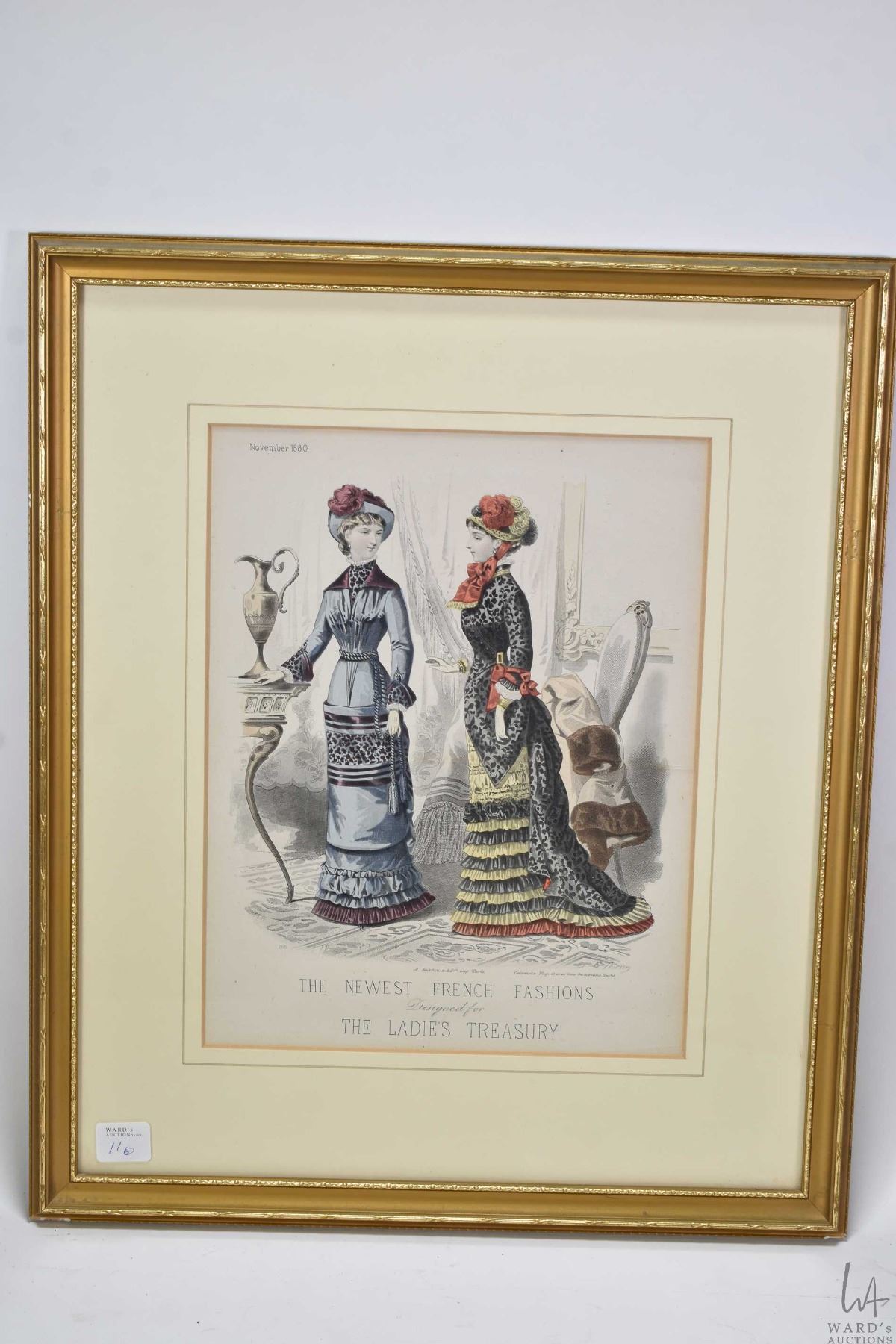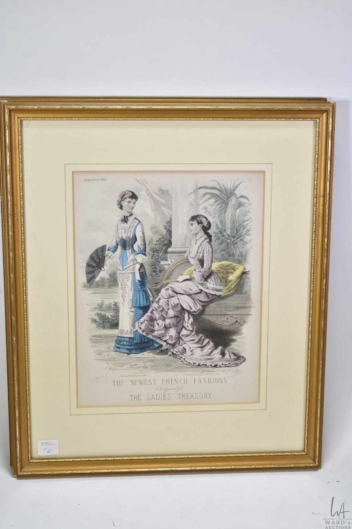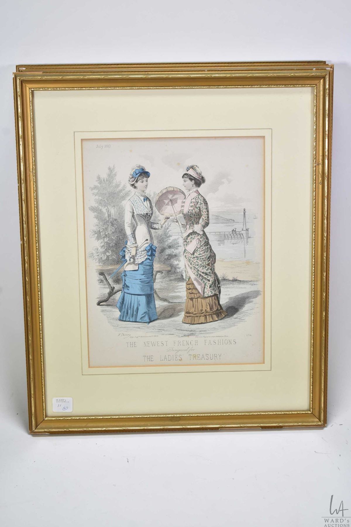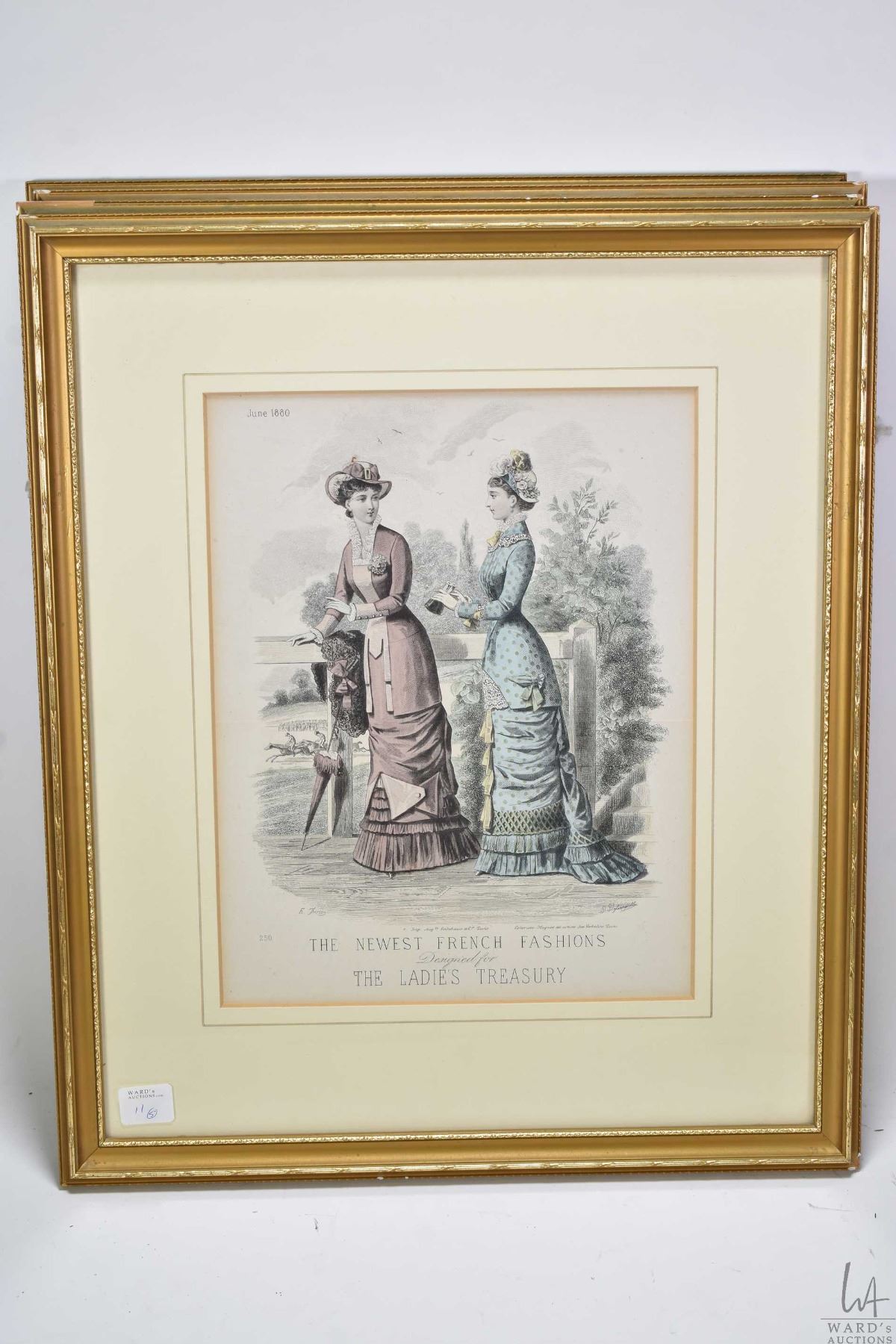 Five gilt framed coloured etchings from the Newest French Fashions Designed for the Ladies' Treasury, each from a different month in 1880