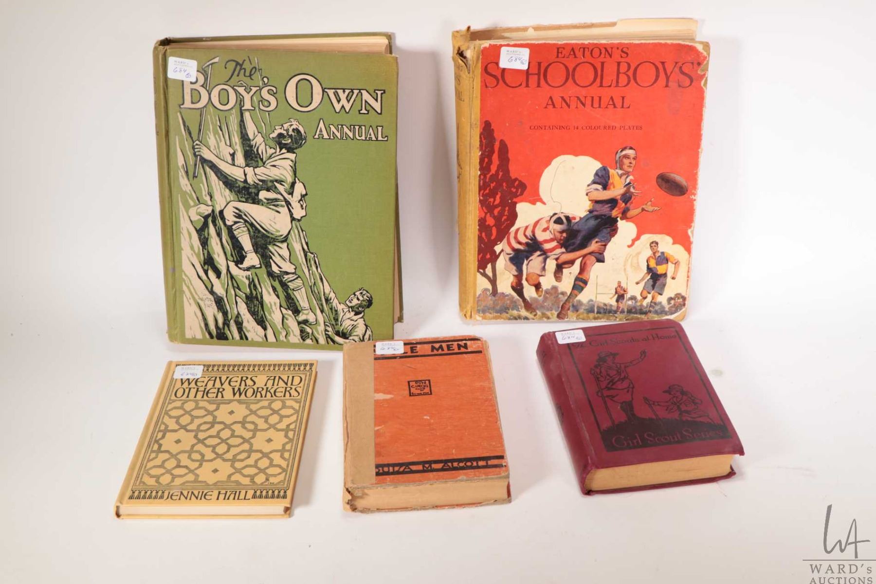 Five hardcover books including The Boy's Own Annual 1934-1935 ( Volume 57), Eaton's School Boys Annual circa 1930's, Little Men, The Girls Scouts at Home circa 1940's and Weavers and Other Workers circa 1930's