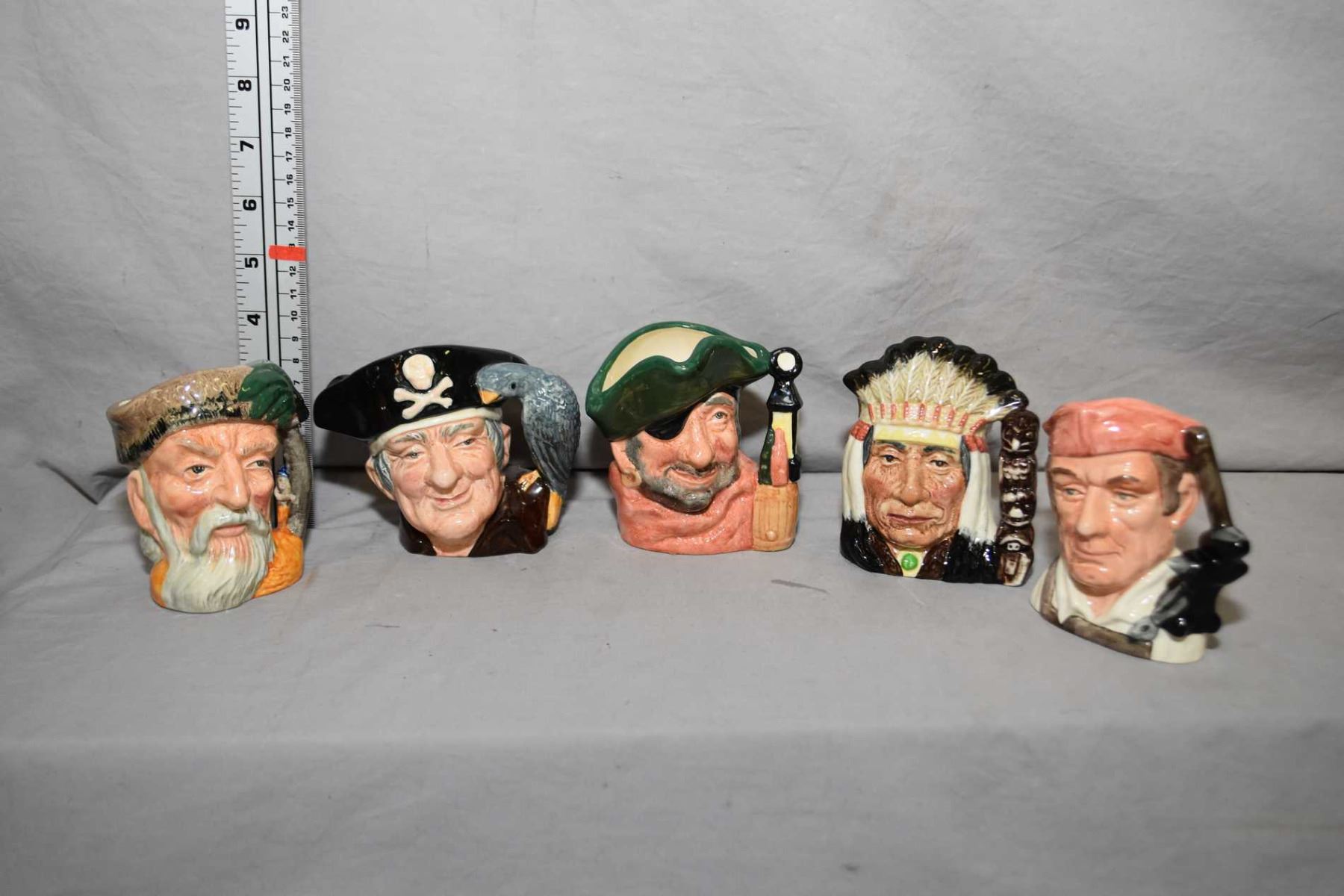Five medium sized Royal Doulton character jugs including Blacksmith D6578, Long John Silver D6386, North American Indian D6614, Smuggler D6619 and Robinson Crusoe D6539