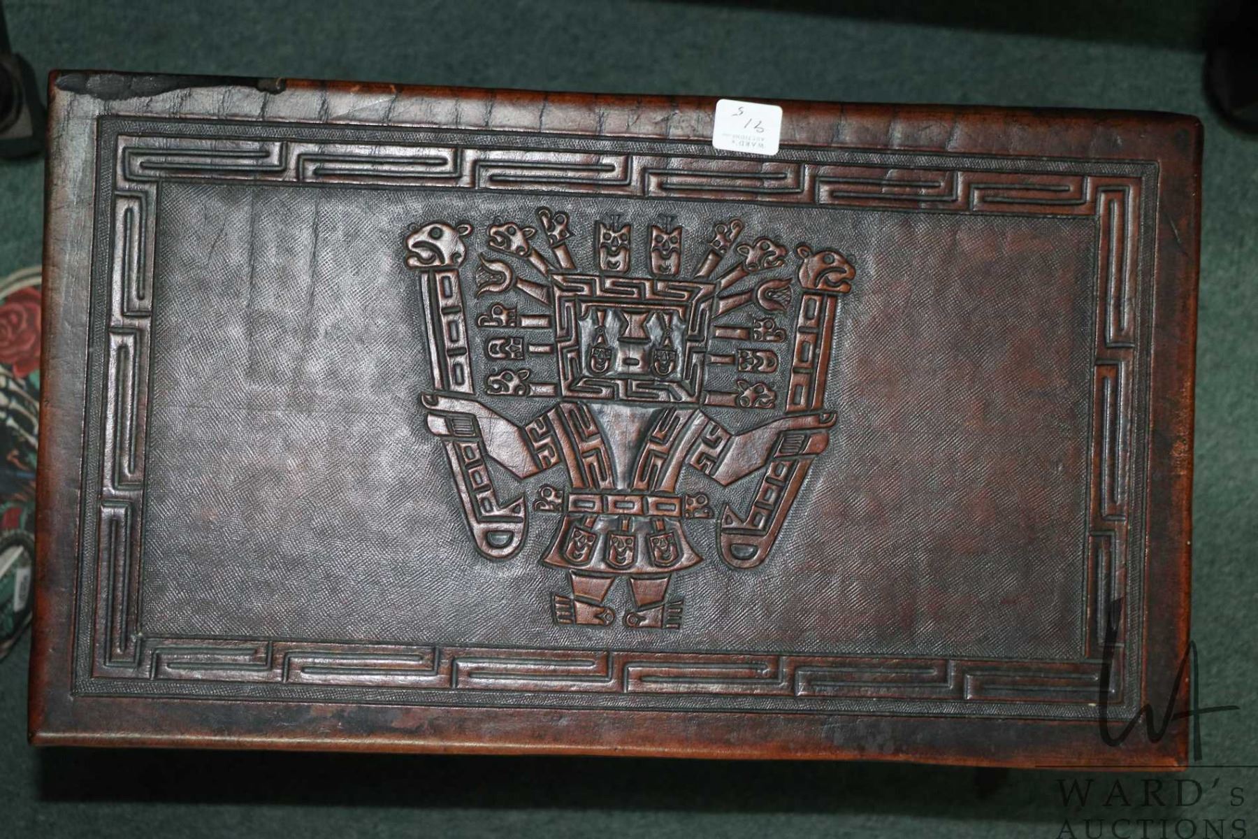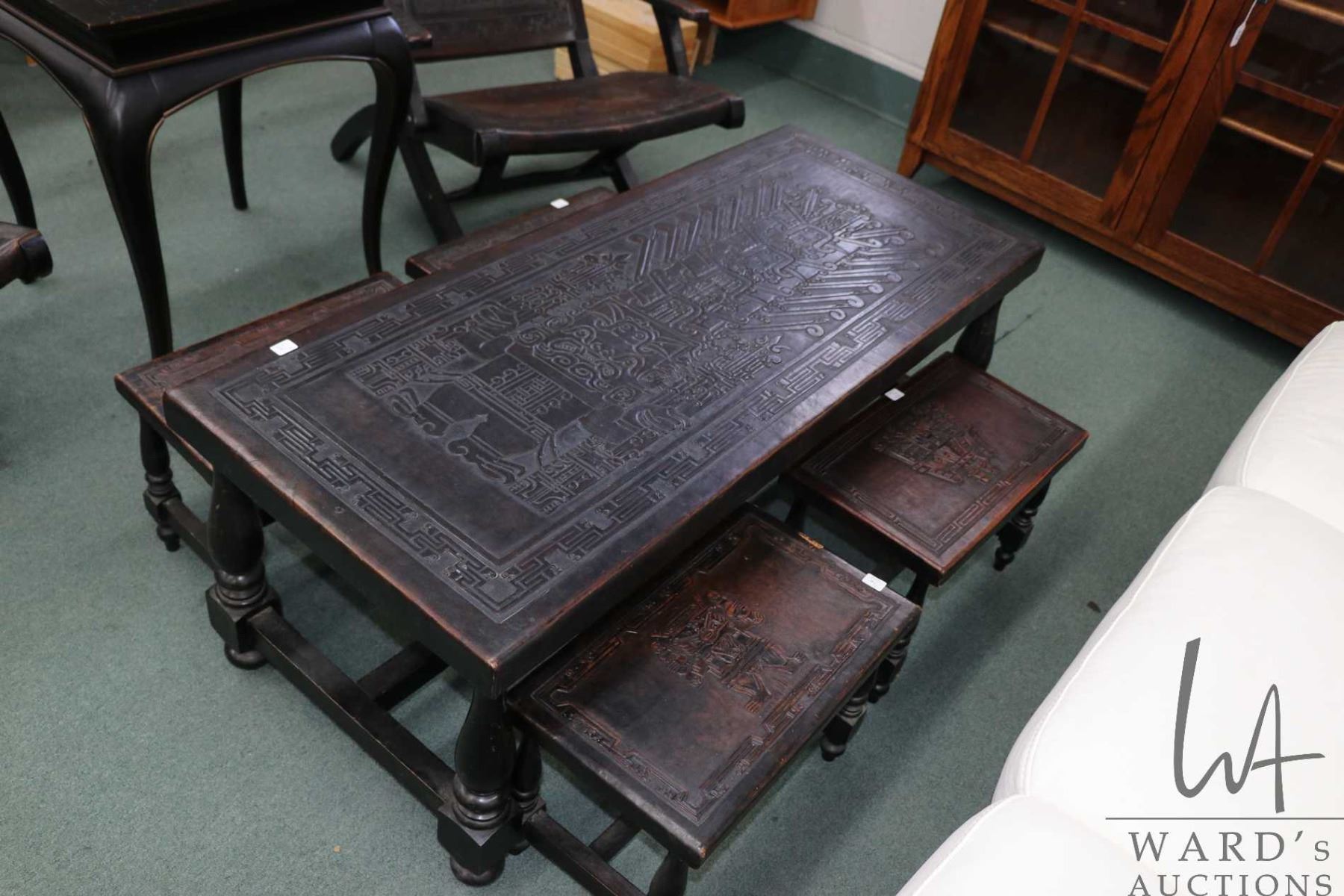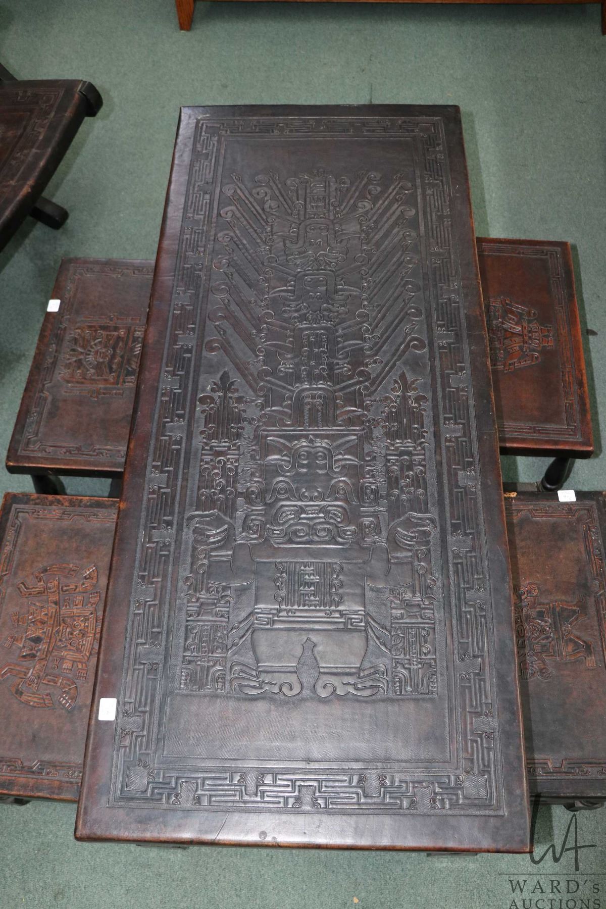 Five piece vintage Peruvian tooled leather and mohen wood table with four nesting stools, each with decorative spiritual imagery, circa 1940, 48" X 20" X 18" in height