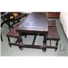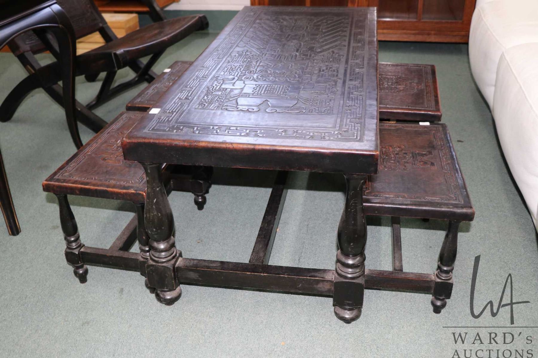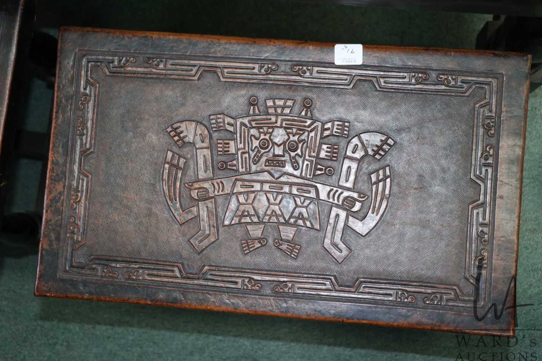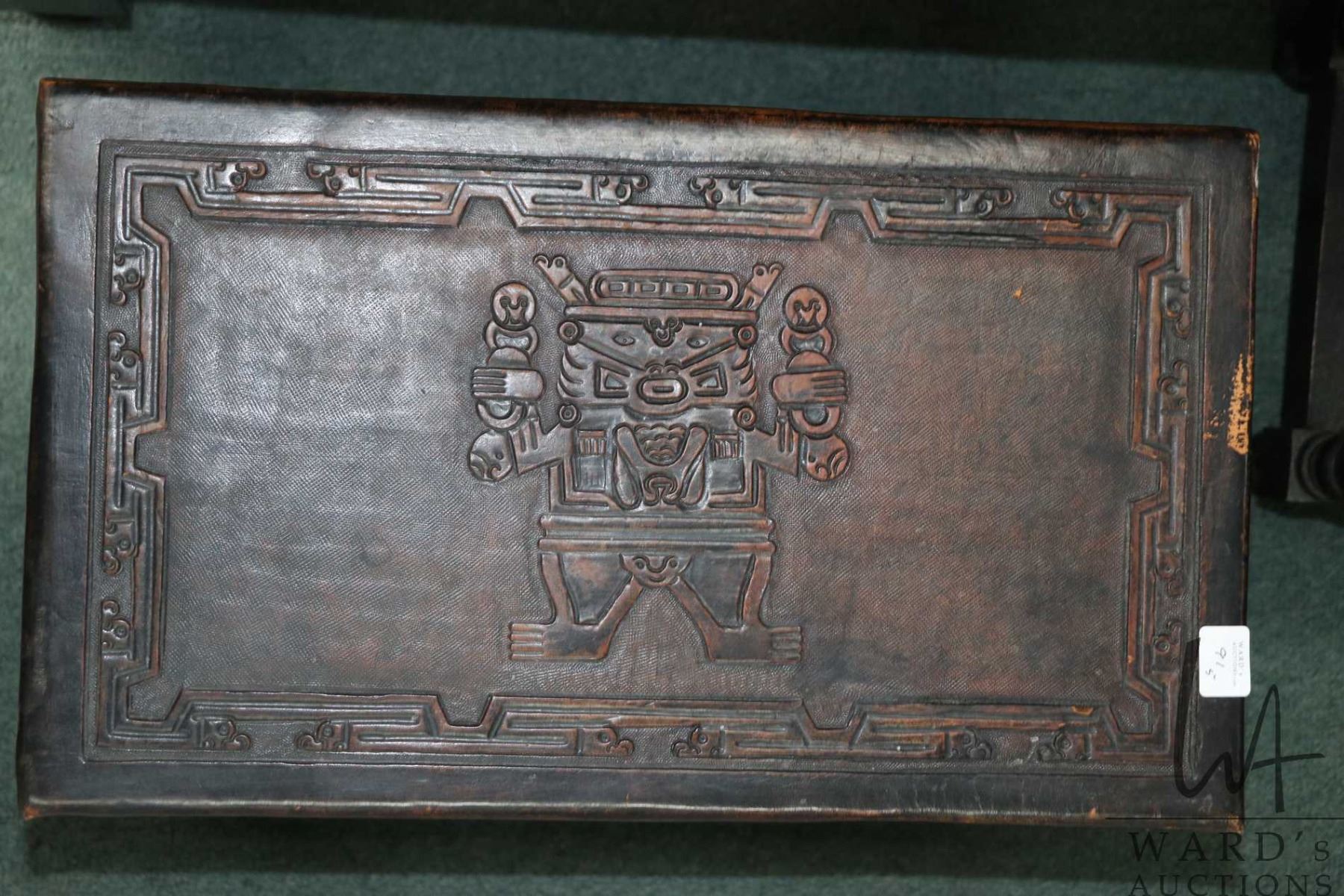 Five piece vintage Peruvian tooled leather and mohen wood table with four nesting stools, each with decorative spiritual imagery, circa 1940, 48" X 20" X 18" in height
