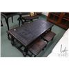 Five piece vintage Peruvian tooled leather and mohen wood table with four nesting stools, each with