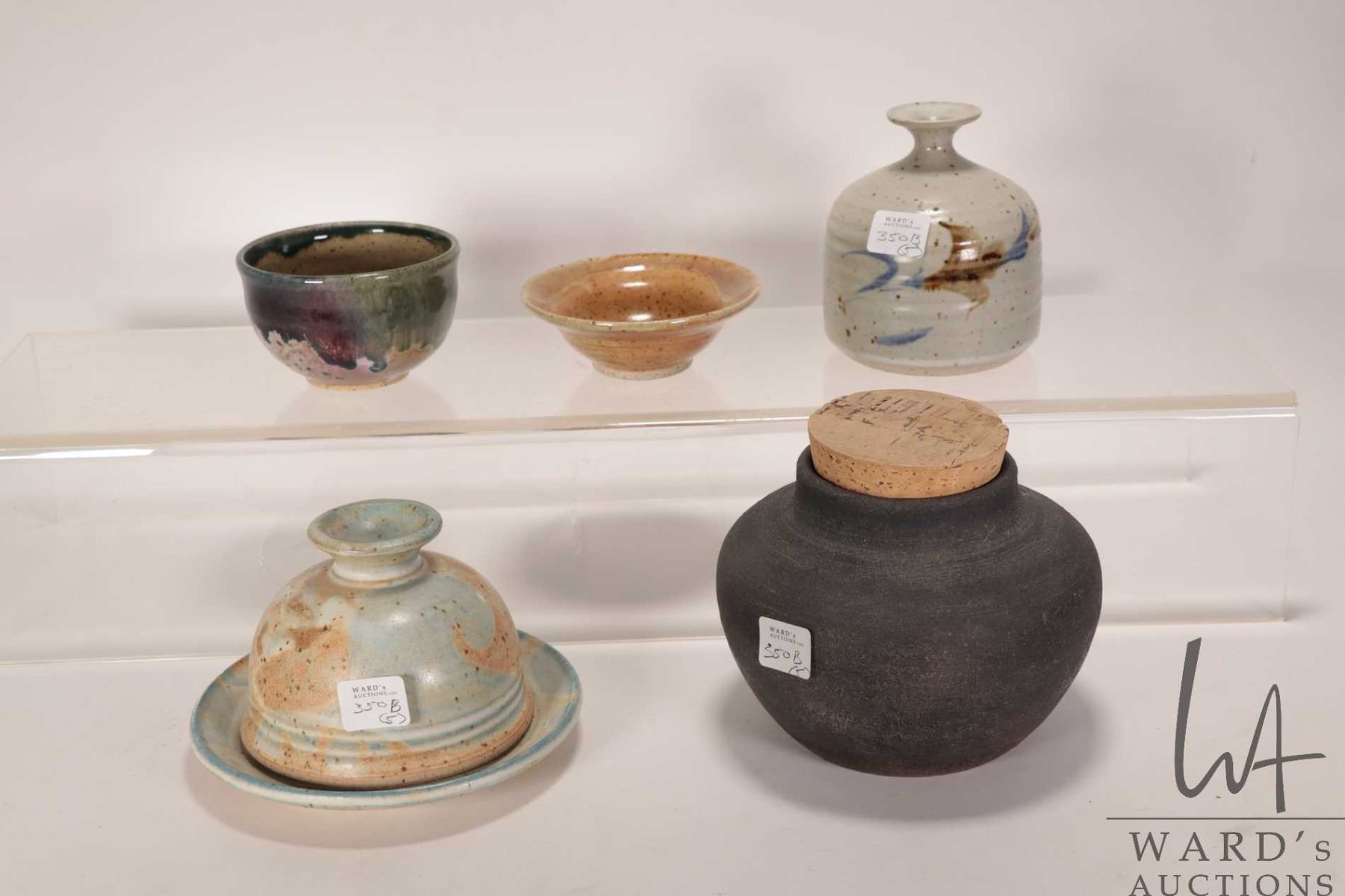 Five pieces of artisan pottery including lidded pot, bowls, bud vase, cheese dome etc.