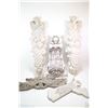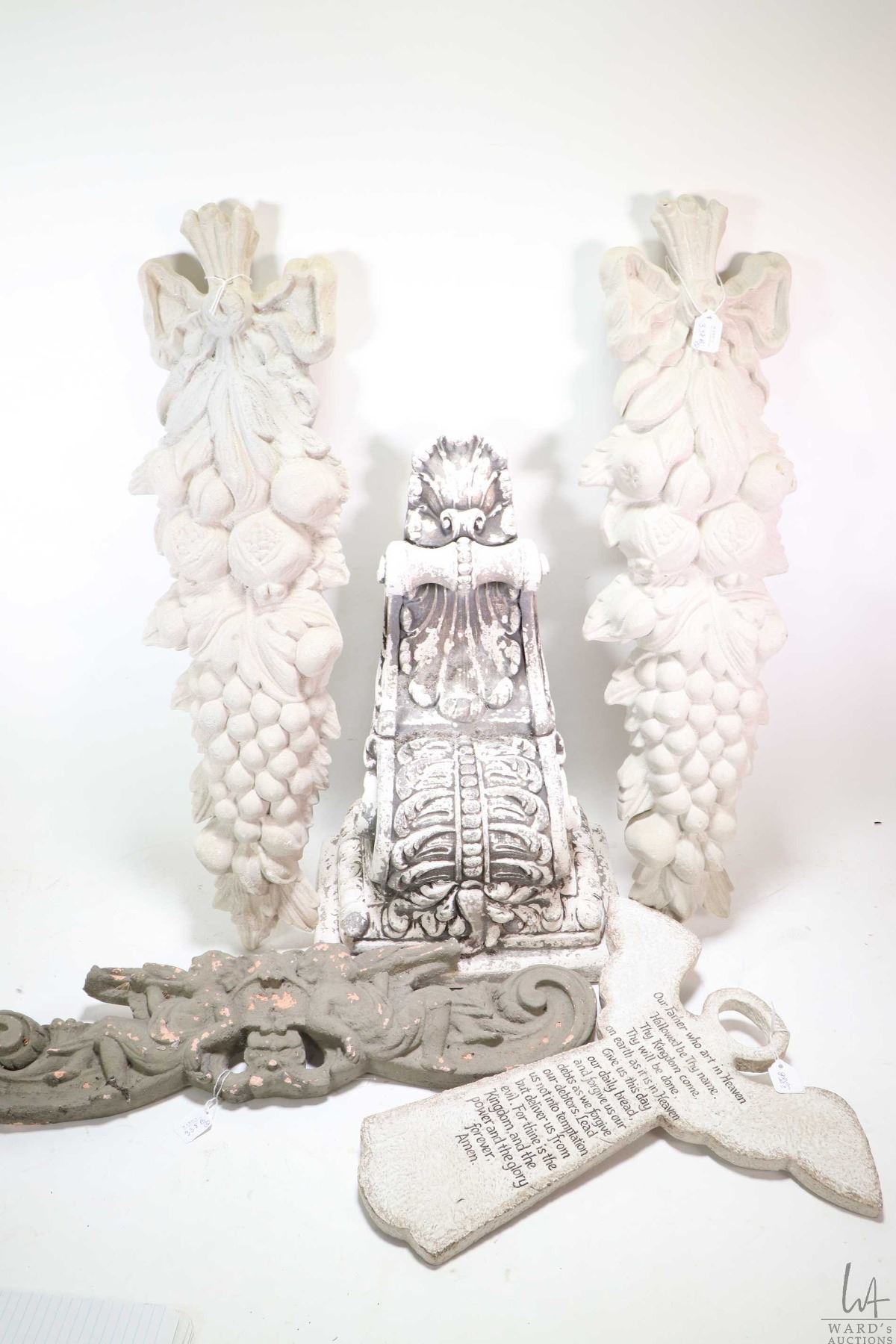 Five pieces of concrete garden decor including two fruit style plaques, angel with lords prayer and a corbel etc. Note: Not available for shipment. Local pickup only