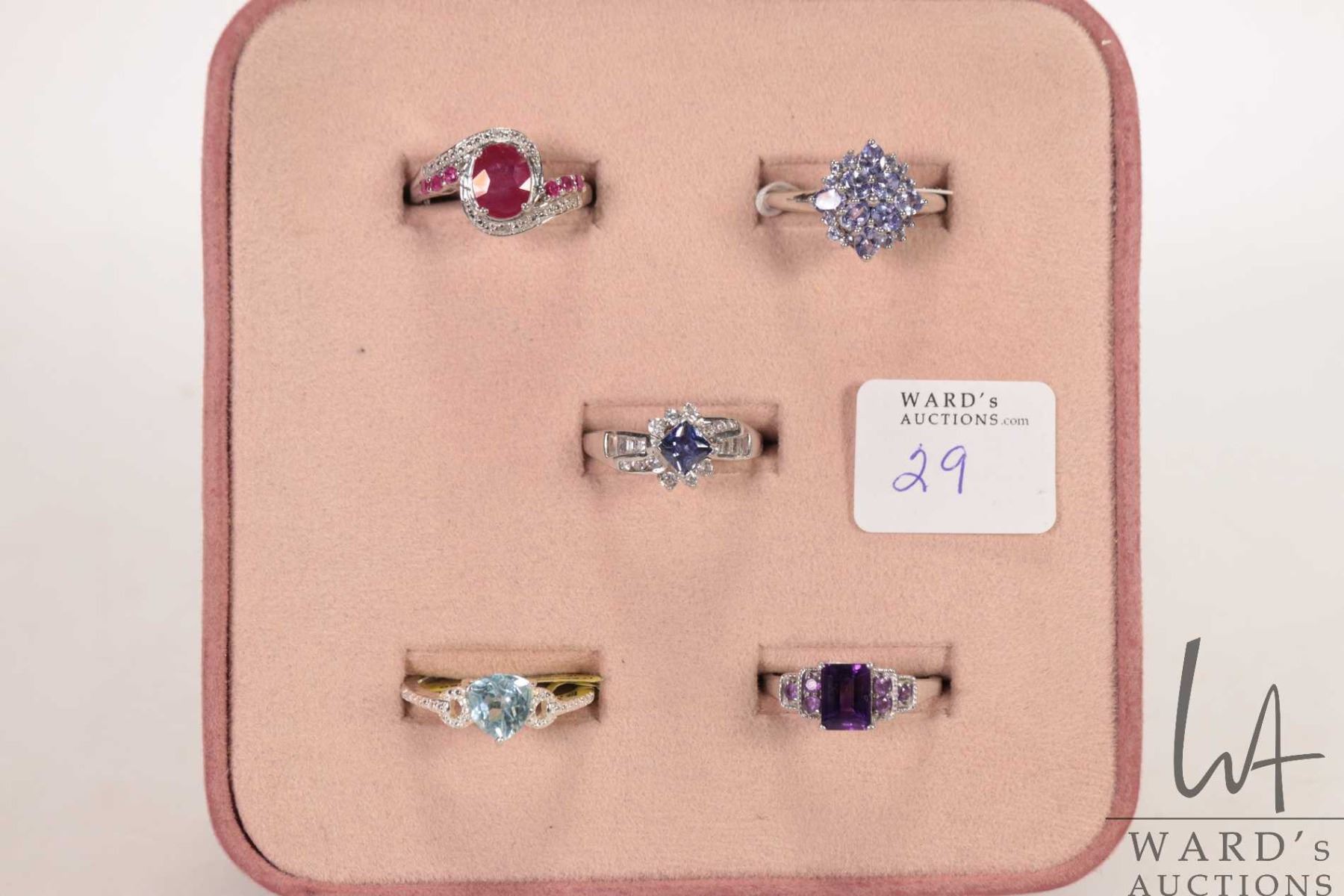 Five sterling silver rings, all with electronically tested gemstones, four size 10 and one 9.25