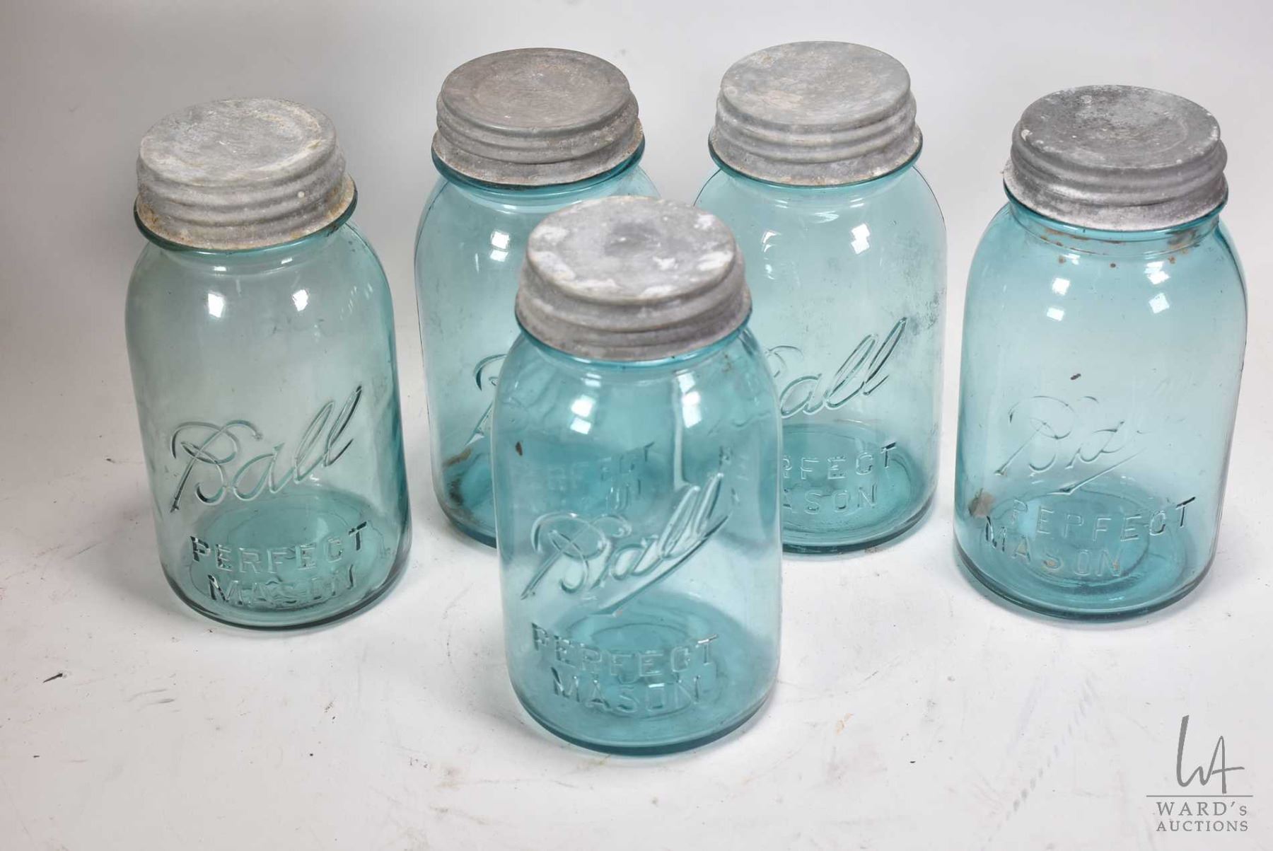 Five vintage Ball Perfect Mason sealing jars with original zink lids lined with milk glass