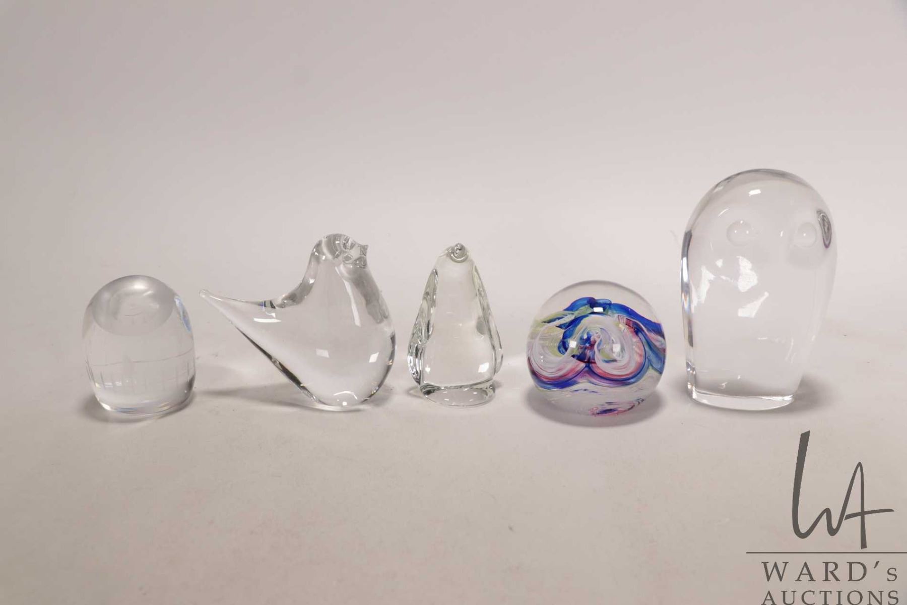 Five vintage decorative glass paperweights including Selkirkglass with colourful swirls, Goebel owl