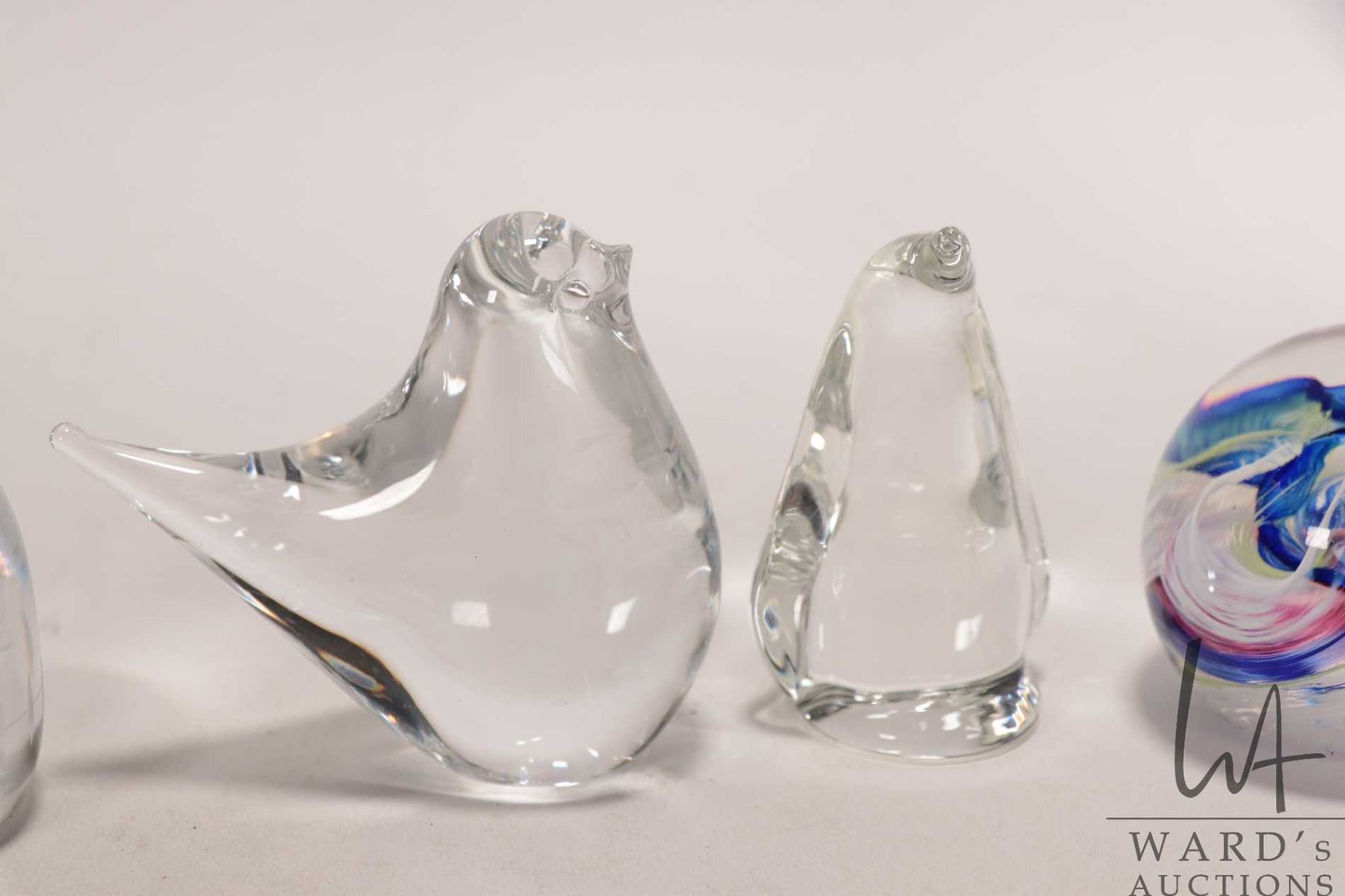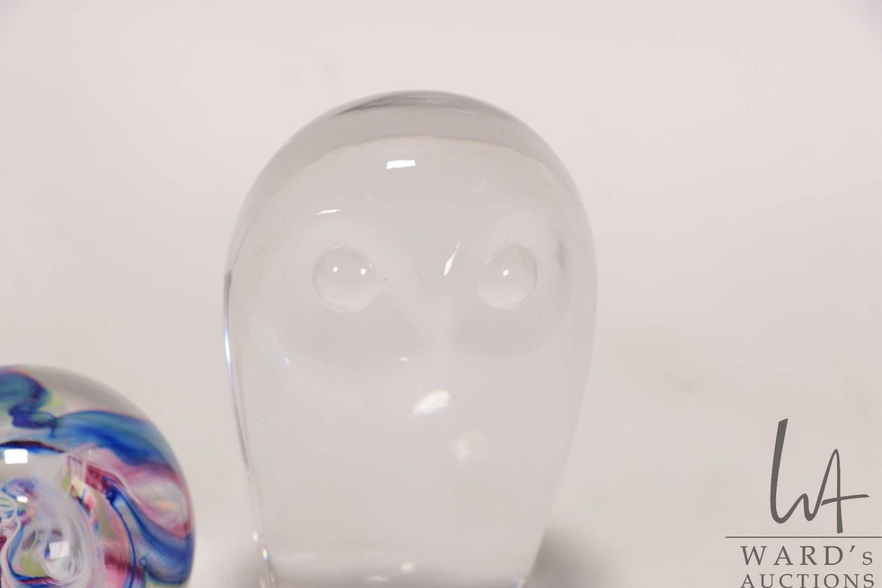 Five vintage decorative glass paperweights including Selkirkglass with colourful swirls, Goebel owl etc.