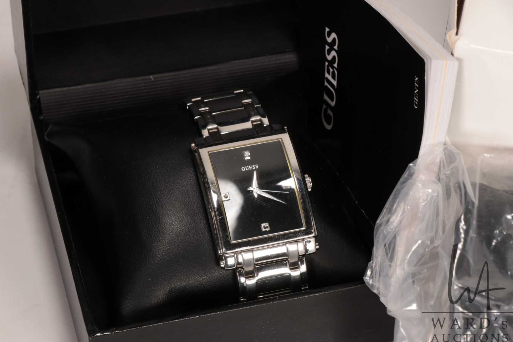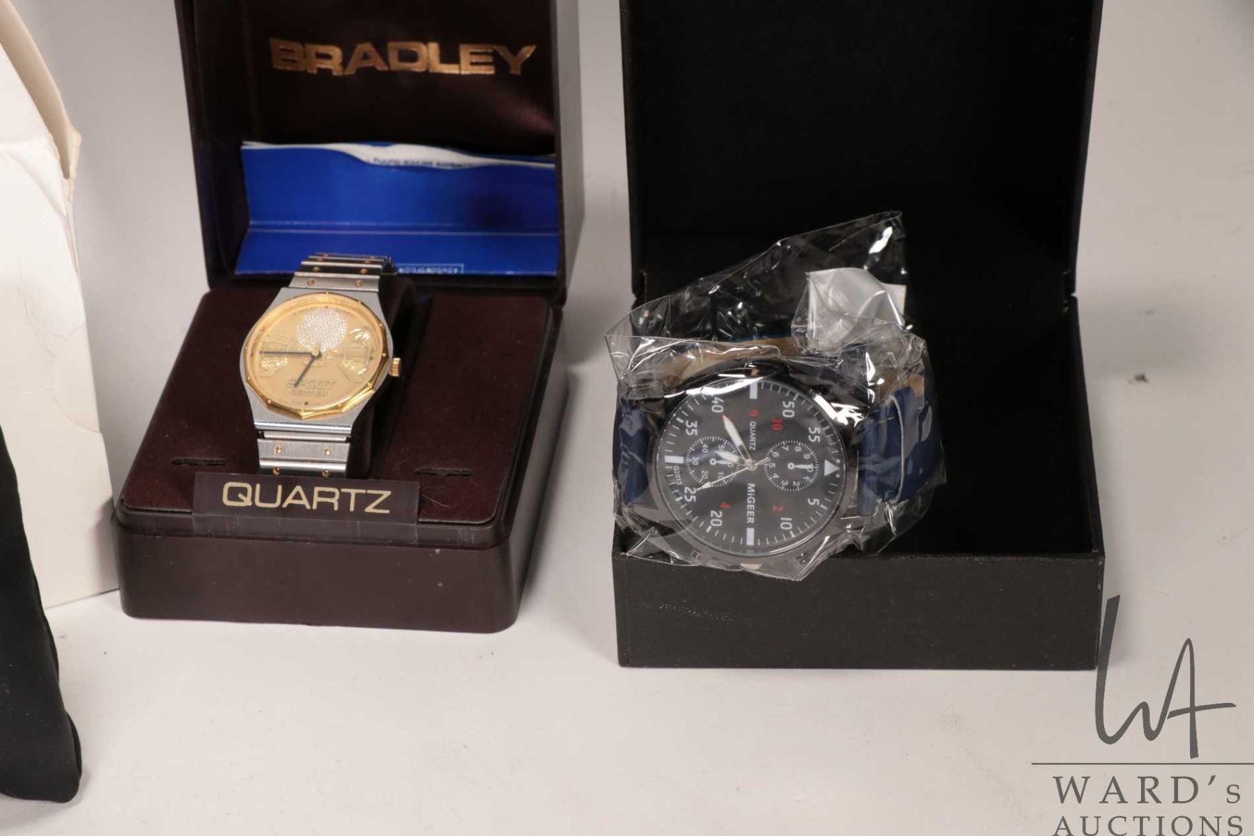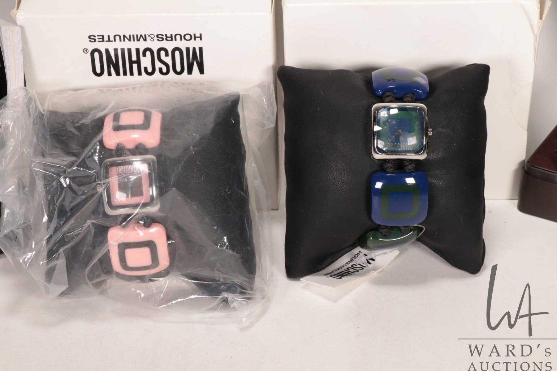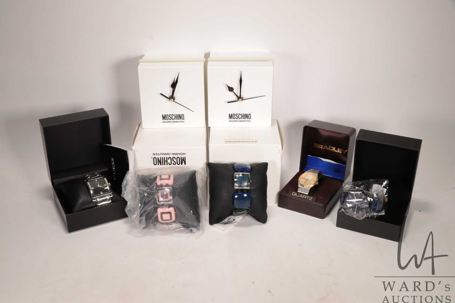 Five wrist watches including two Moschino "Hours & Minutes", Bradley "Epcot Center", Guess etc.