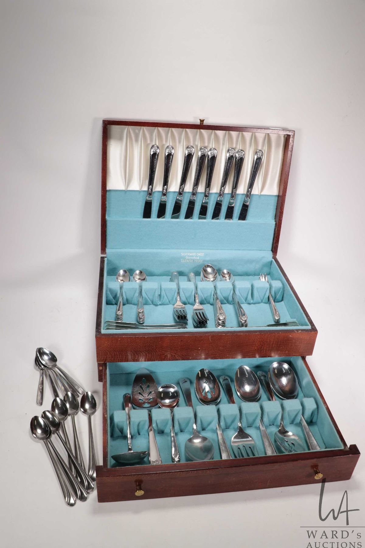 Flatware chest containing a selection of American made Estate "Whispering Hope" stainless steel flatware including eight each of 8 1/2" knives, 7 1/2" spoons, 7 1/2" parfait spoon, 7 1/2" fork, 6 1/2" fork, 6" spreader, 5 1/2" fork plus sixteen 6" teaspoons, and ten serving pieces plus a selection of non-matching spoons