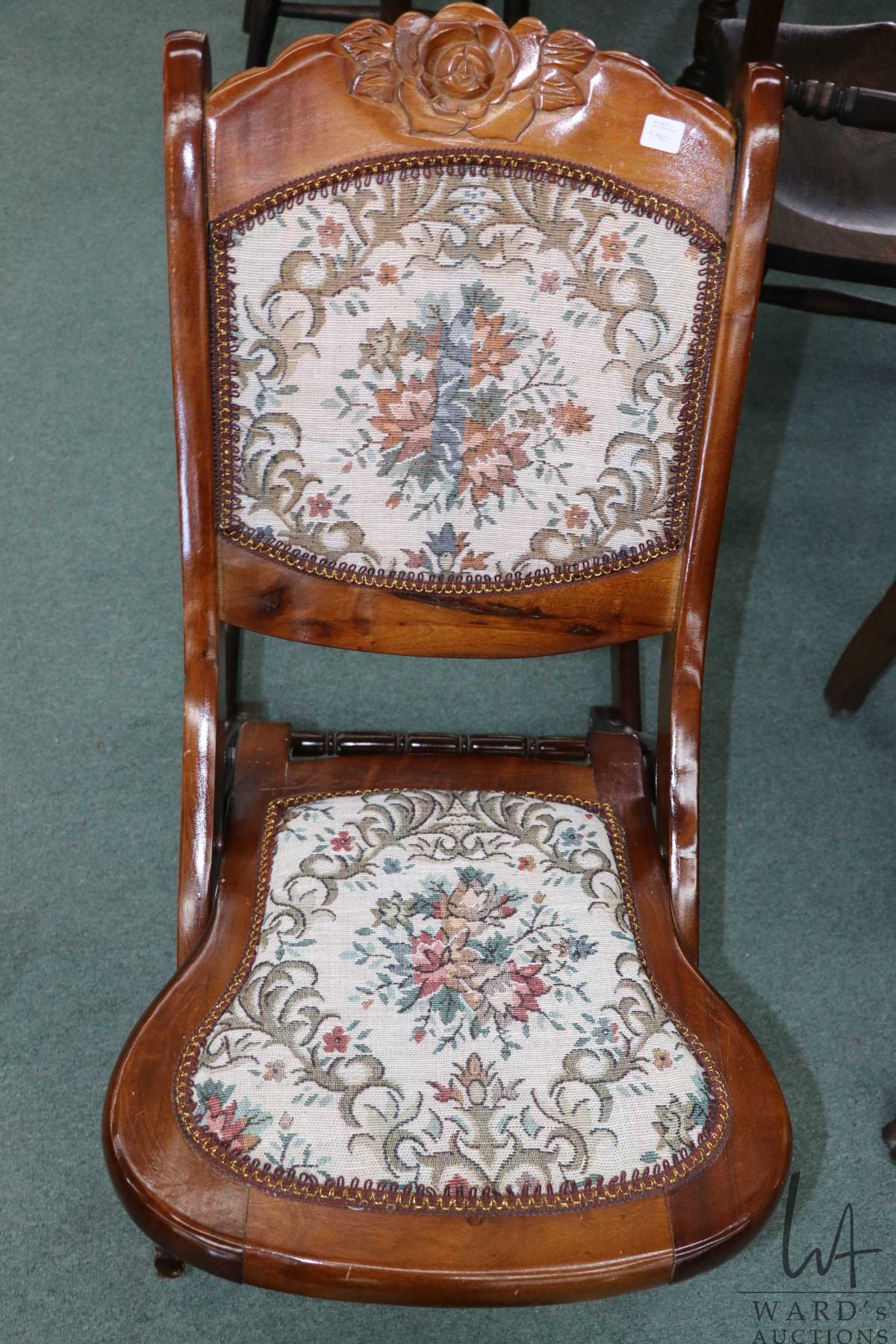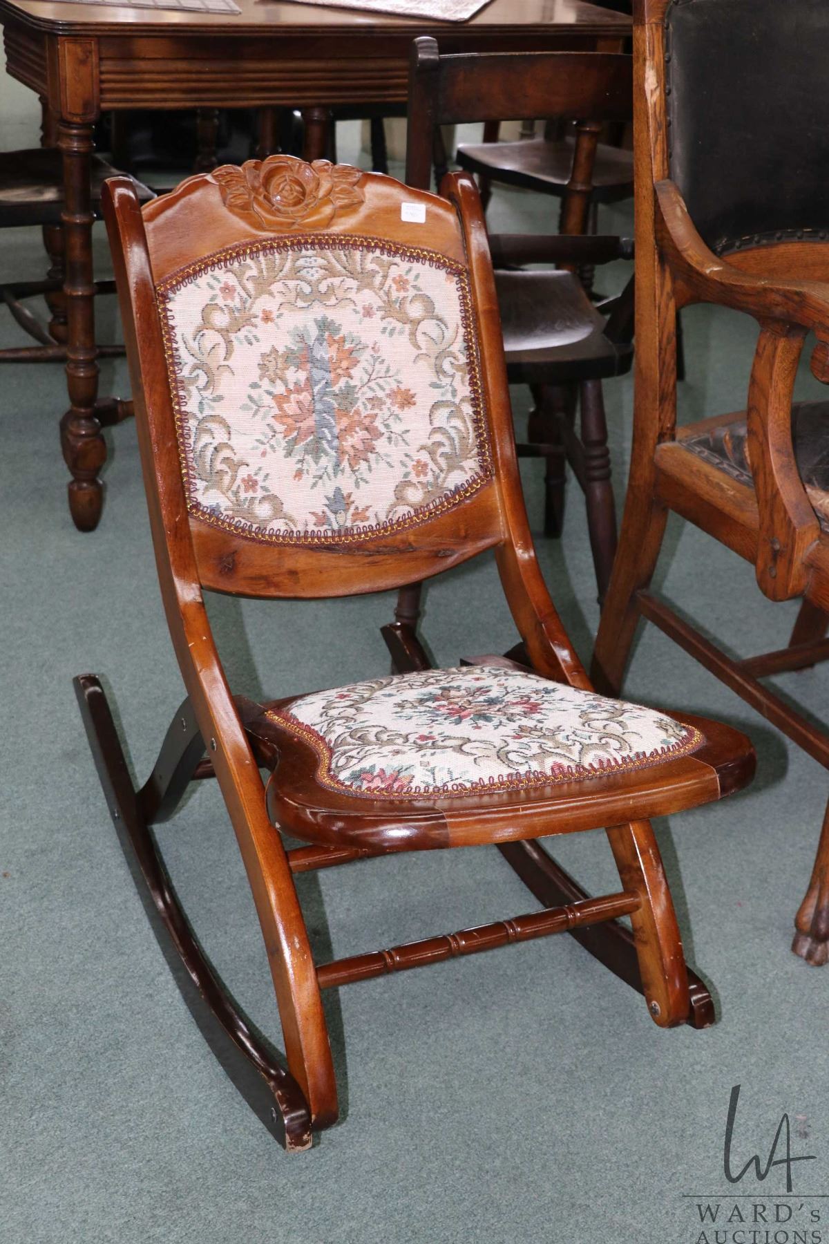 Folding nursing rocker with carved back and tapestry upholstered seat and back