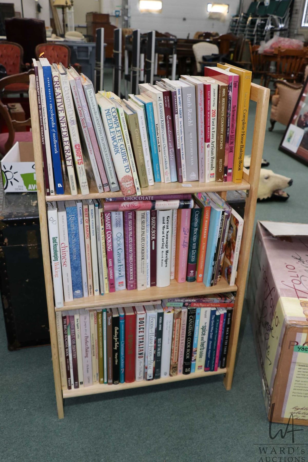 Folding three tier blonde wooden bookcase with a large selection of cookery books and some needlecra
