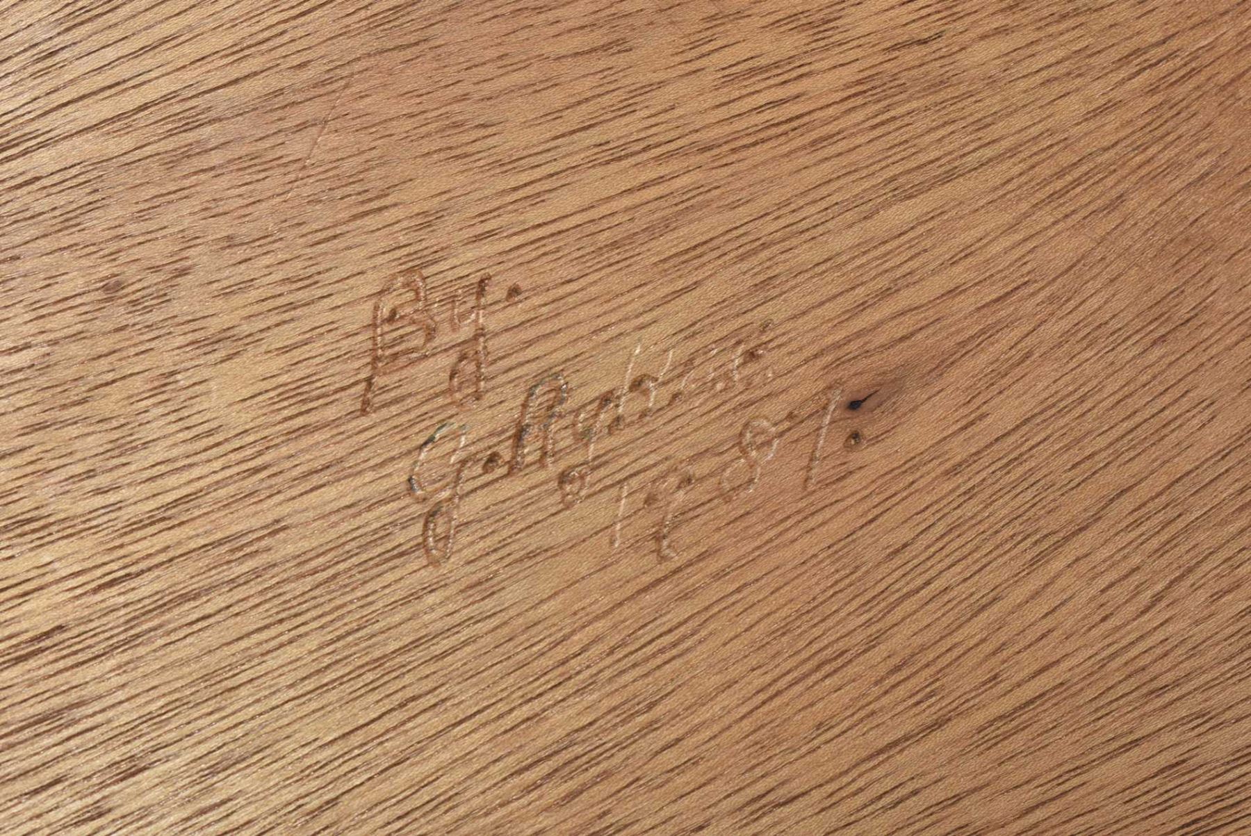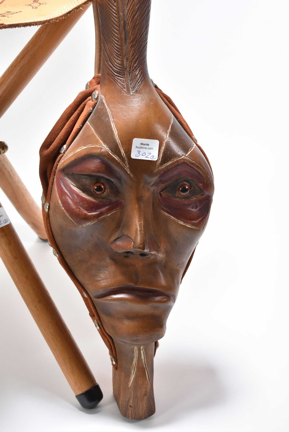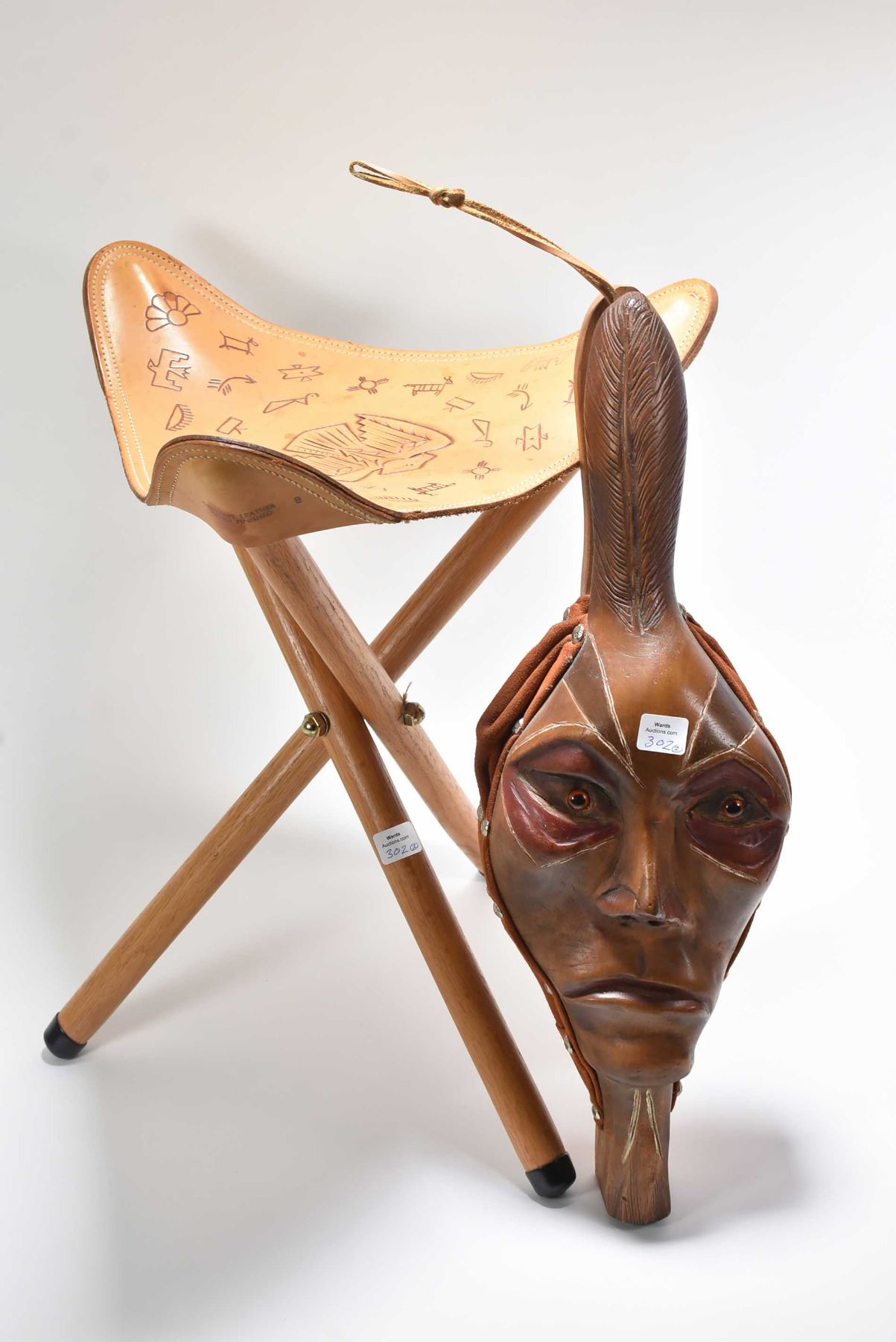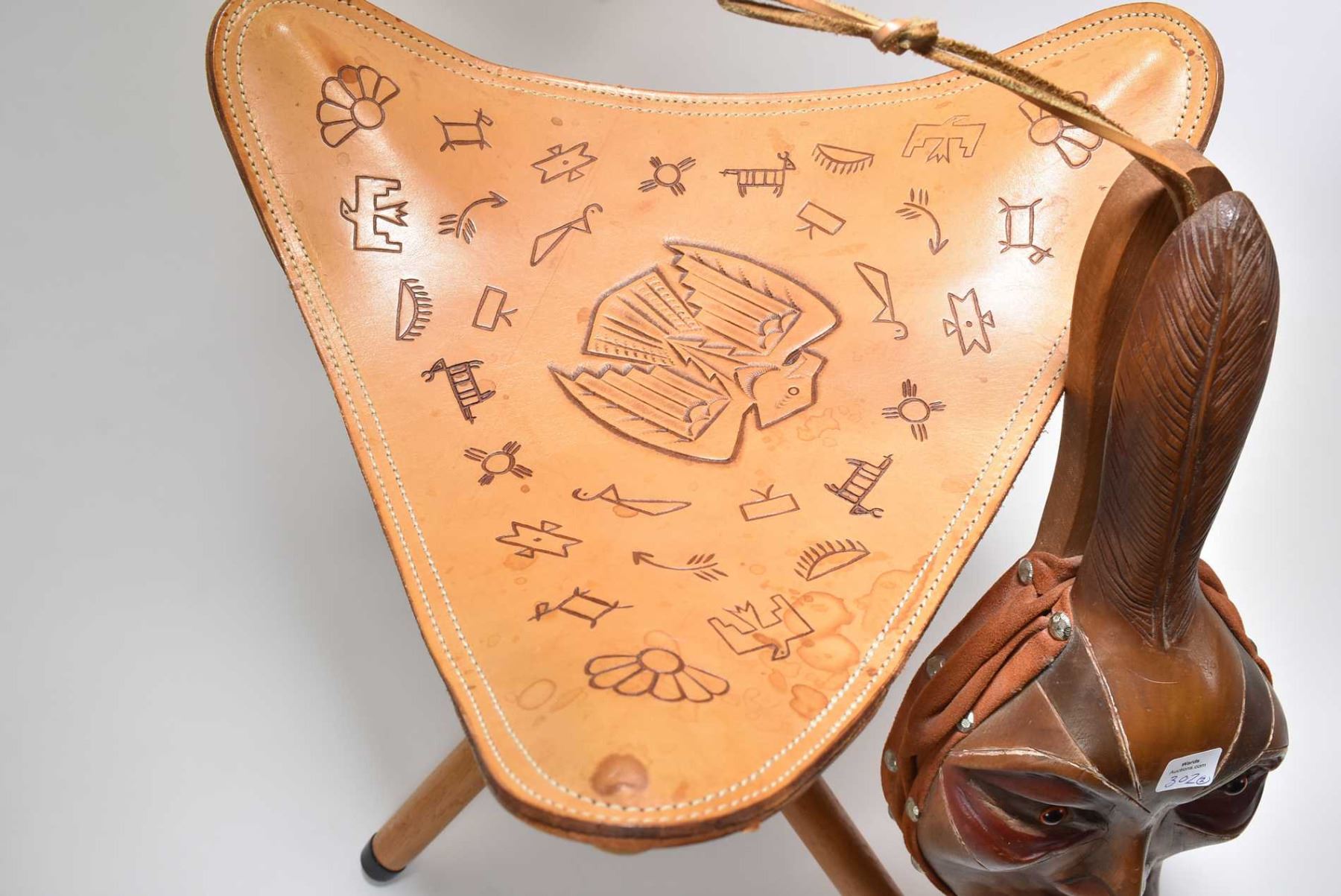 Folk art carved face bellows signed by artist and a three legged tooled leather stool from The Western Shop, Banff Canada